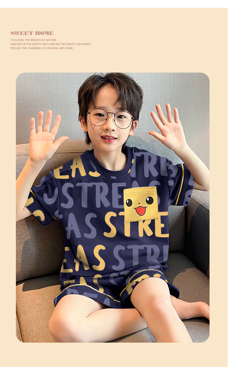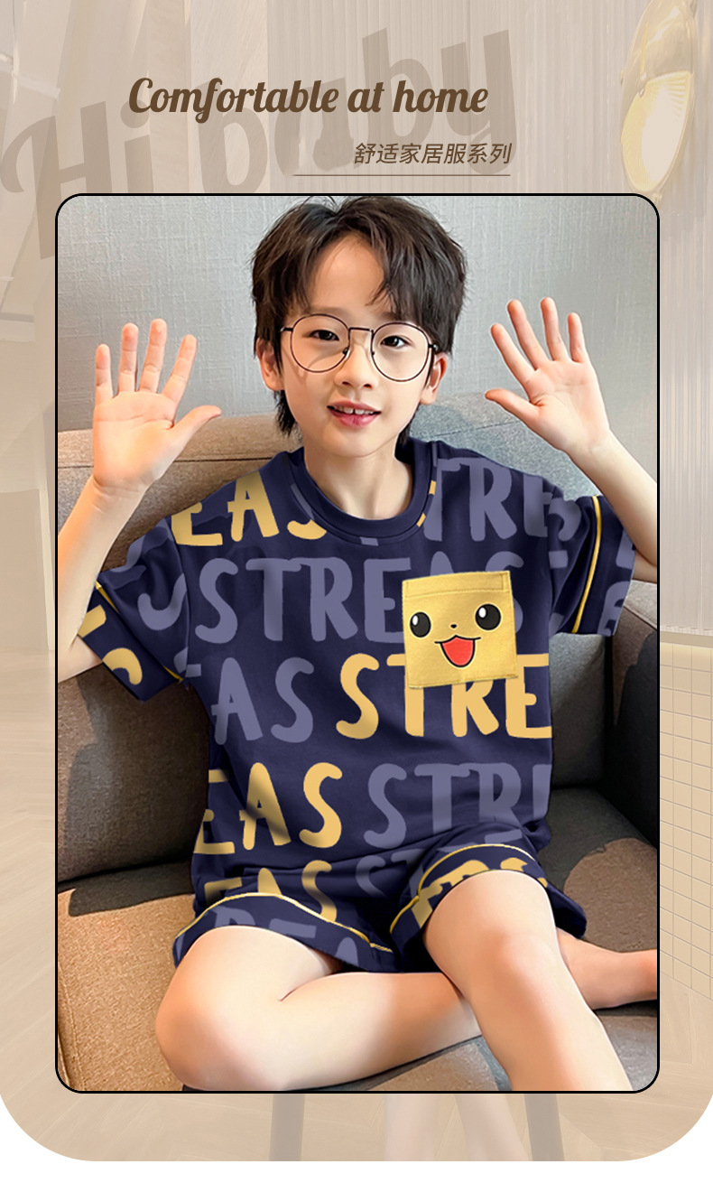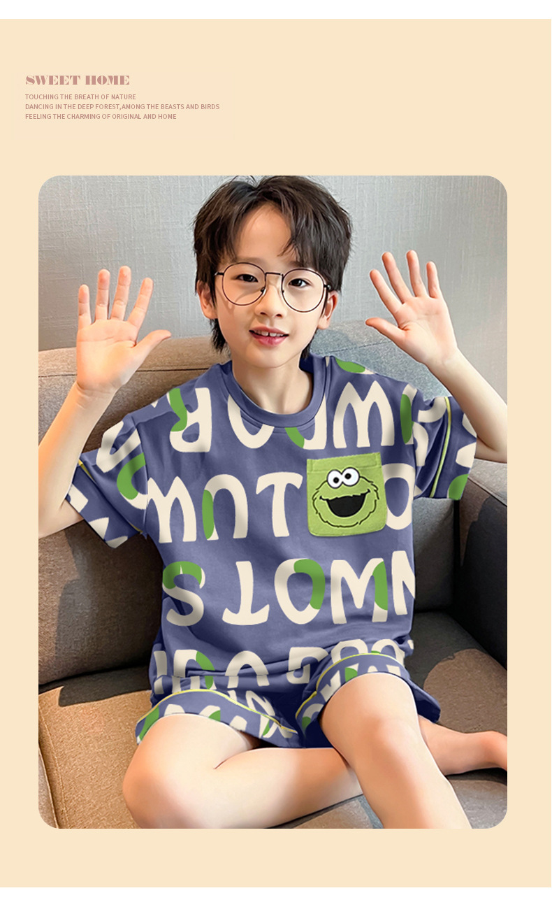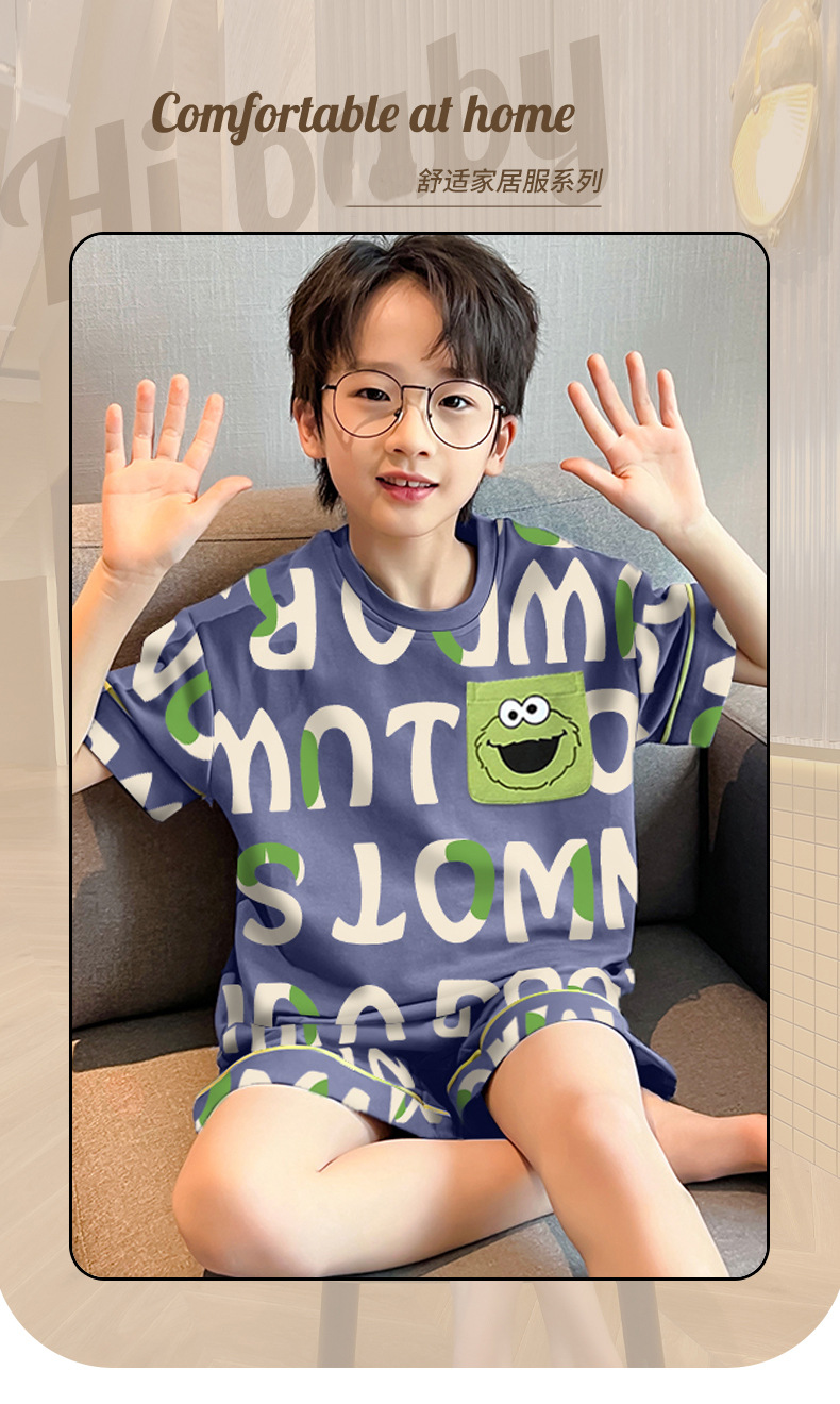 어린이 잠옷 여름 중대형 어린이 및 학생을위한 얇은 반팔 반바지 아기 소년 한국식 만화 홈 의류 세트