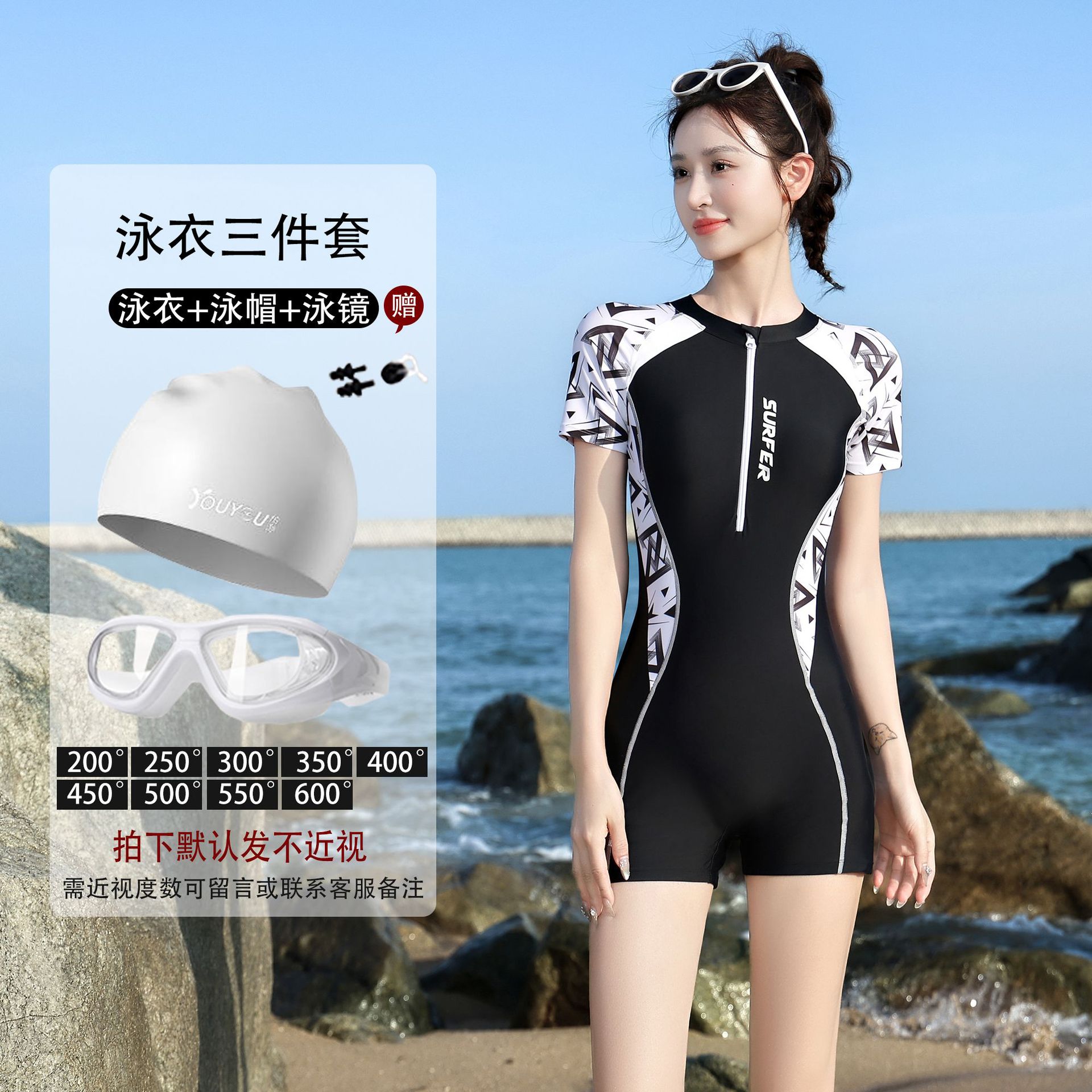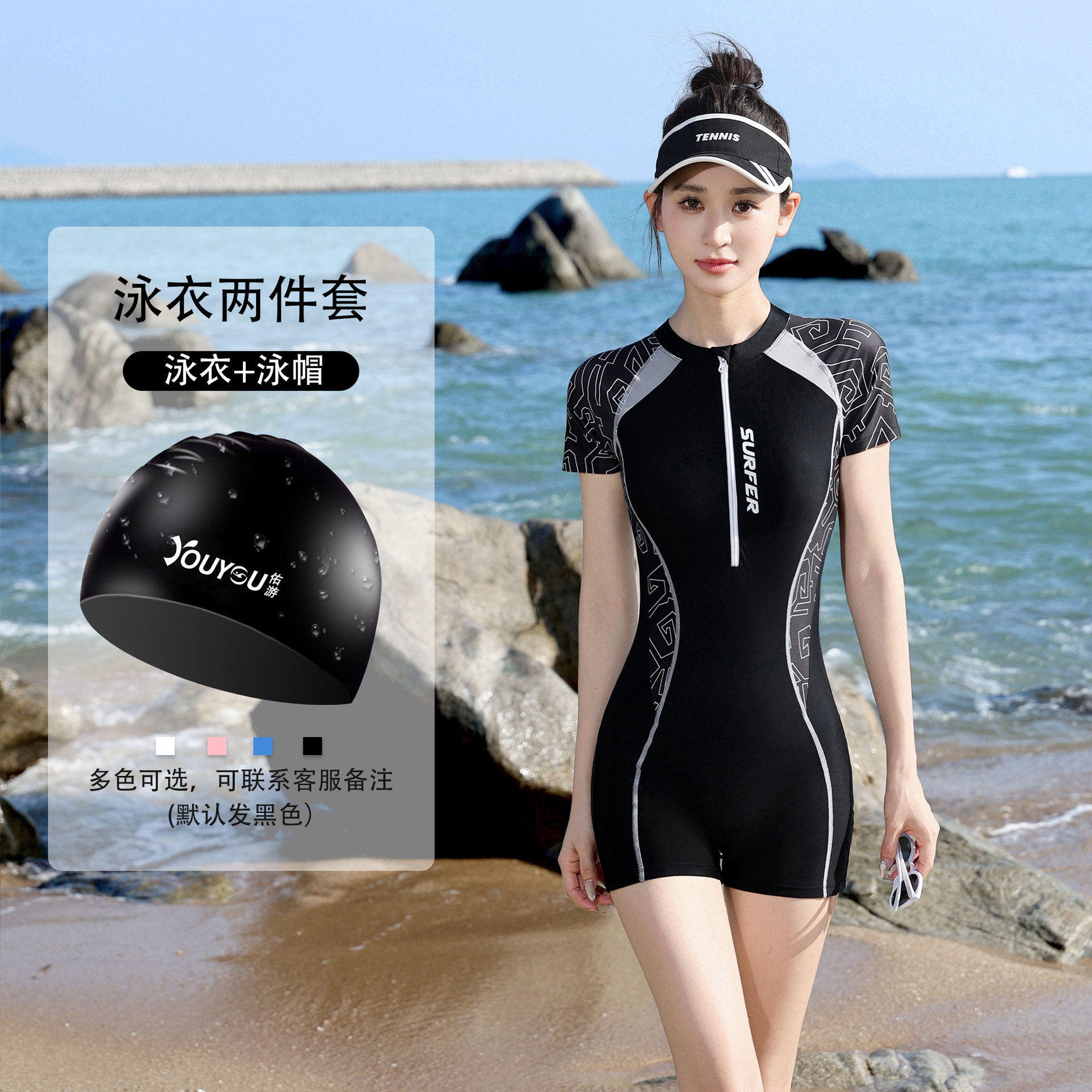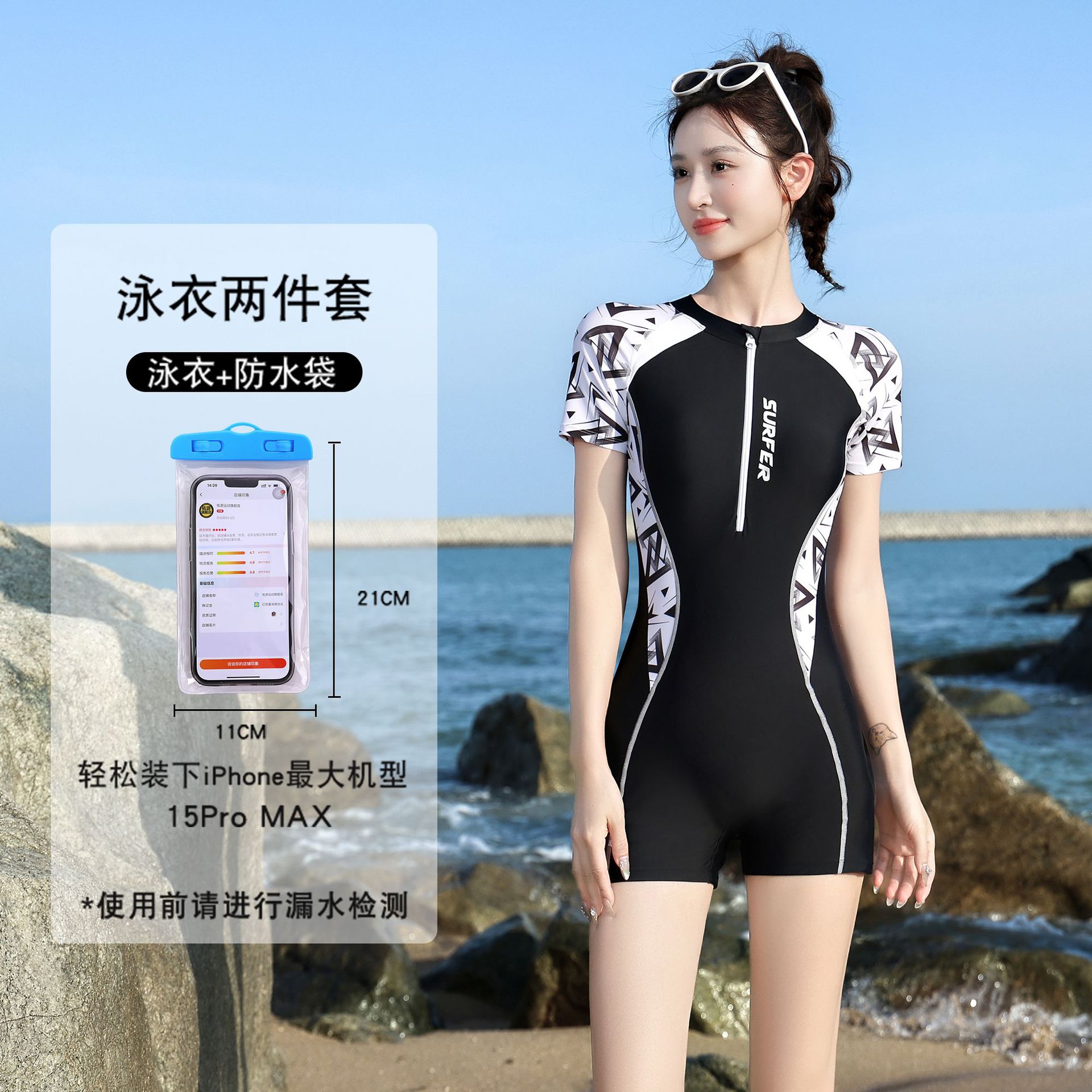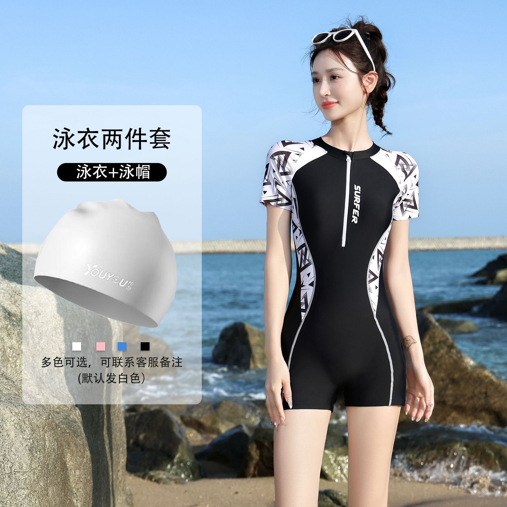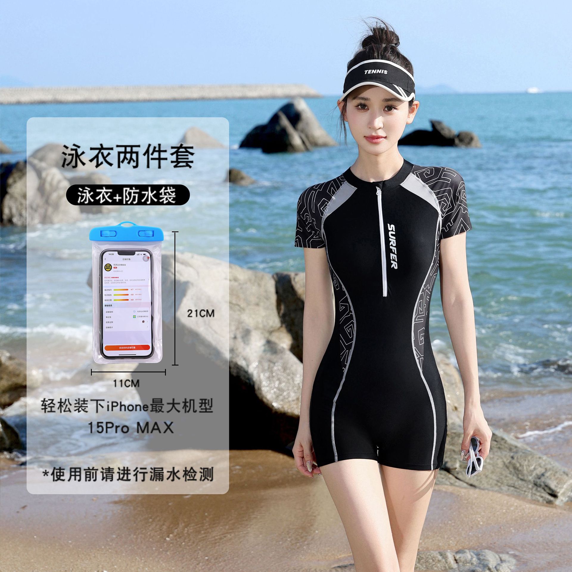 슬리밍 INS 빠른 건조 서핑 수영 세트 컬러 매칭 반팔 보수적 인 플러스 사이즈 스포츠 레저 배꼽이 달린 여성용 원피스 수영복스토어 가기