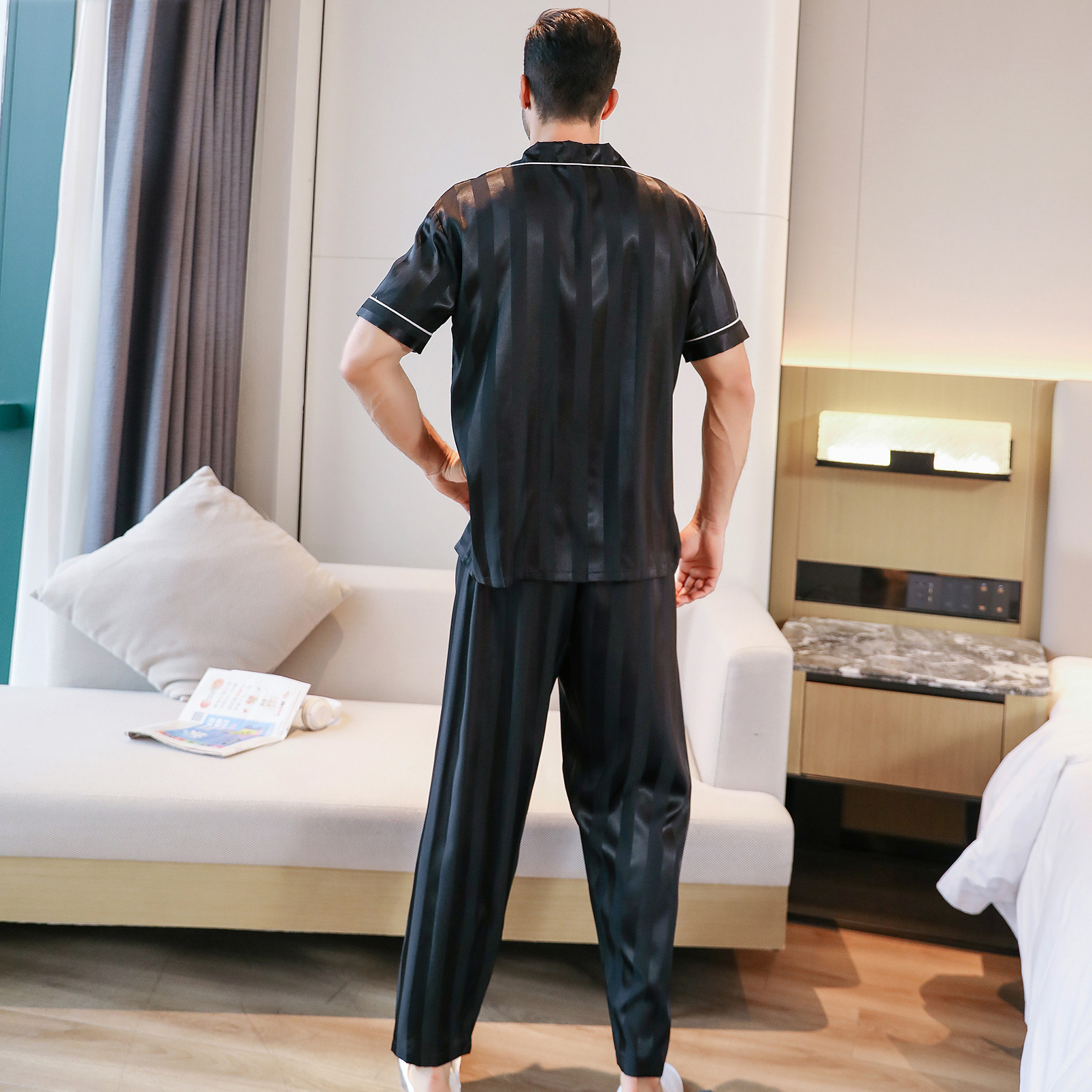 국경 간 파자마 남자 여름 반팔 바지 얇은 세트 실크 카디건 간단한 남자 홈 옷스토어 가기