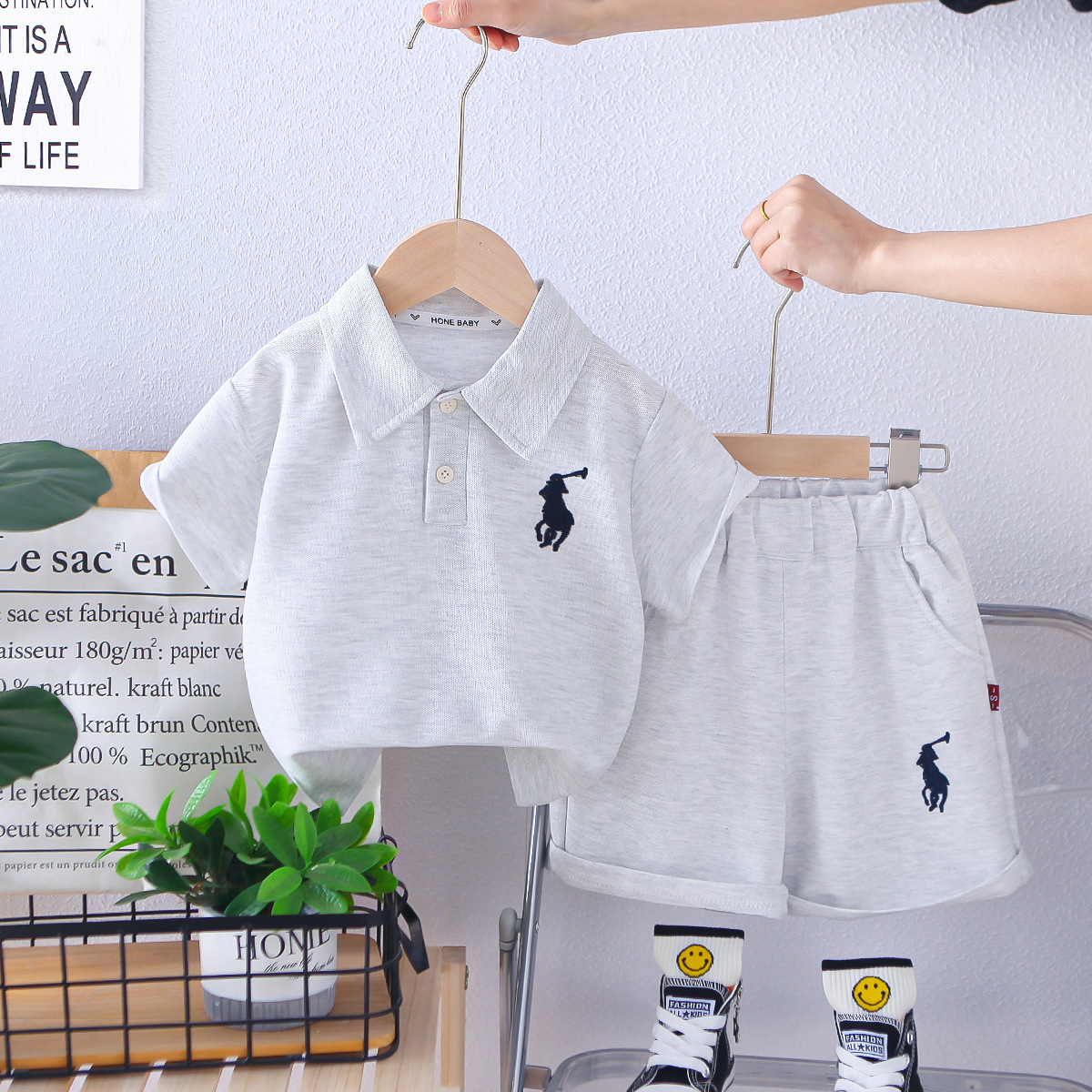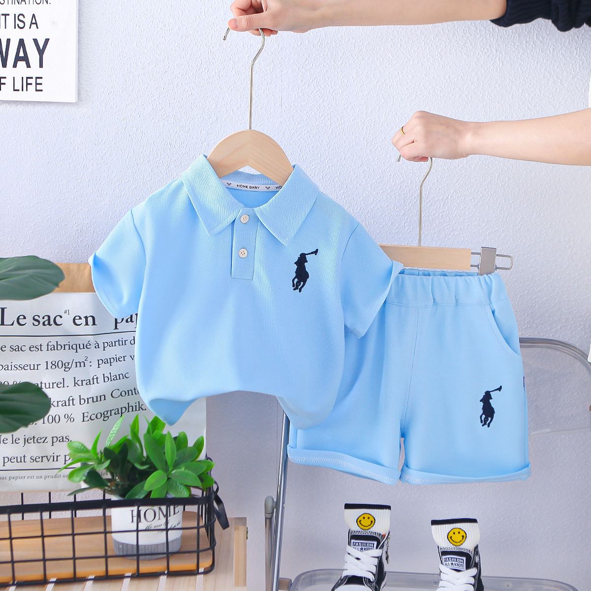 2025 새로운 소년 여름 세트 아기 외국 스타일 아기 여름 짧은 소매 반바지 머리카락 세대의 두 조각 세트스토어 가기