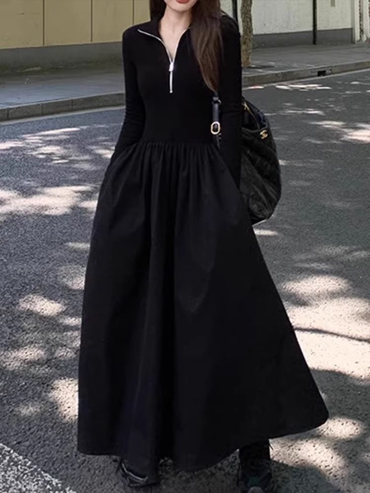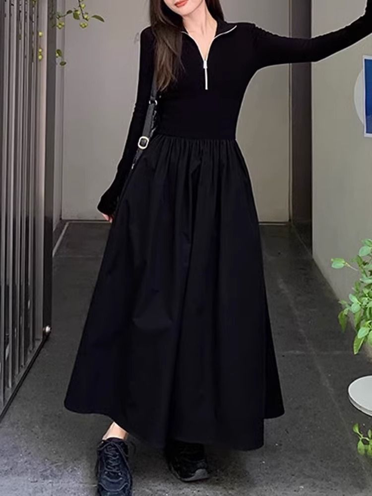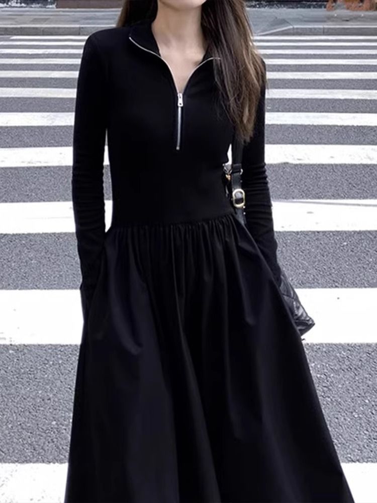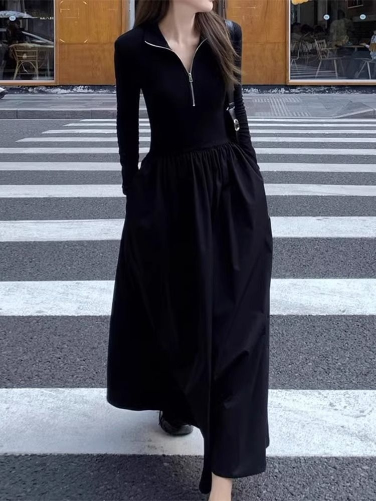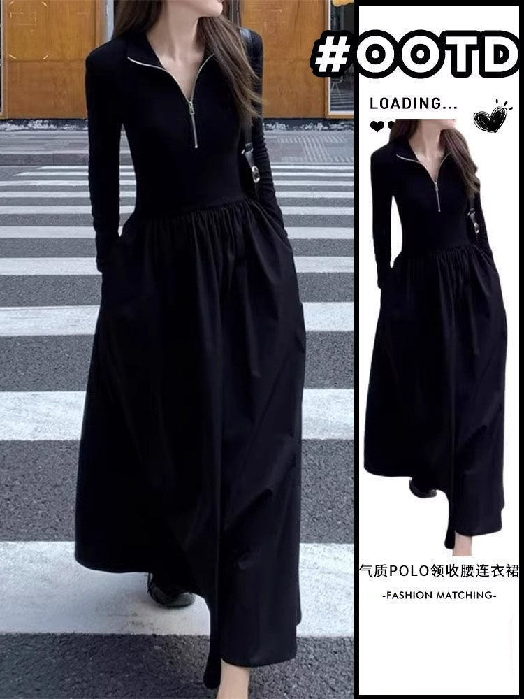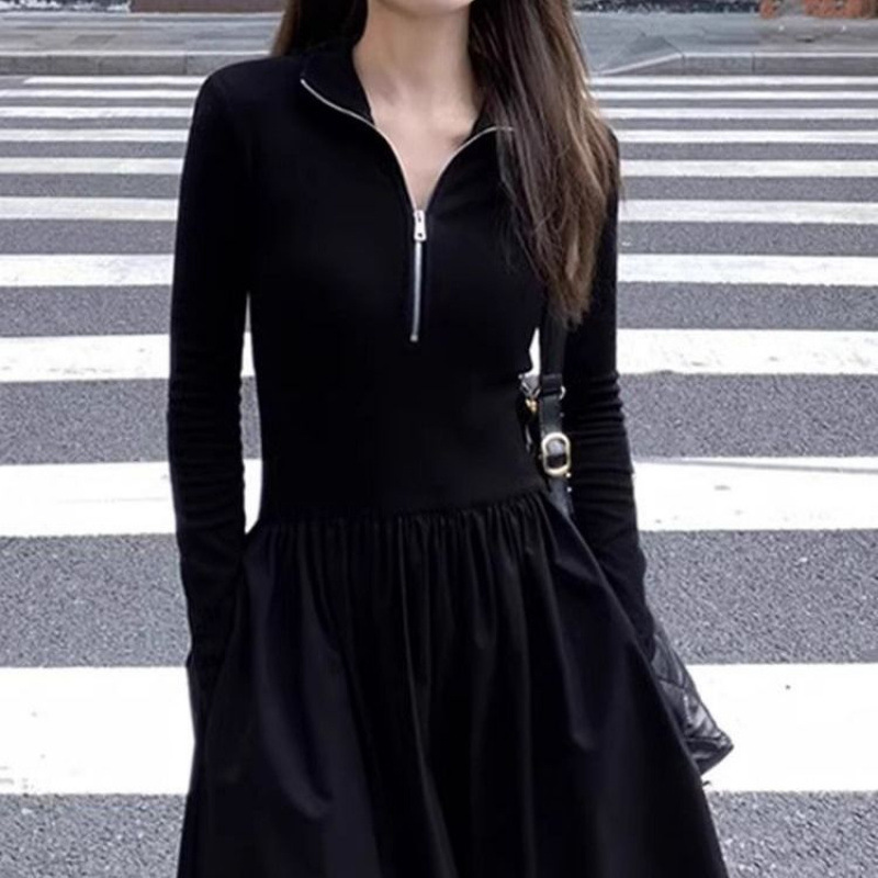 프랑스 헵번 스타일 검은 긴 소매 원피스 어린이 초가을 2024 새로운 하이 엔드 스파이스 소녀 슬림 롱 원피스스토어 가기