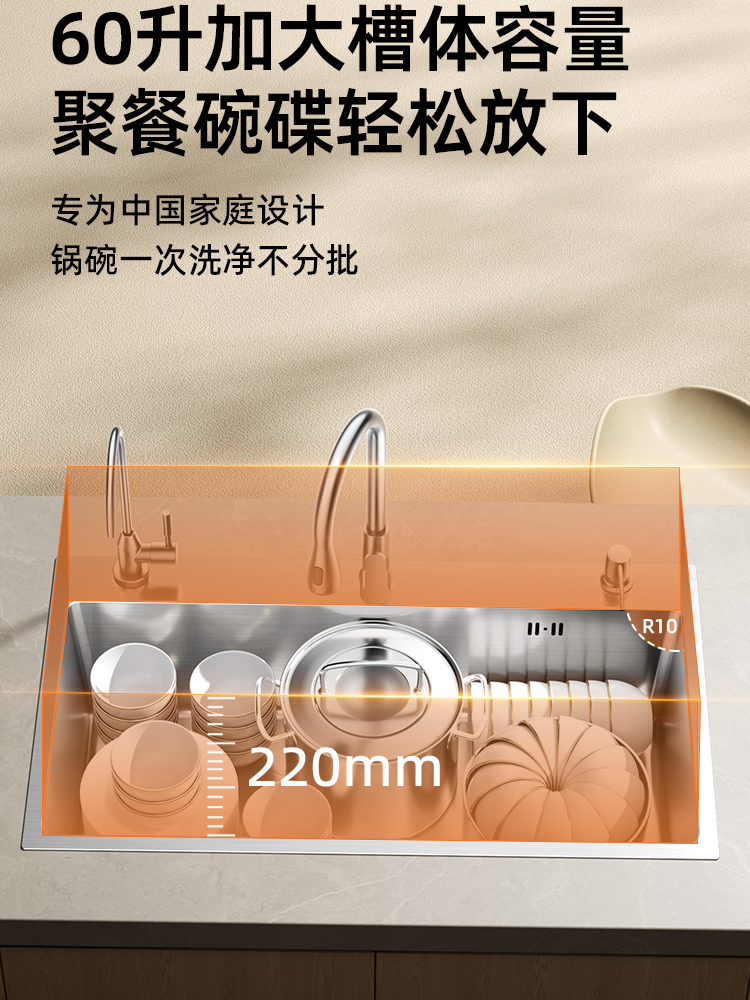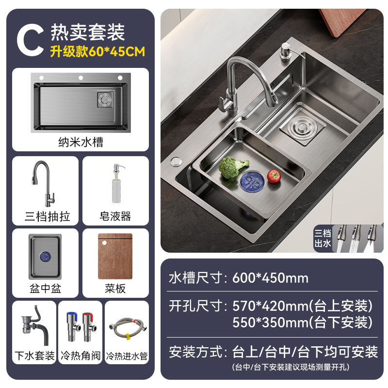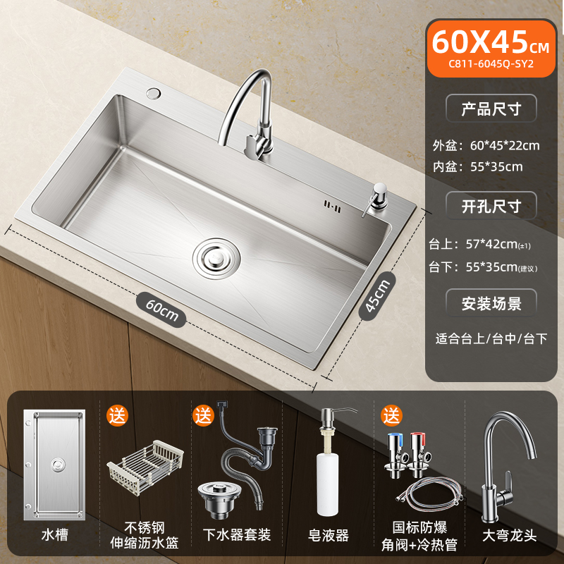 • [특대형 두꺼운 스테인리스 싱글싱크대] 60x45cm | 수도꼭지는 포함되어 있지 않습니다.