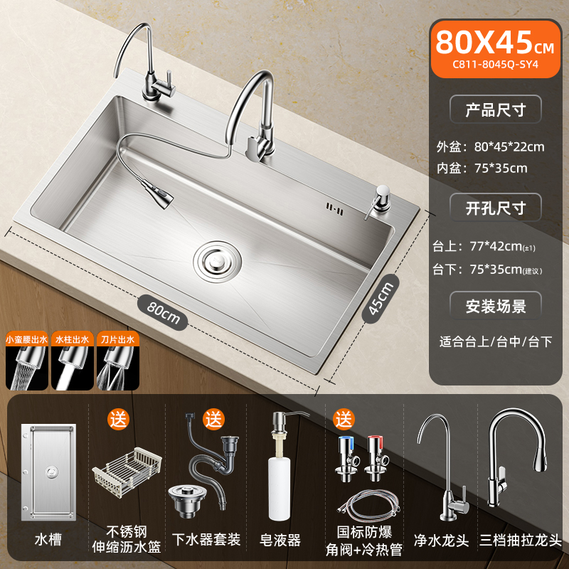 • [두꺼운 스테인리스 대형 싱글탱크] 80x45cm | 3단 부스터 풀아웃수전 | 정수기수전 | 비누디스펜서