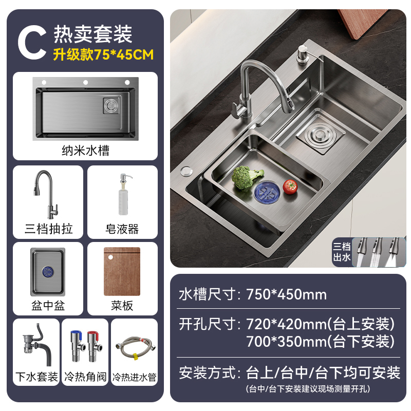 • [특대형 두꺼운 스테인리스 싱글싱크대] 75x45cm | 수도꼭지는 포함되어 있지 않습니다.