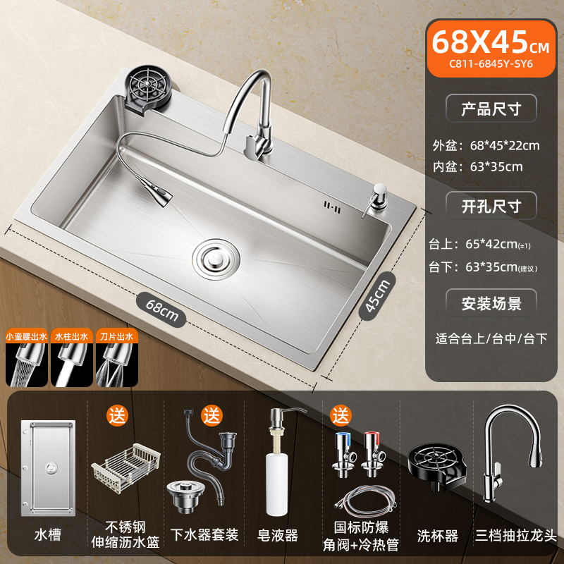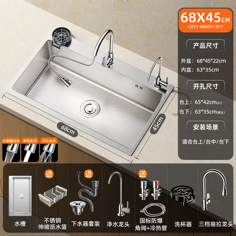• [두꺼운 스테인리스 대형 싱글탱크] 68x45cm | 3단 부스터 풀아웃수전 | 컵워셔 | 비누디스펜서