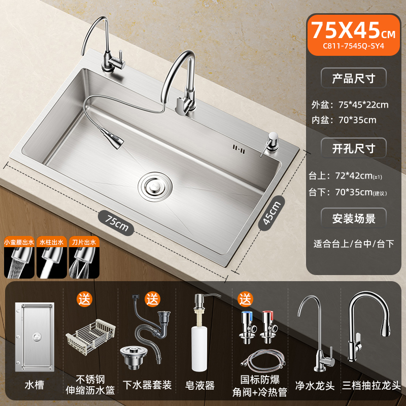 • [두꺼운 스테인리스 대형 싱글탱크] 75x45cm | 스테인리스 냉온수 수도꼭지 | 비누 디스펜서