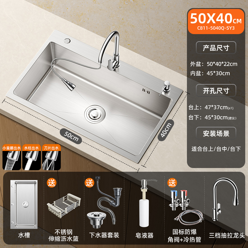 • [두꺼운 스테인리스 대형 싱글탱크] 50x40cm | 스테인리스 냉온수 수도꼭지 | 비누 디스펜서