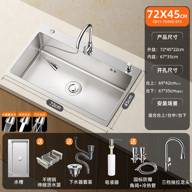• [두꺼운 스테인리스 대형 싱글탱크] 72x45cm | 스테인리스 냉온수 수도꼭지 | 비누 디스펜서