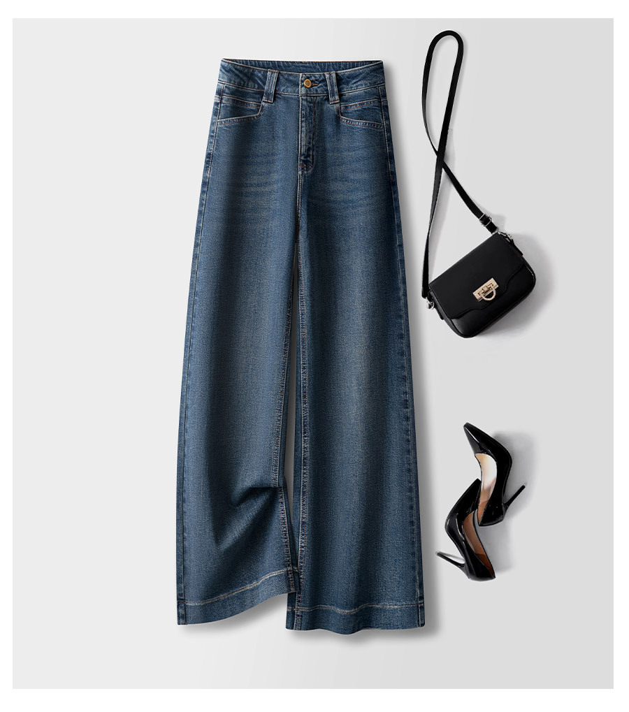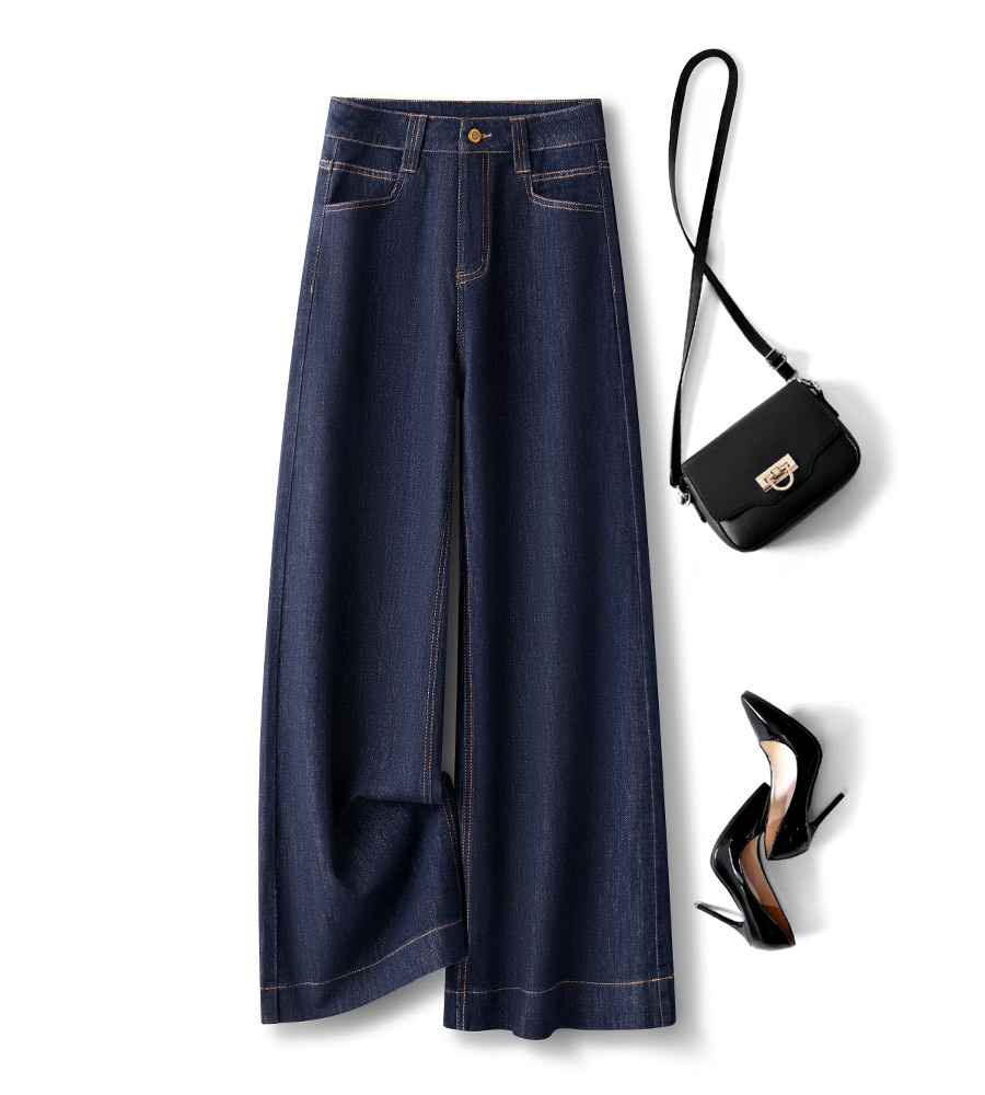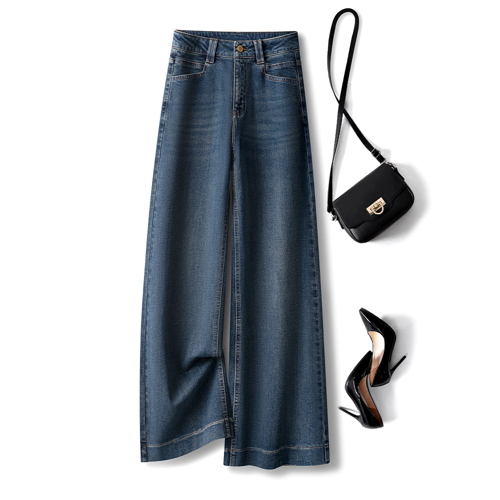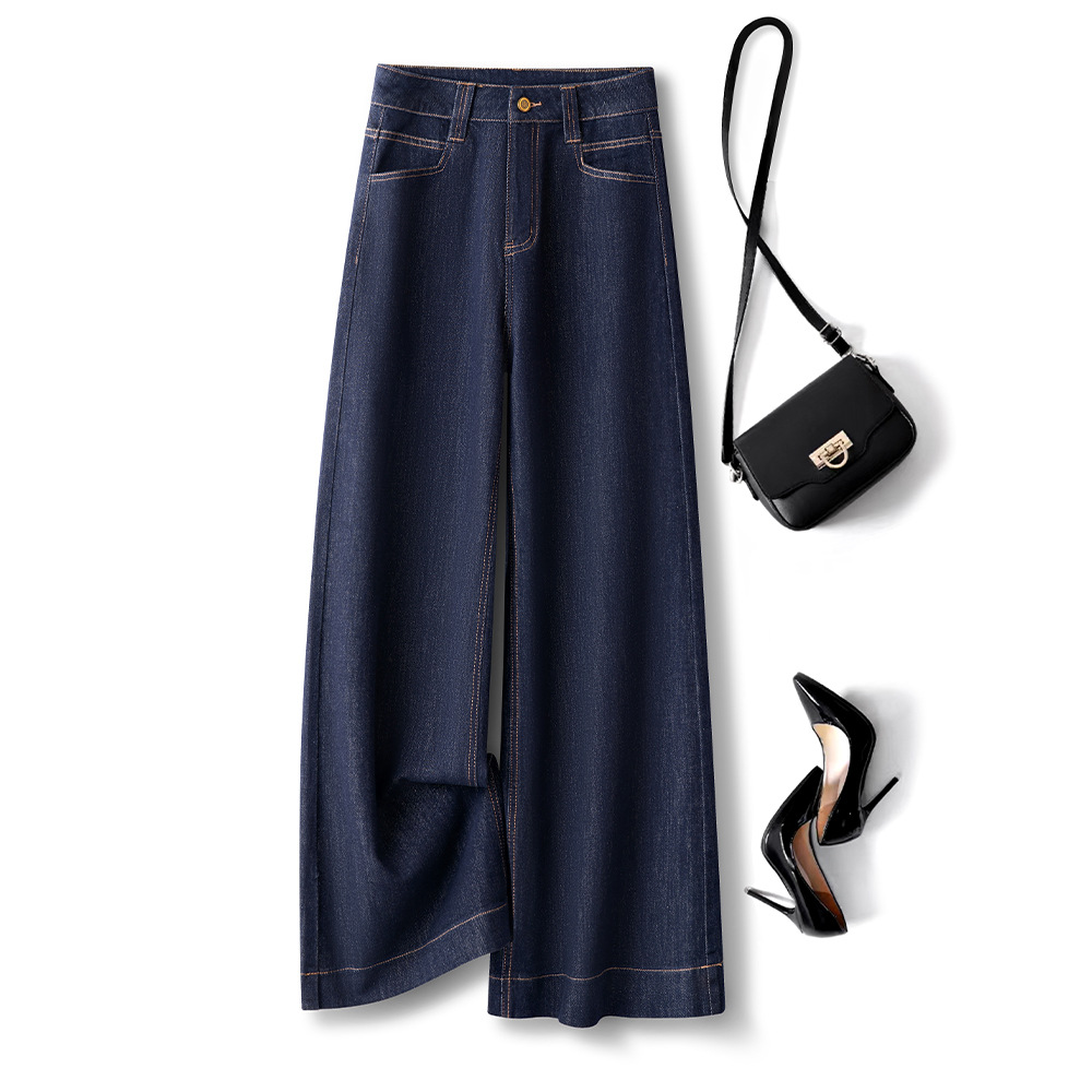 하이 엔드 네이비 데님 넓은 다리 바지 여성용 새 봄 2025 높은 허리 걸레 바지 바지 바지스토어 가기