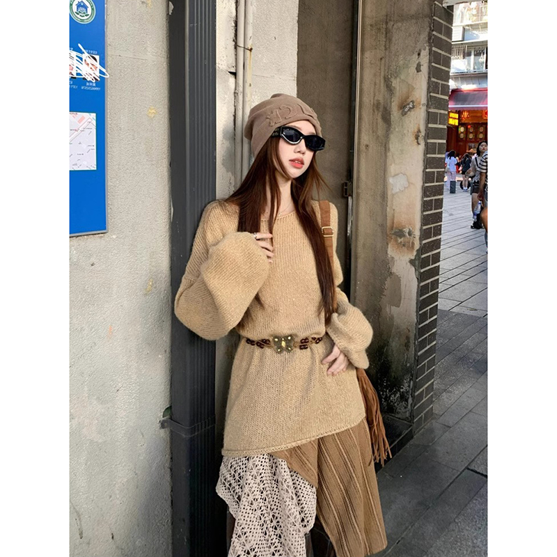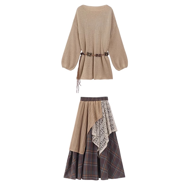 • 니트 스웨터 + 스커트 + 벨트