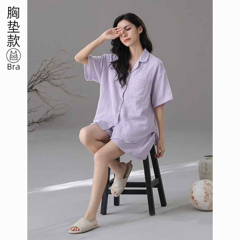 [클래스 A 더블 레이어 원사] 아기 코튼 봄과 여름 커플 파자마 코튼 원사 짧은 소매 느슨한 여성 가슴 패드 홈 옷 남성 A스토어 가기