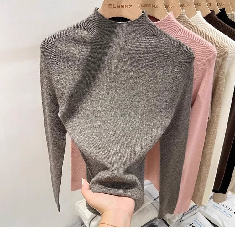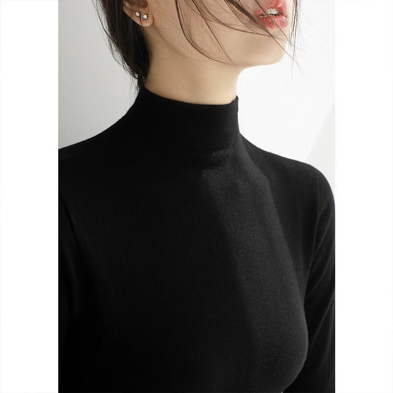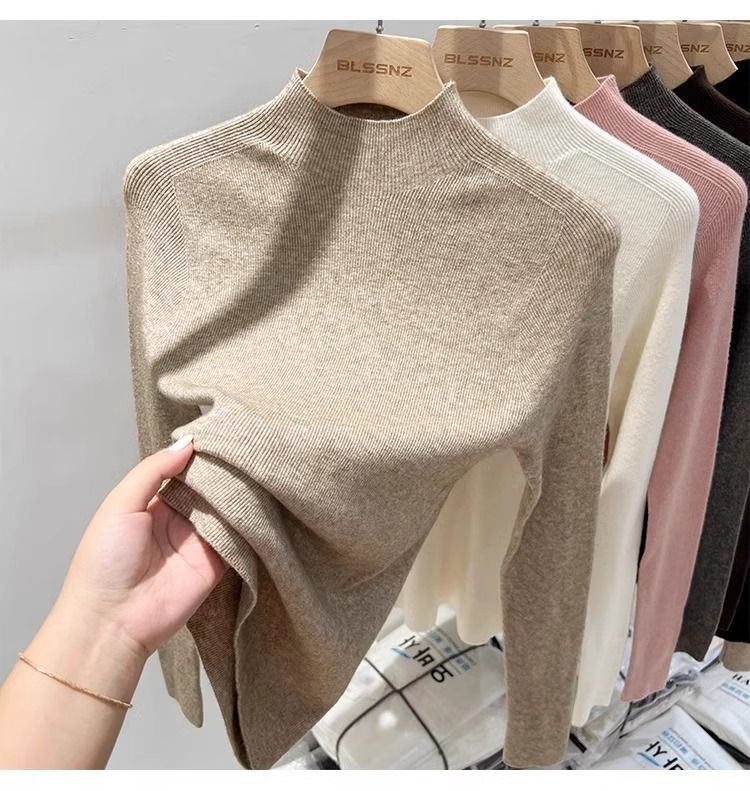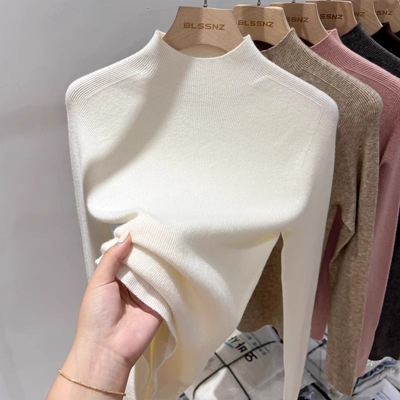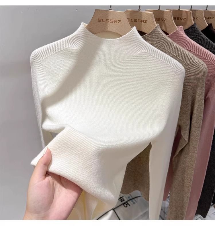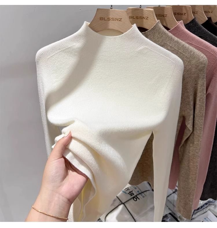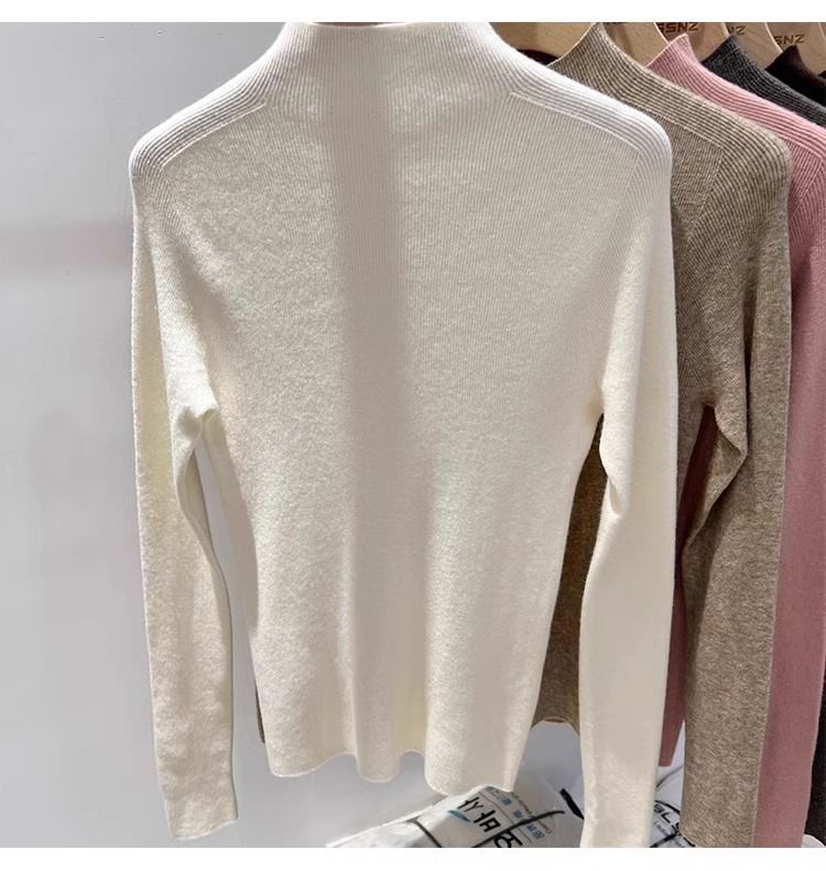 2025 봄과 가을 반 높이 칼라 화이트 니트베이스 셔츠 여성용 슬림 핏 소프트 왁스 슬림 핏 우아한 미드 넥 스웨터 트렌디스토어 가기