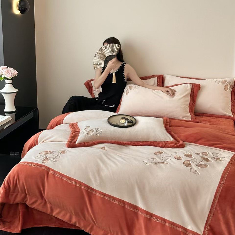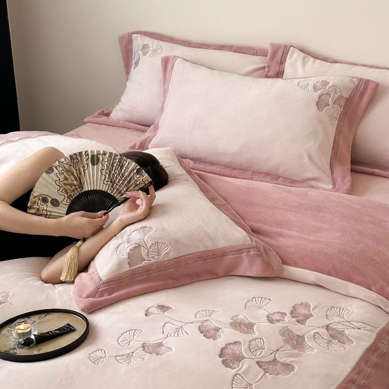 하이 엔드 가을과 겨울 따뜻한 높은 무게 실크 양털 4 피스 세트 부드러운 피부 친화적이고 달콤한 겨울 우유 양털 침구
