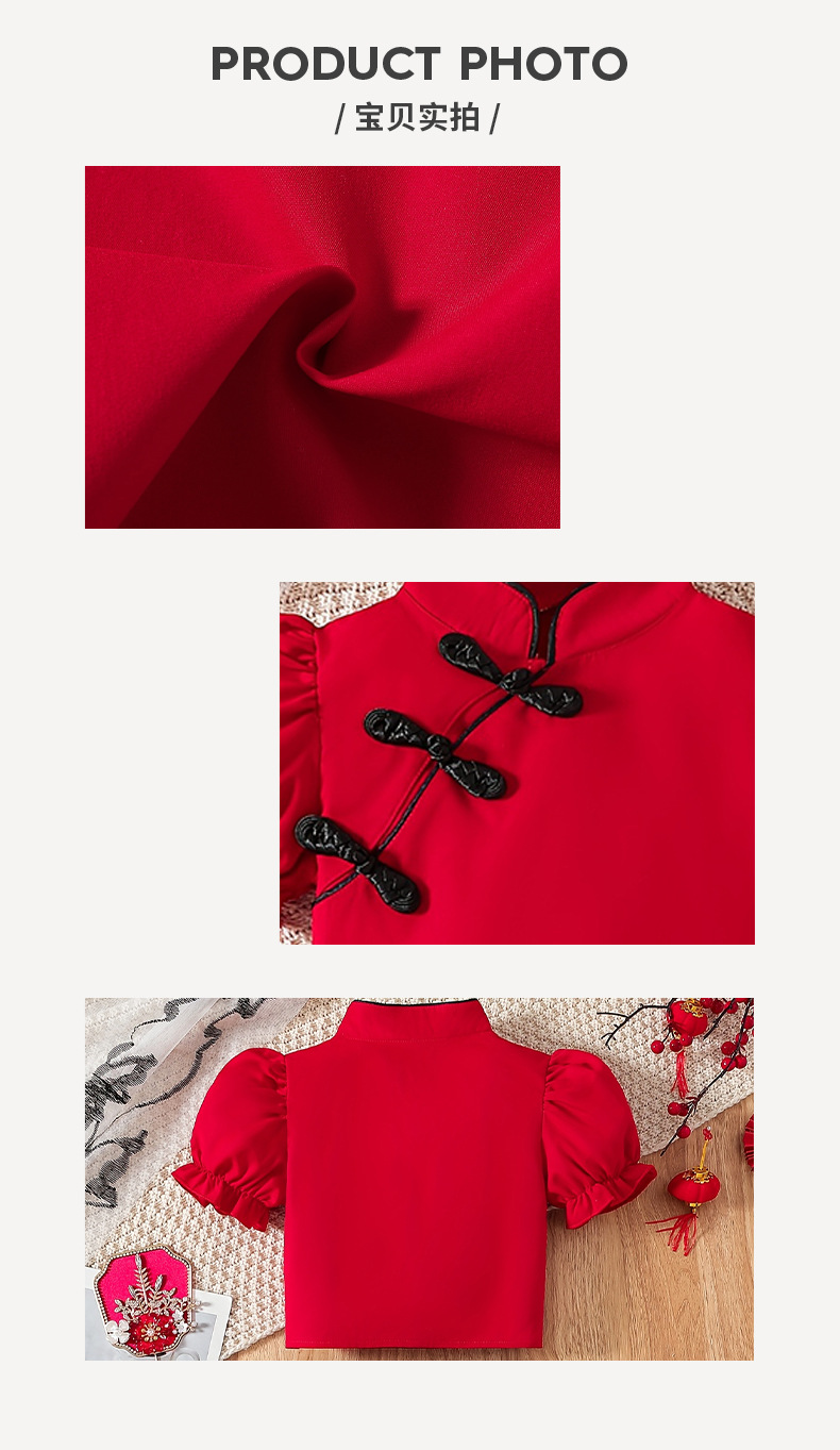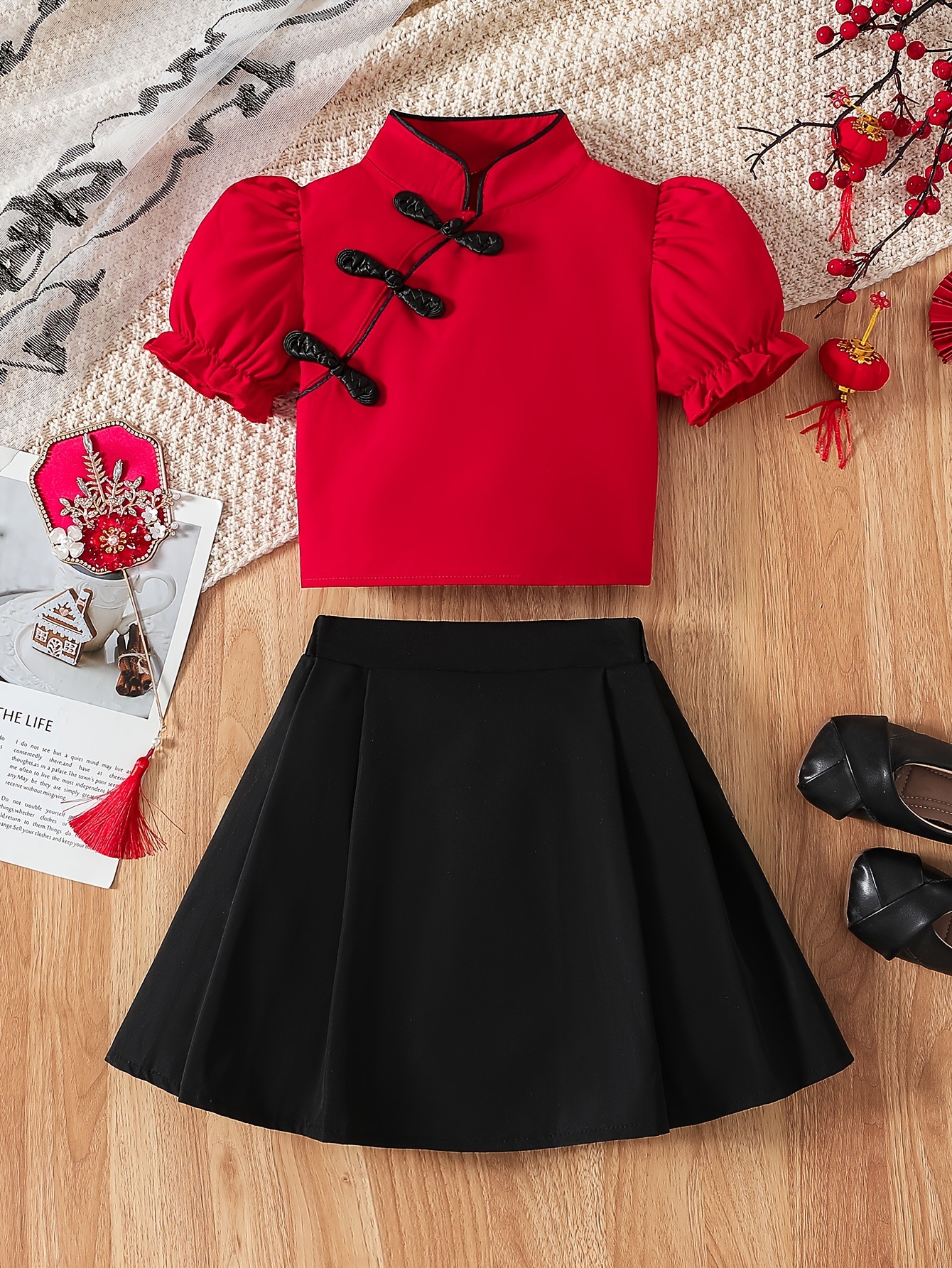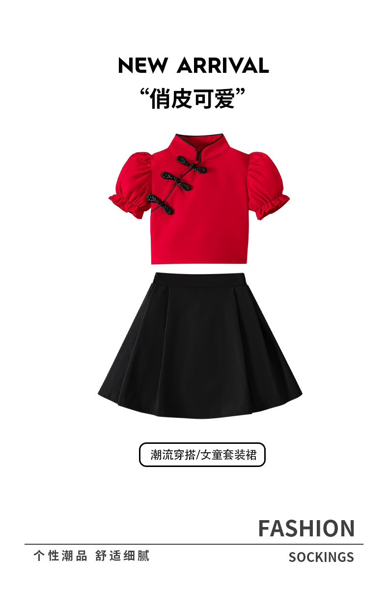 소녀의 짧은 치마 투피스 세트 레드 랜턴 슬리브 중국 버클 블랙 주름 치마 어린이 국가 스타일 스커트