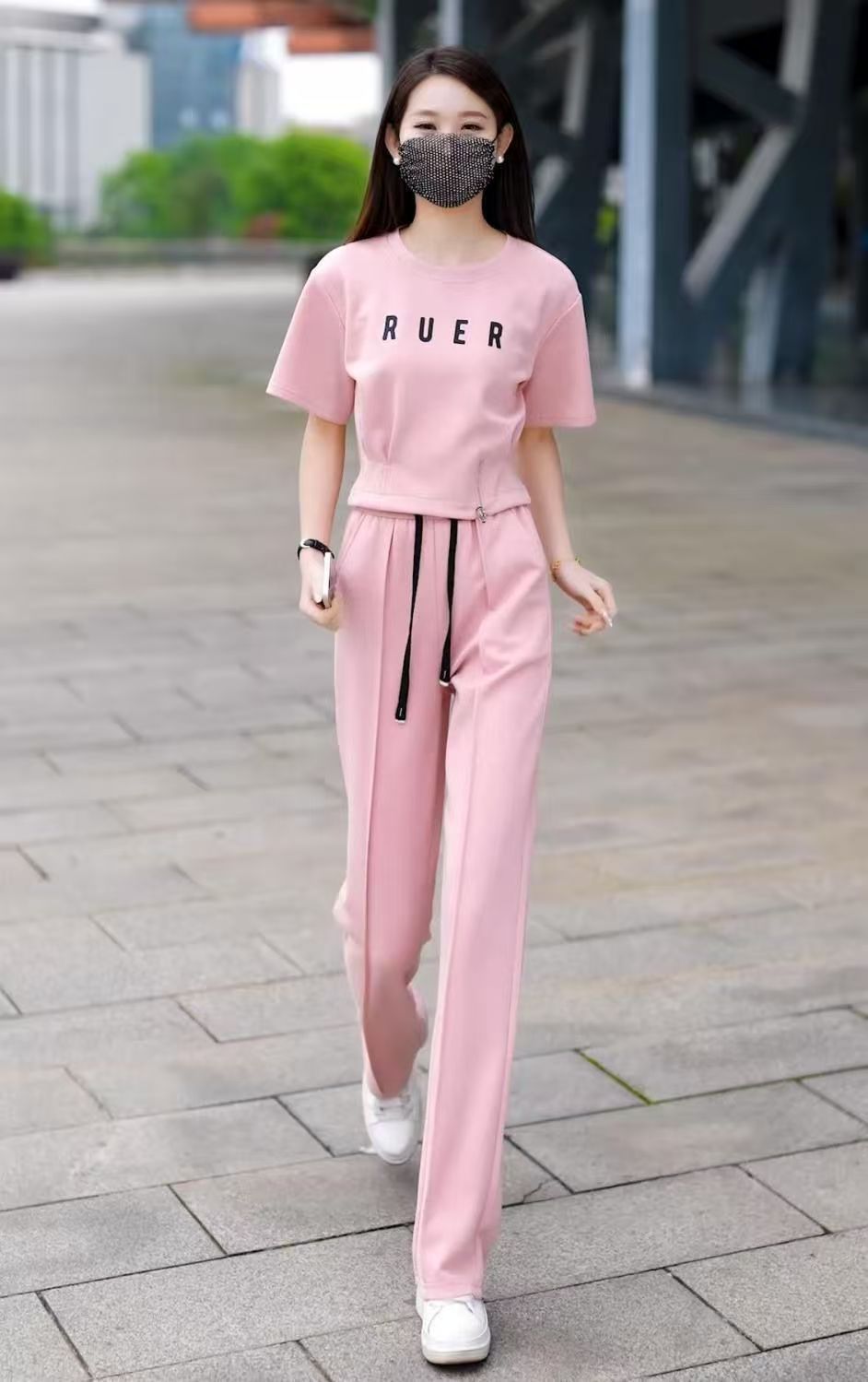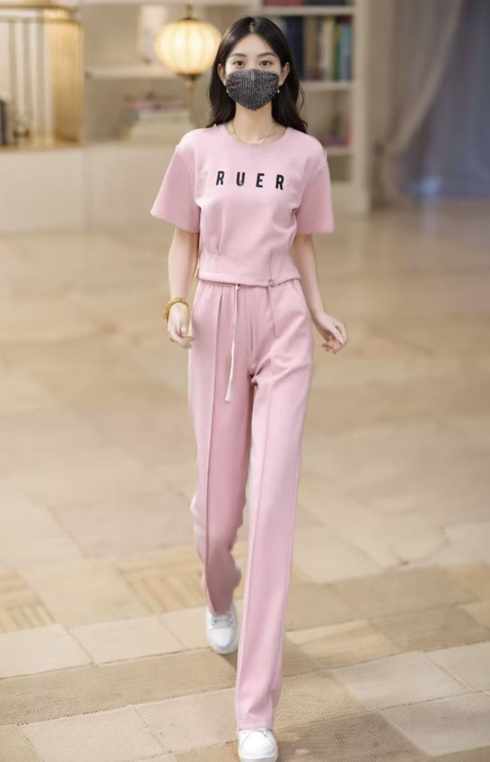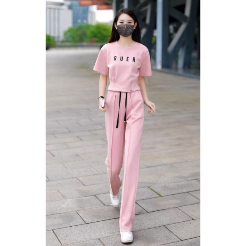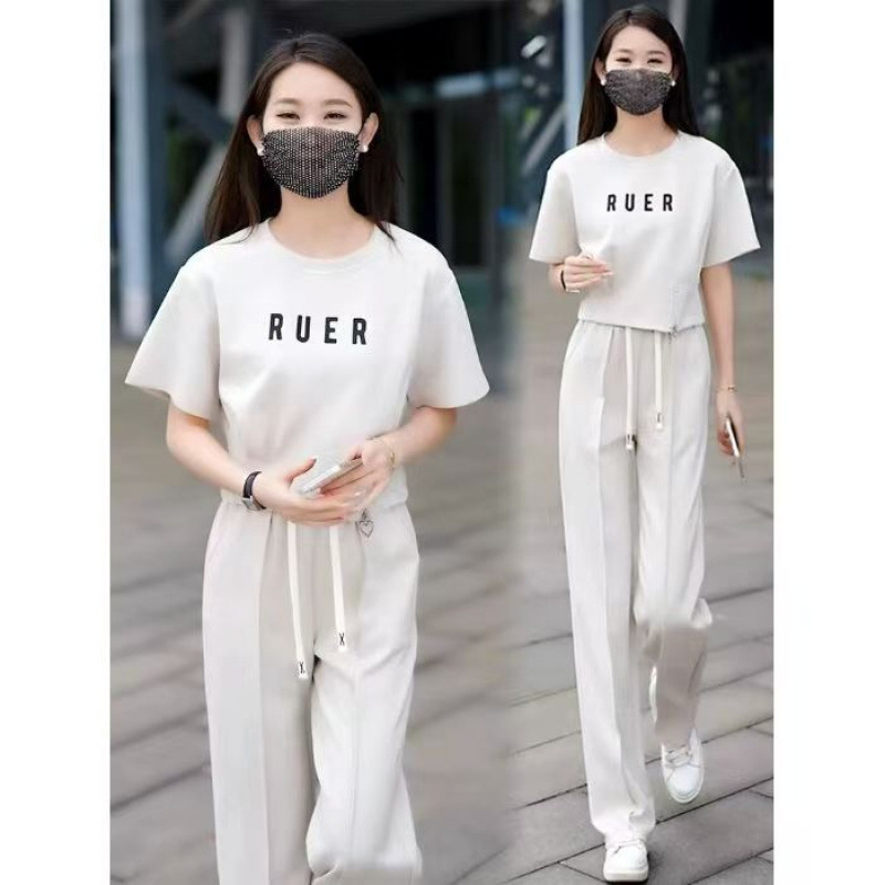 유행 캐주얼 세트 여자 2025 여름 새로운 느슨한 나이 감소 서양식 운동복 반팔 와이드 레그 팬츠 투피스 세트스토어 가기