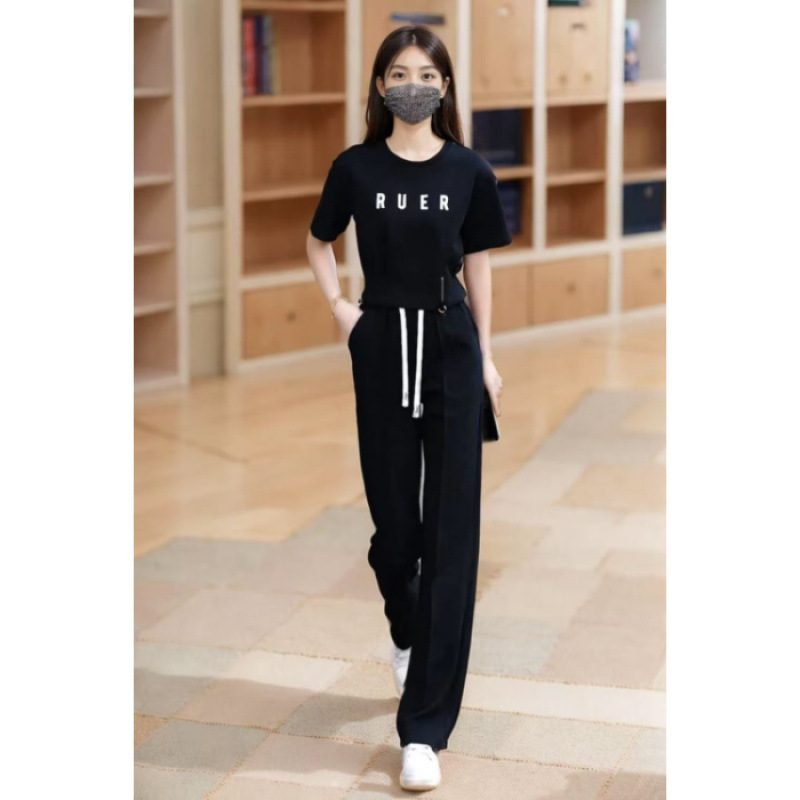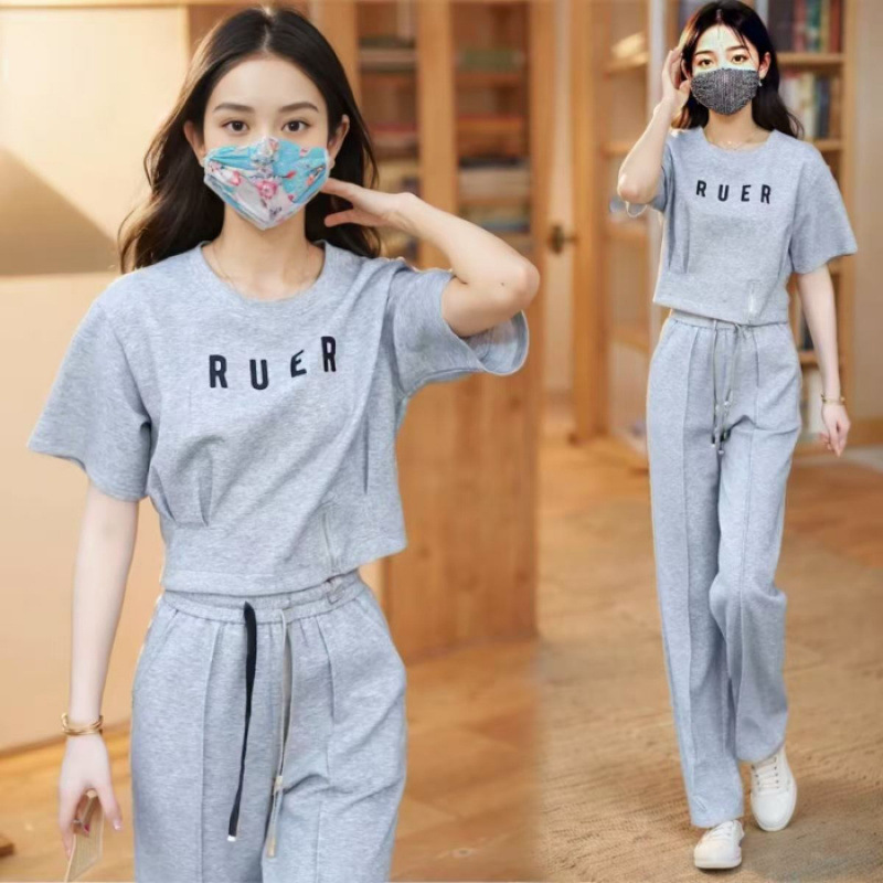유행 캐주얼 세트 여자 2025 여름 새로운 느슨한 나이 감소 서양식 운동복 반팔 와이드 레그 팬츠 투피스 세트