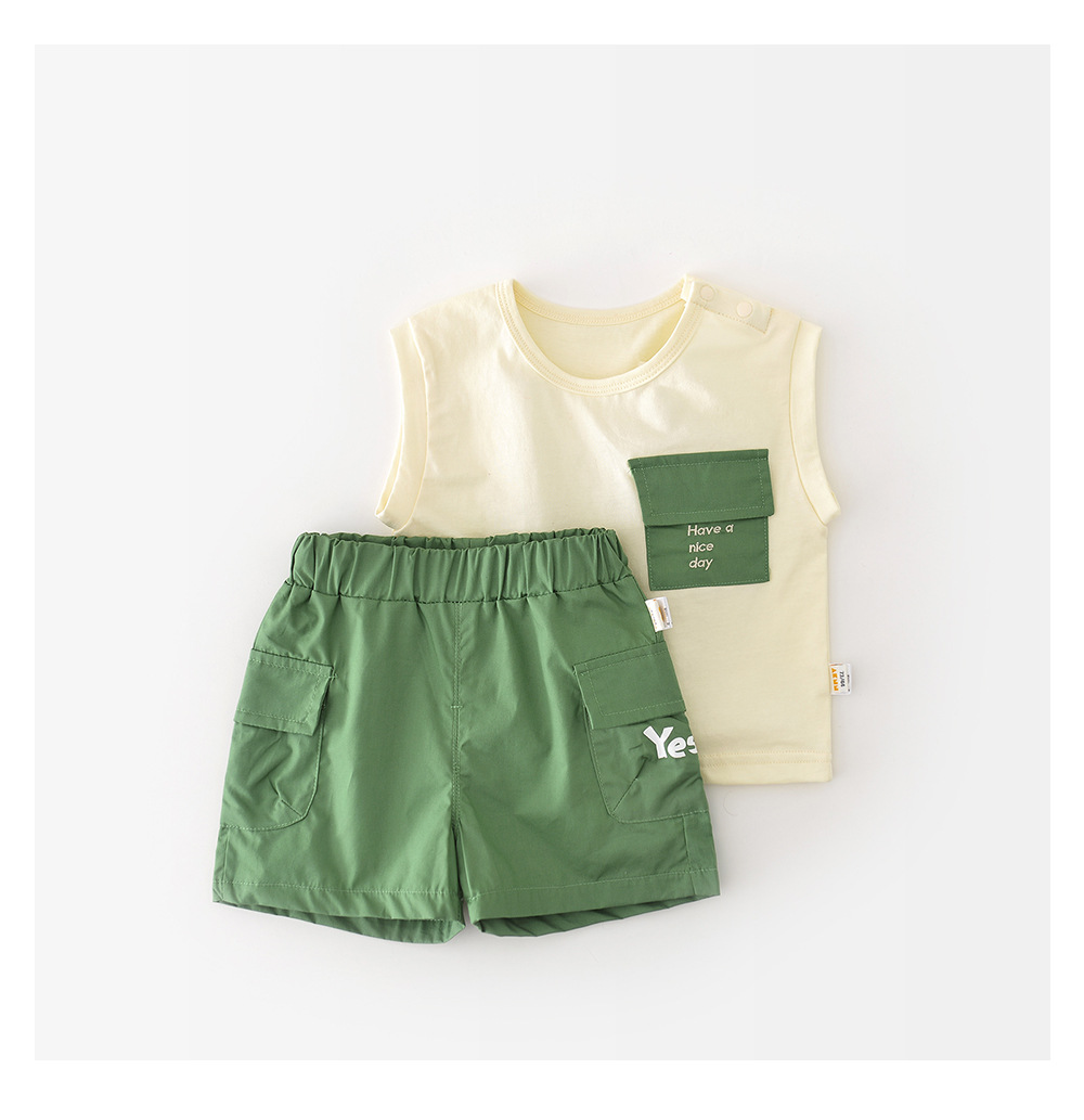여름 새로운 한국 어린이 큰 주머니 편지 민소매 세트 아기 유아 바지 2 조각 52010