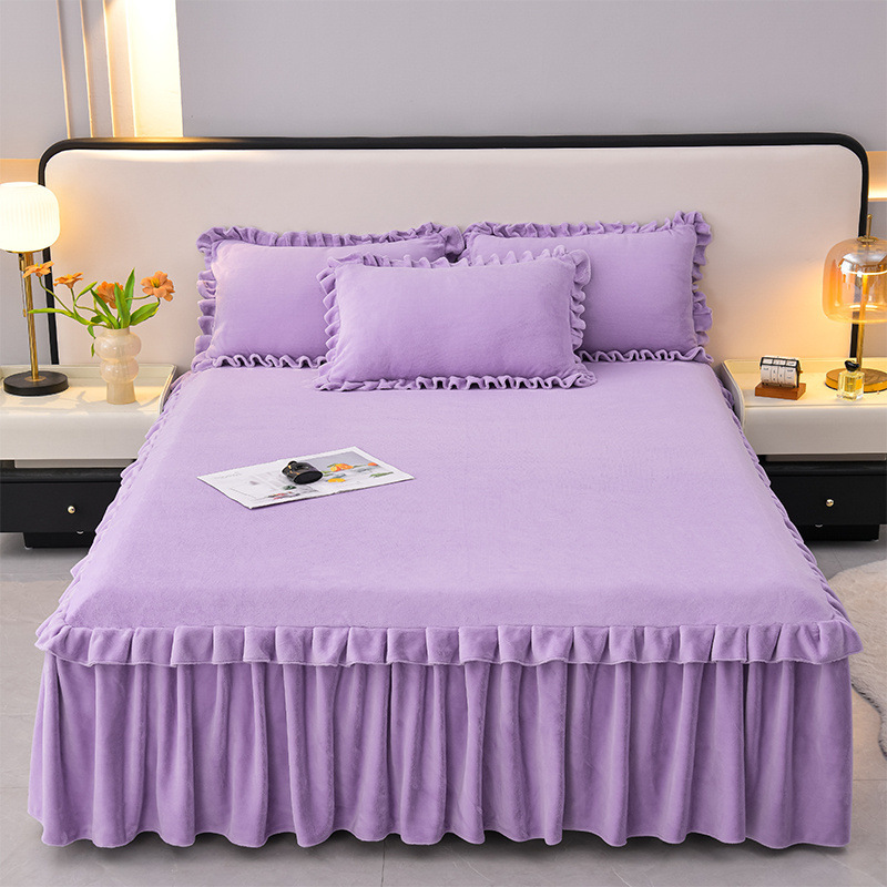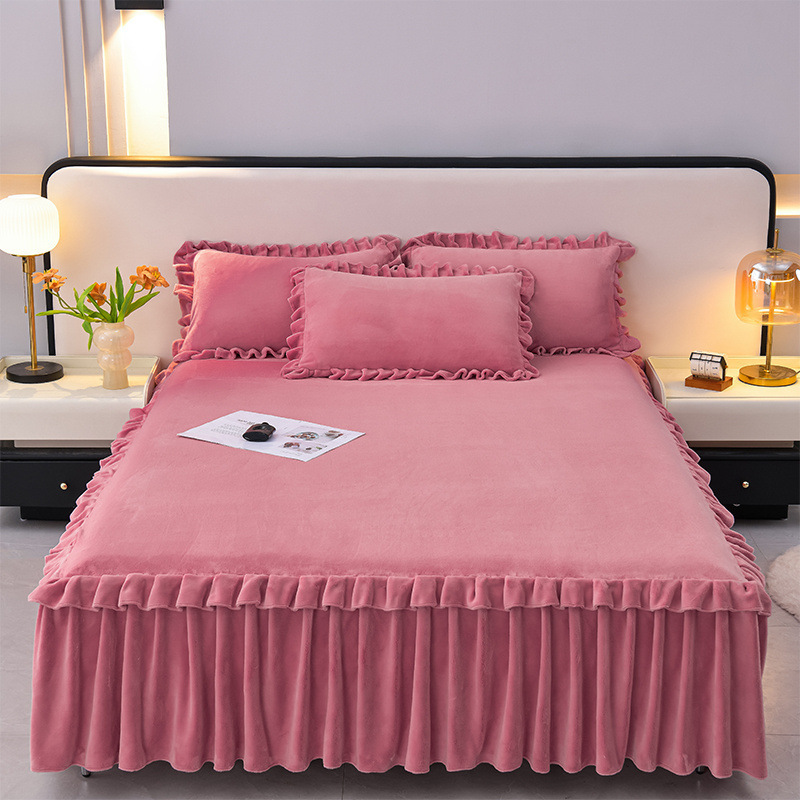 국경 레이스 우유 벨벳 침대 치마 침대보 두꺼운 우유 벨벳 침대 스커트 겨울 미끄럼 방지 우유 벨벳 침대 스커트 3 피스 세트