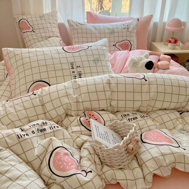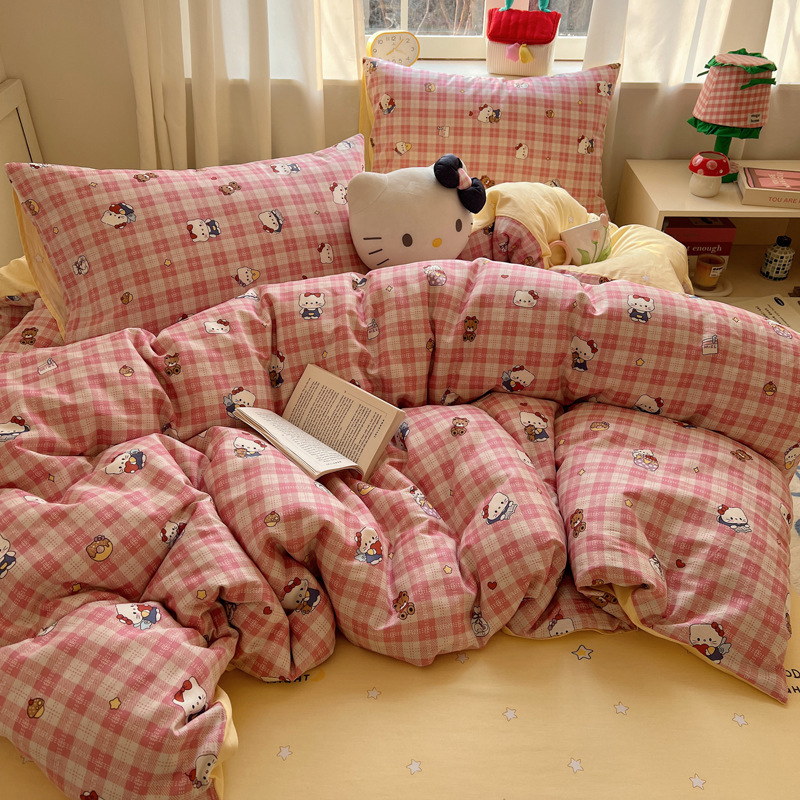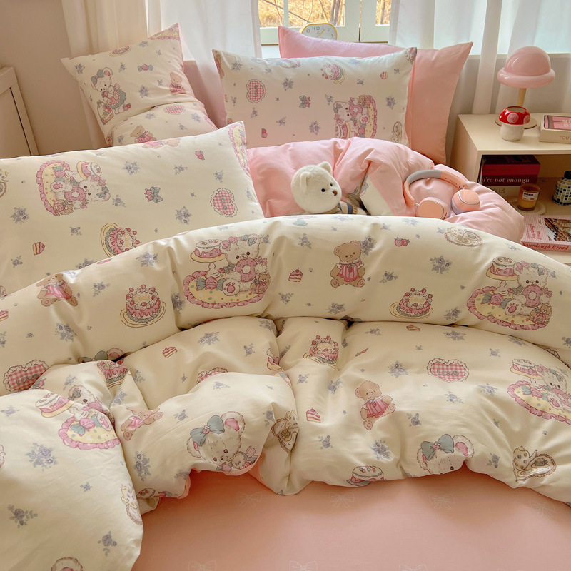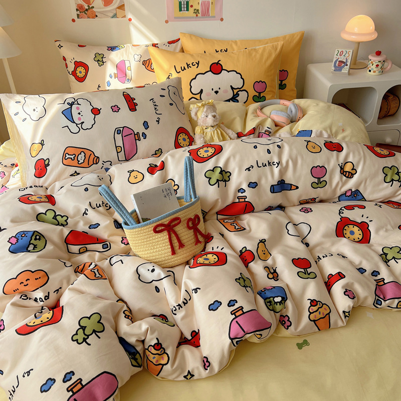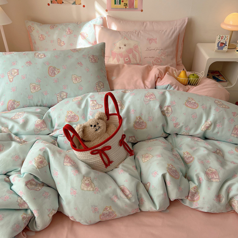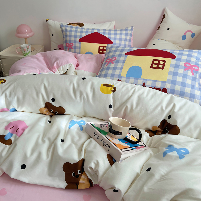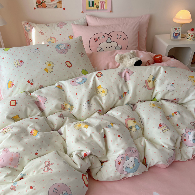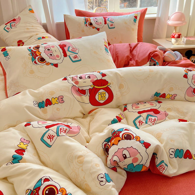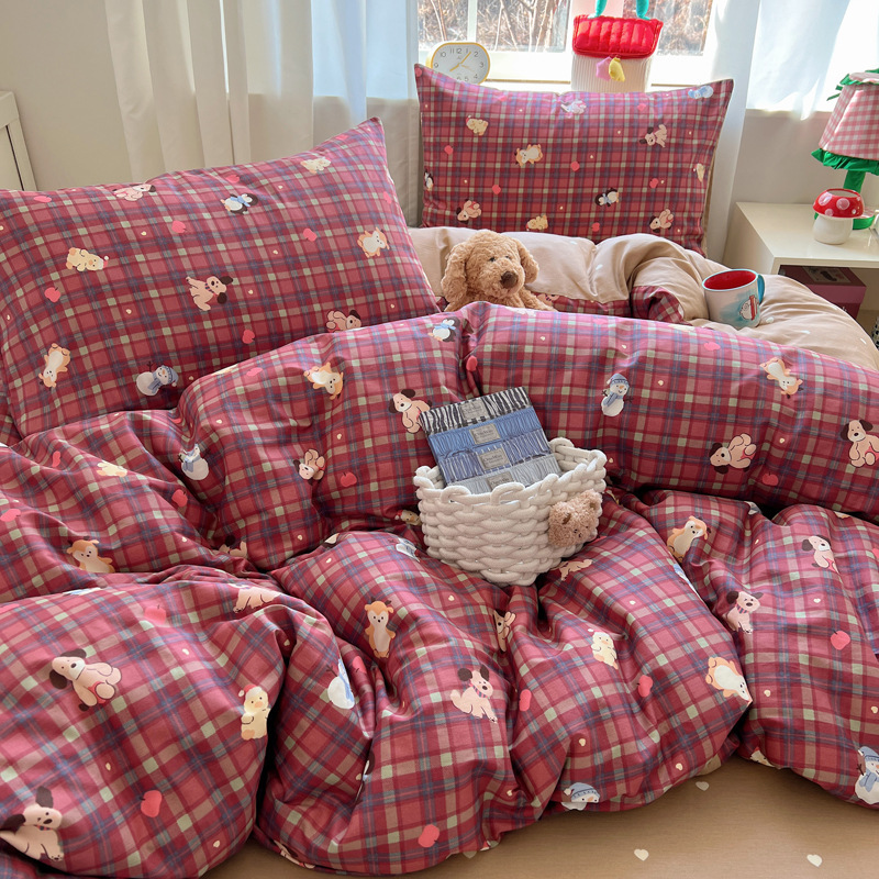 2025 봄 신간 스타일 만화 작은 신선한 면 4 피스 코튼 그물 레드 퀼트 커버 침대 시트 3 피스 세트스토어 가기
