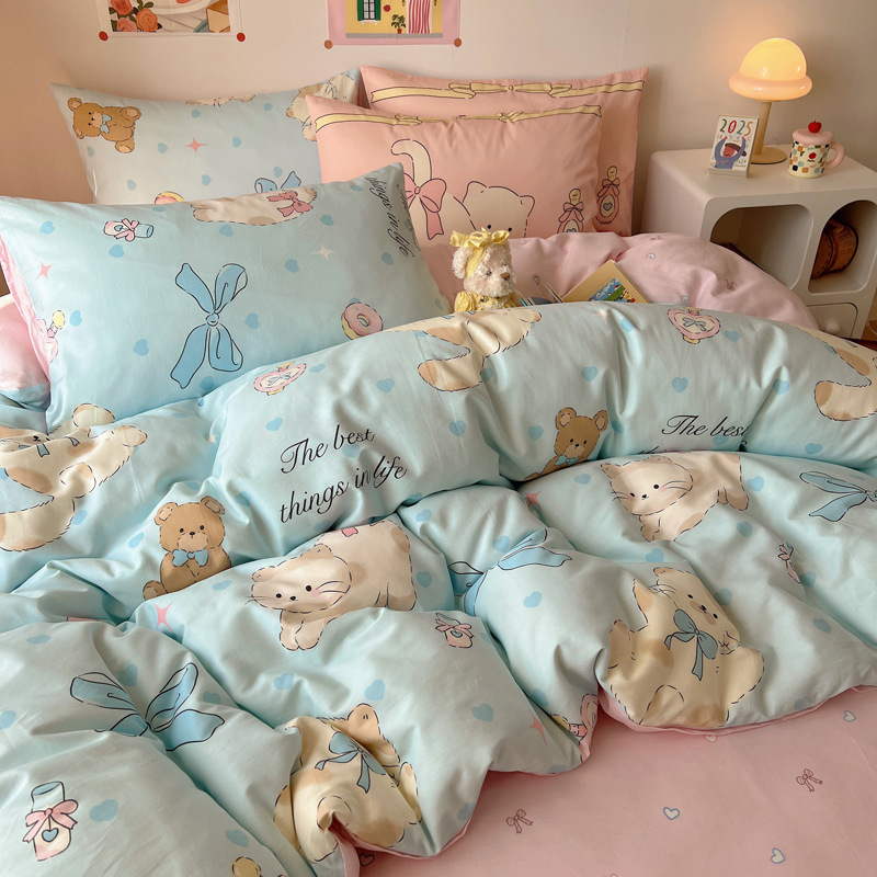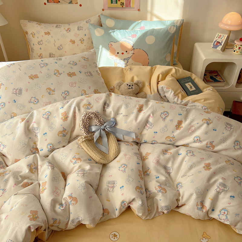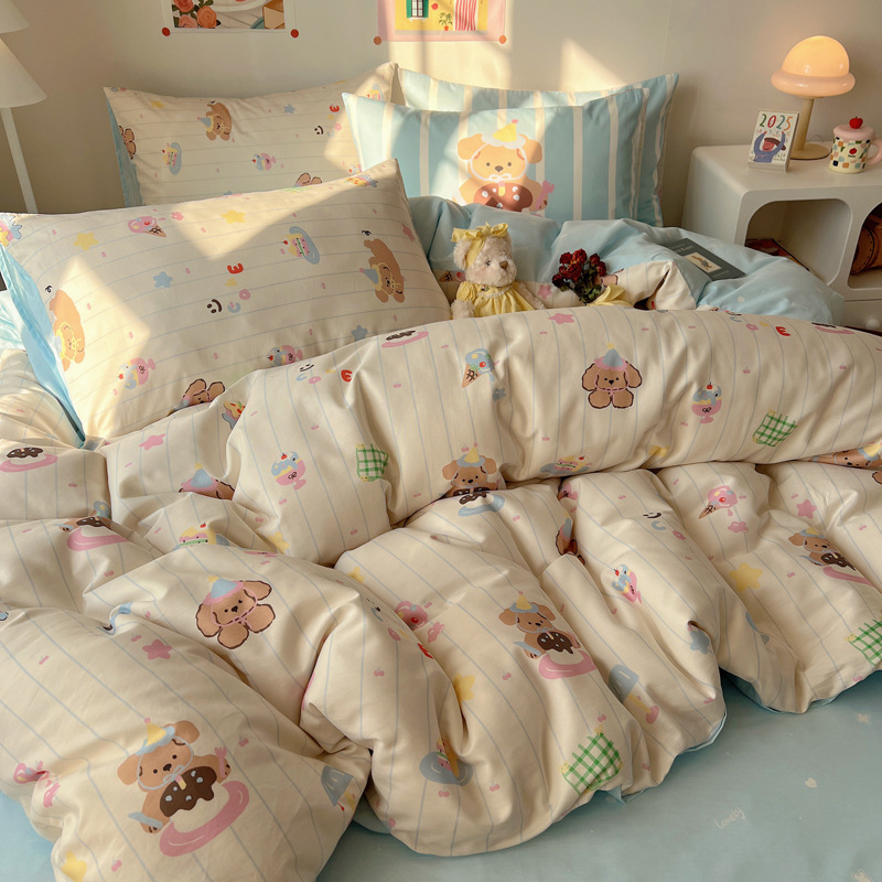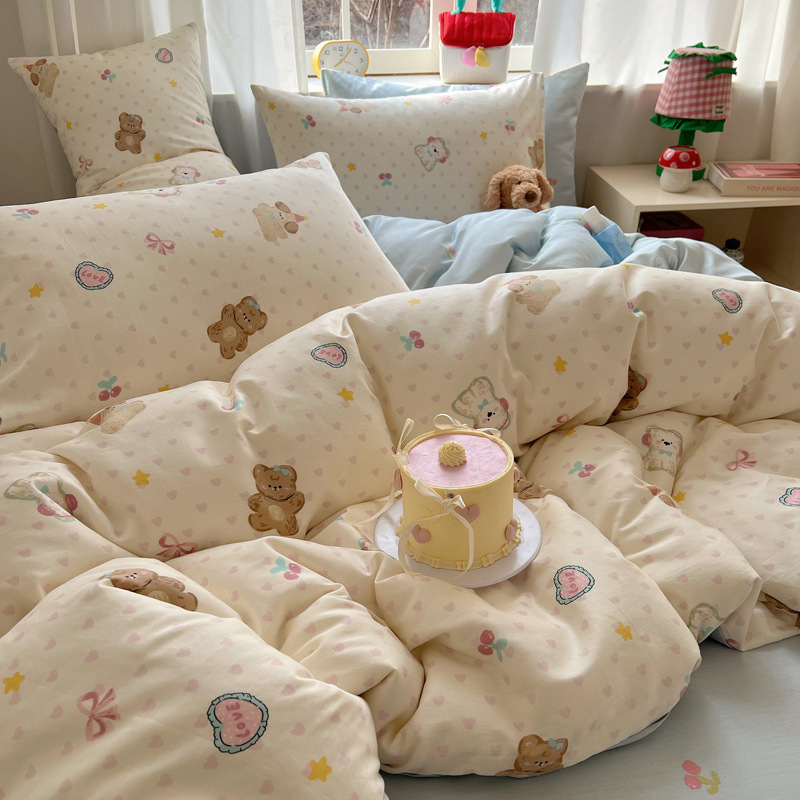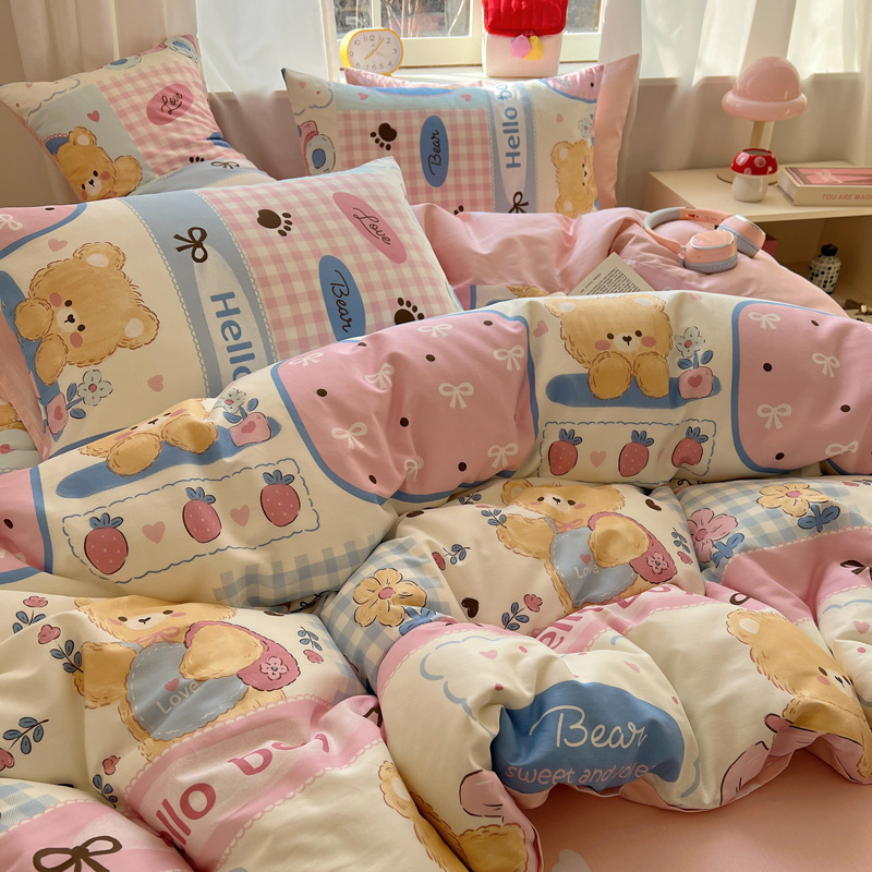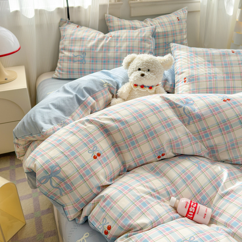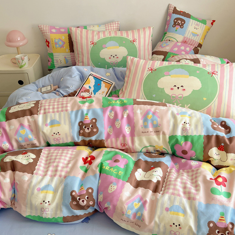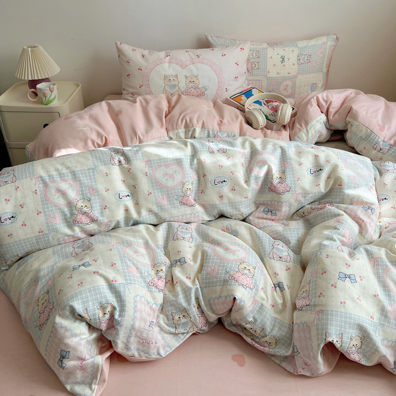 2025 봄 신간 스타일 만화 작은 신선한 면 4 피스 코튼 그물 레드 퀼트 커버 침대 시트 3 피스 세트