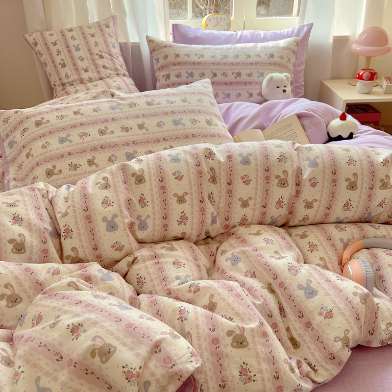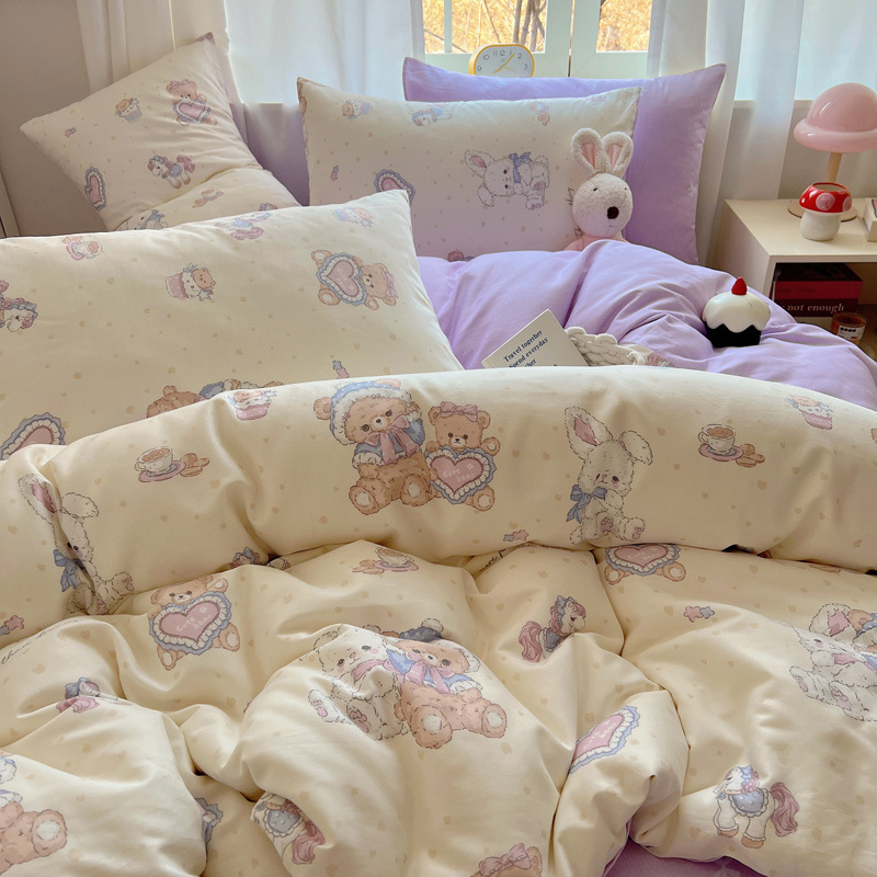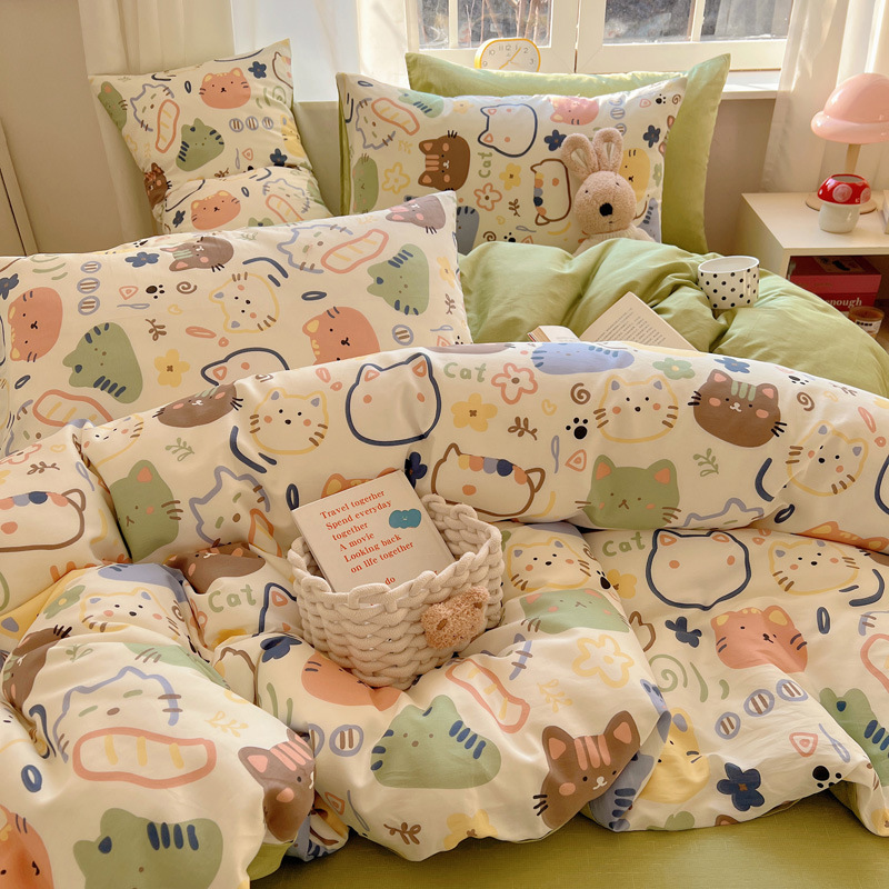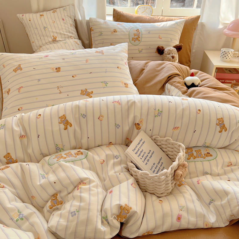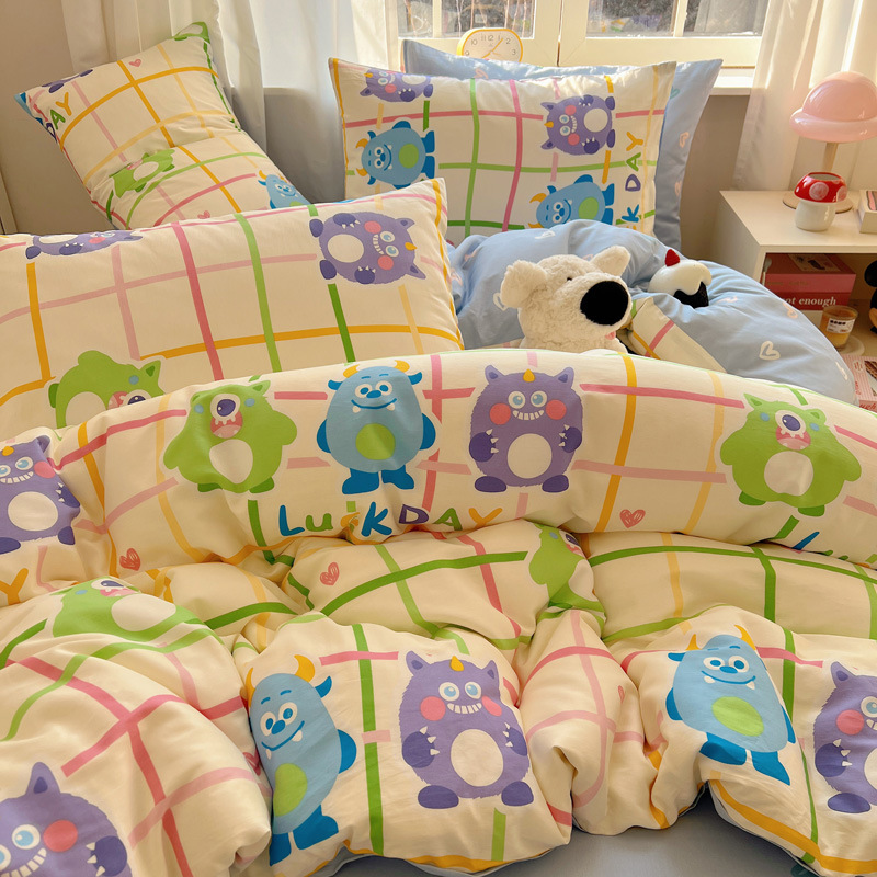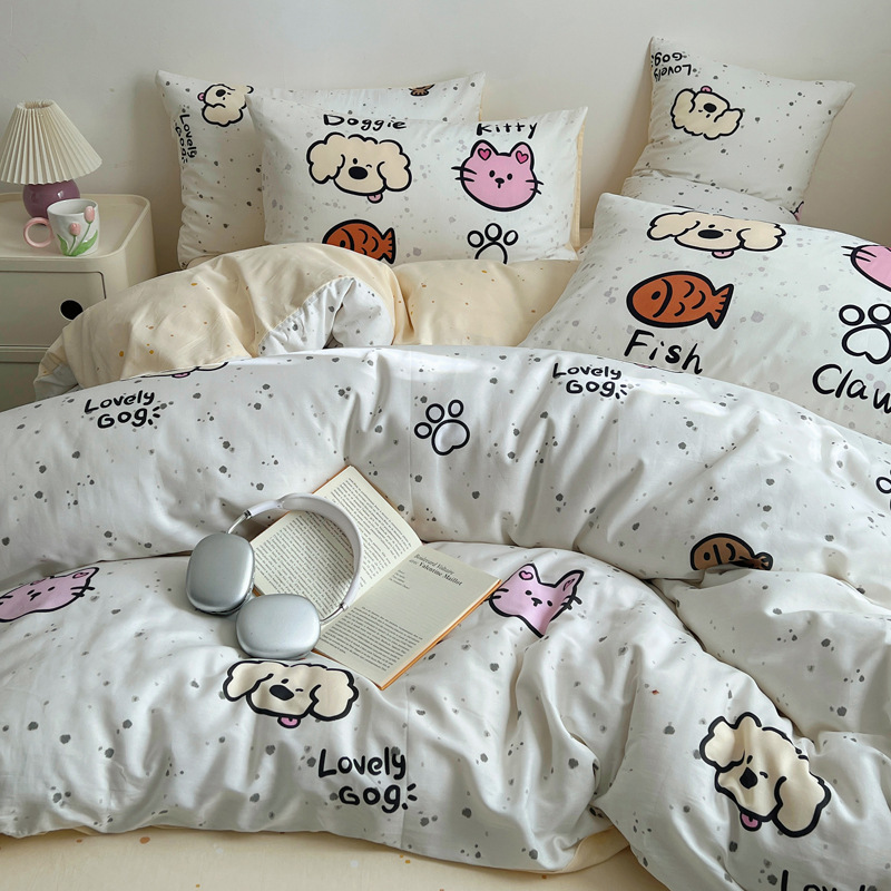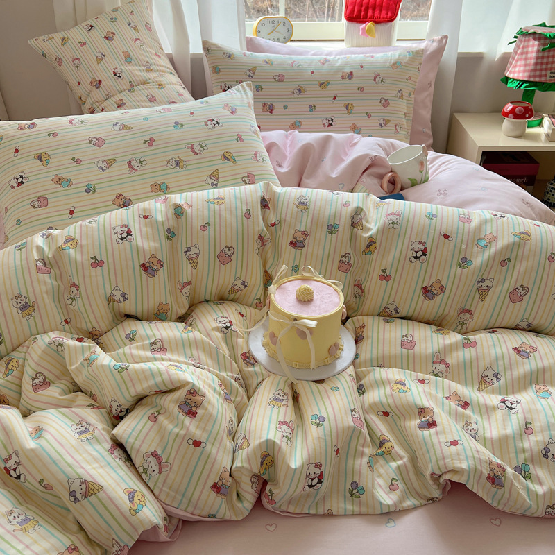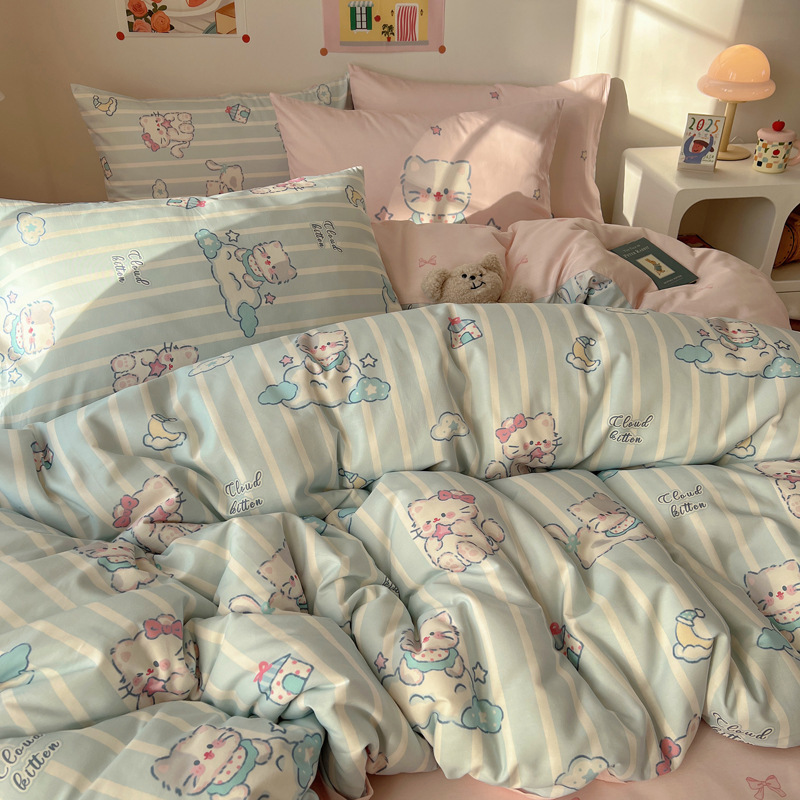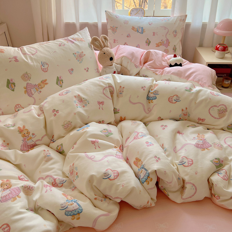 2025 봄 신간 스타일 만화 작은 신선한 면 4 피스 코튼 그물 레드 퀼트 커버 침대 시트 3 피스 세트