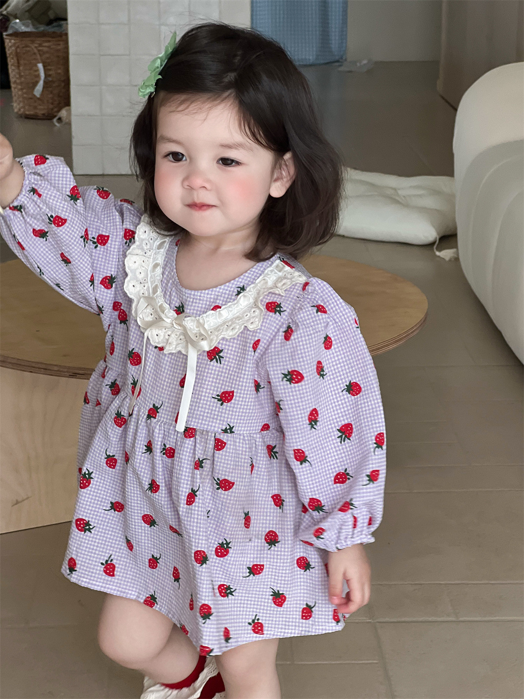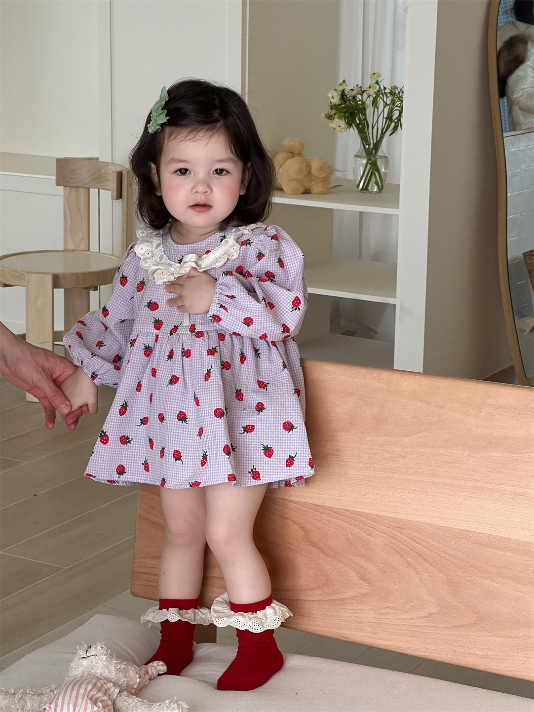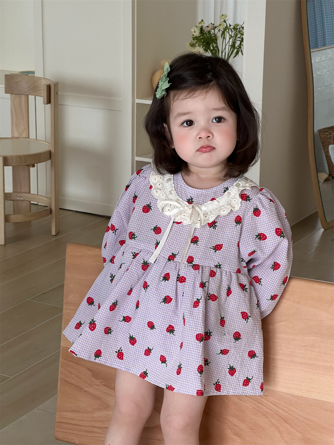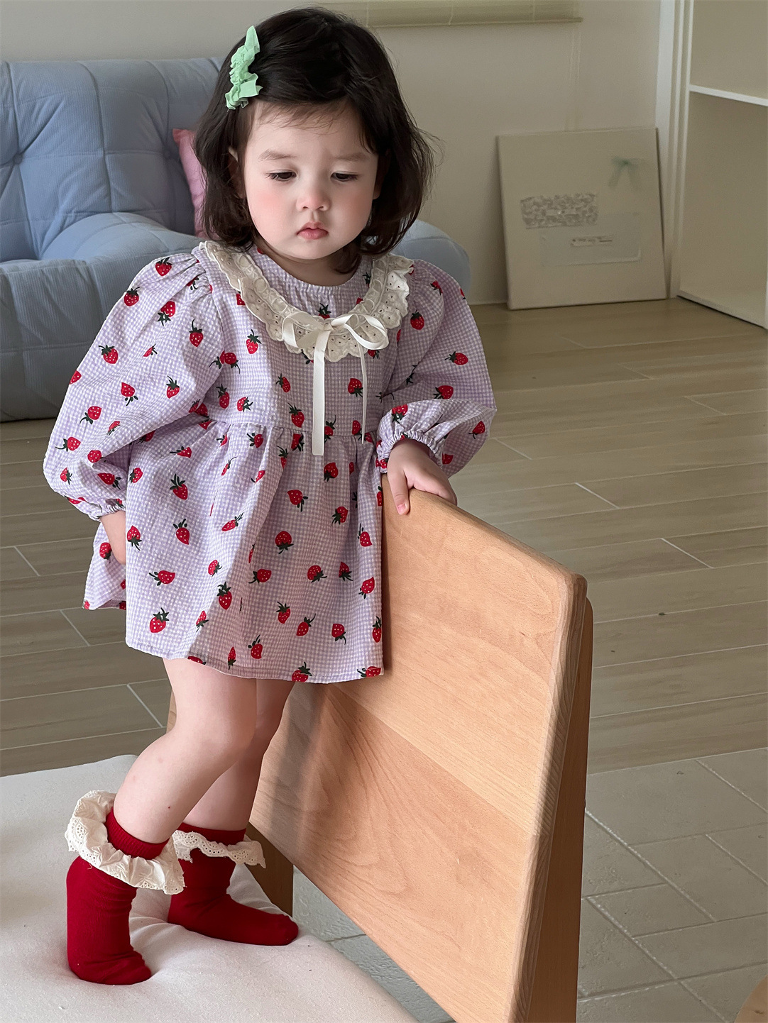 어린이 봄옷, 한국 스타일 아동복, 아기 레이스 원피스, 여아 봄 스커트, 딸기 공주 스커트