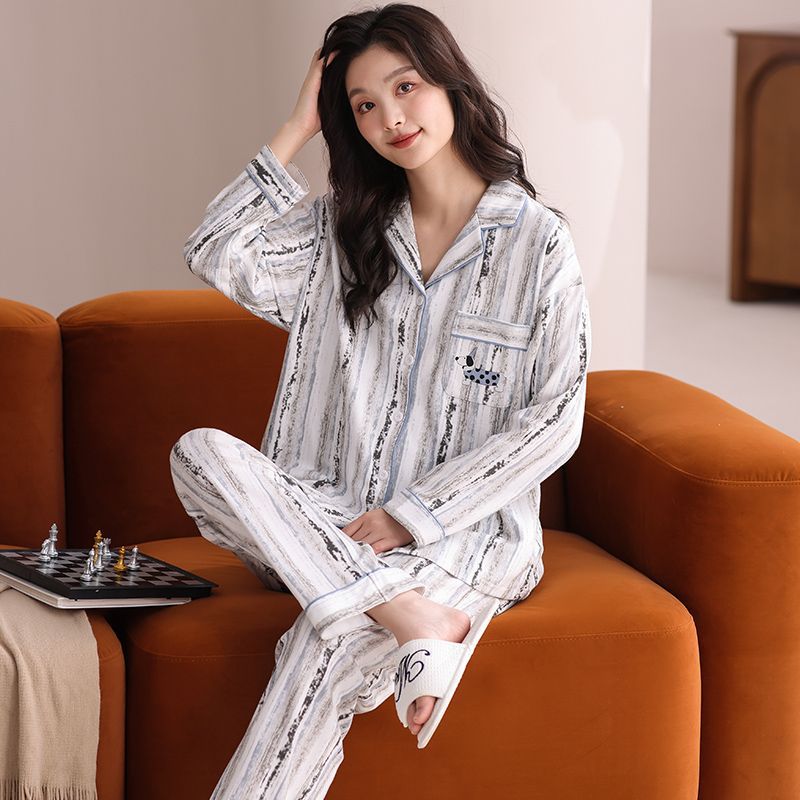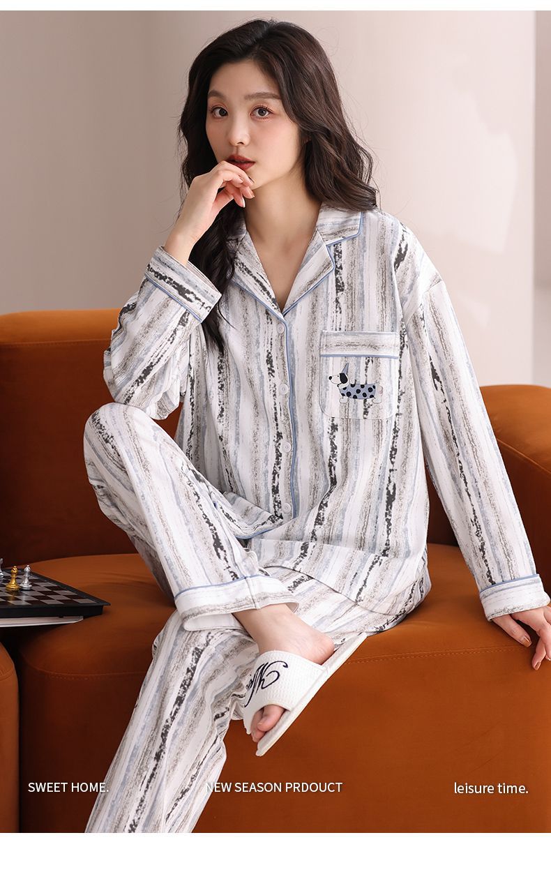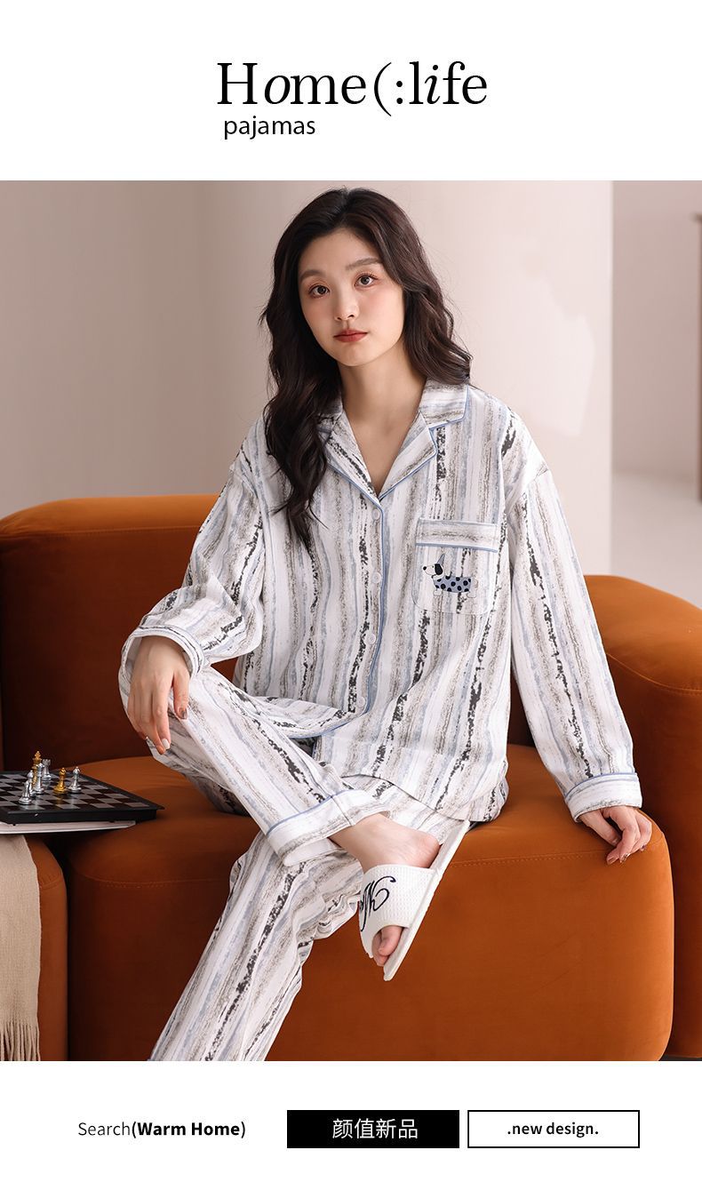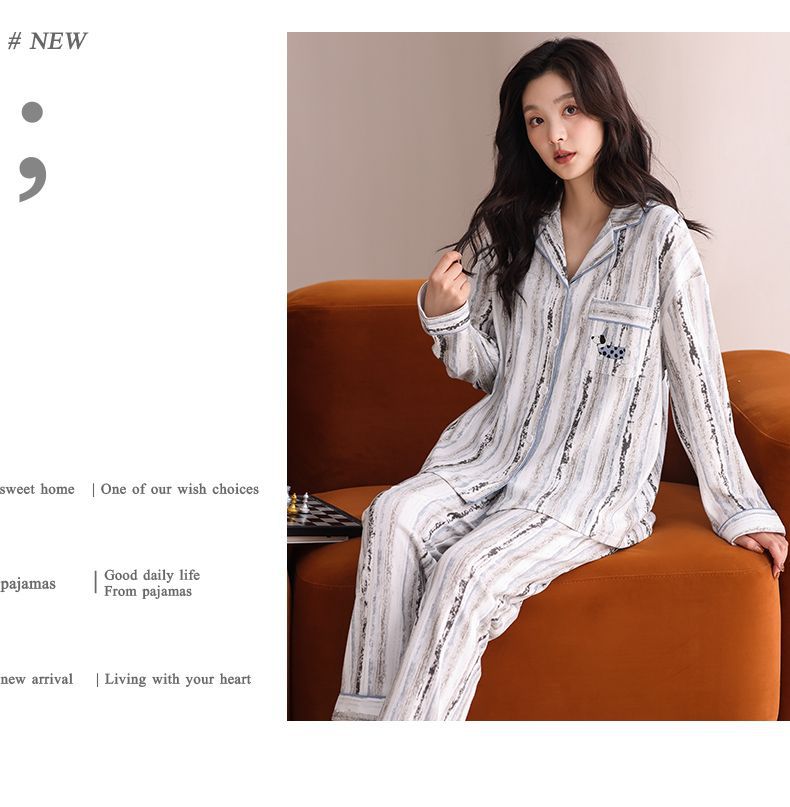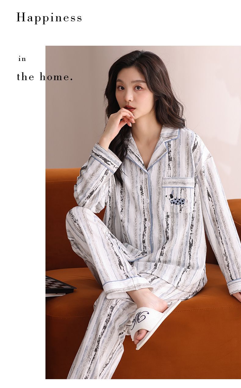 봄과 가을 새 잠옷 여성용 코튼 긴팔 간단한 하이 엔드 착용 편안한 투피스 홈 의류 세트스토어 가기