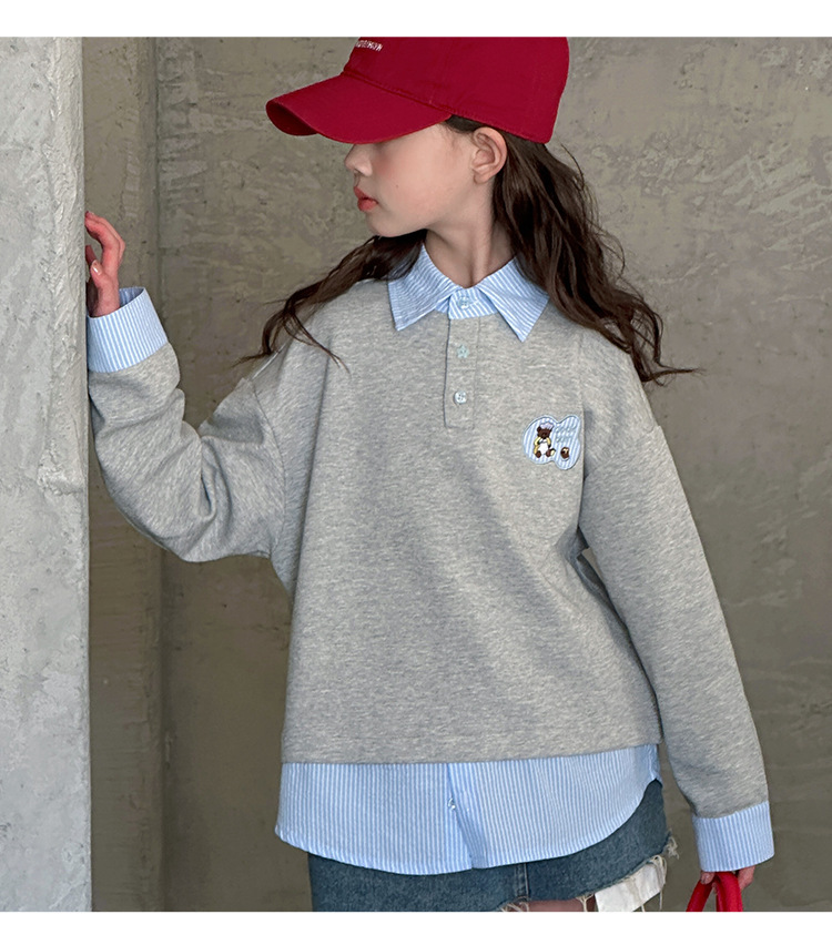 가짜 투피스 소녀 스웨터 2025 년 봄과 가을 새로운 도착 서양식 어린이 봄 옷 큰 어린이 셔츠 칼라 캐주얼 긴팔 탑