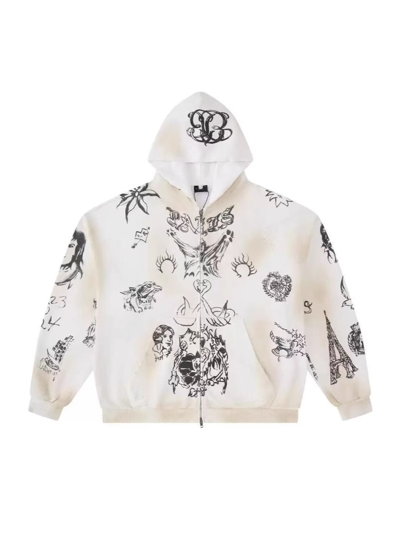 2025 폐기물 토양 바람 축구 합동 무거운 공예 손으로 그린 낙서 지퍼 코트 스웨터 느슨한 카디건