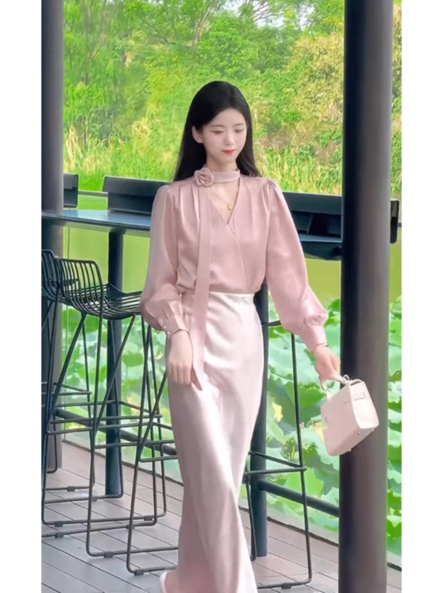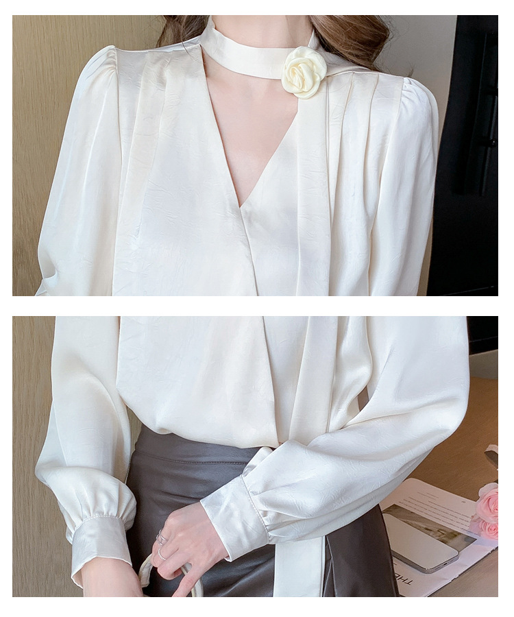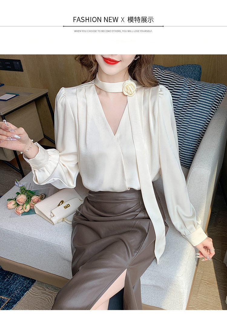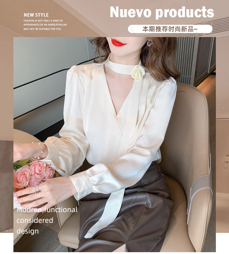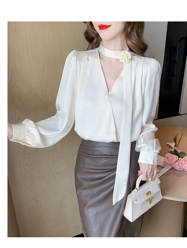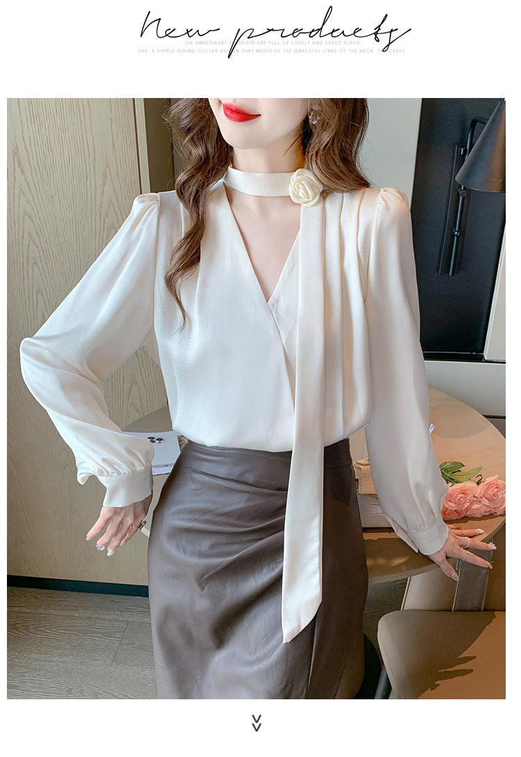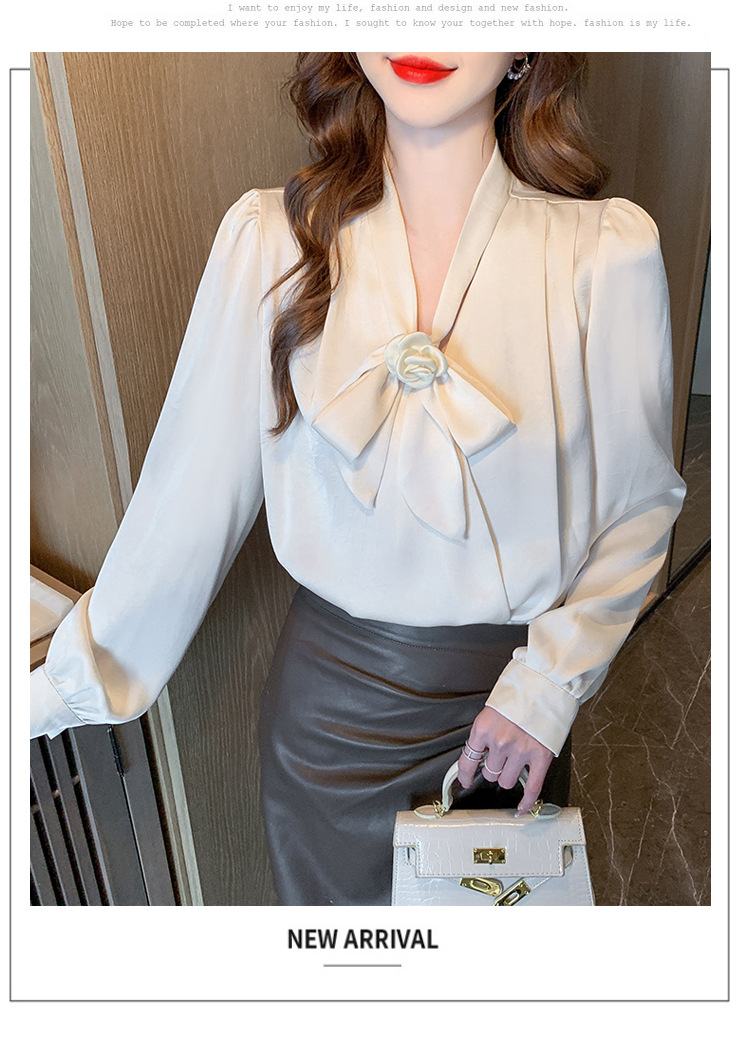 프랑스 V 넥 로즈 리본 긴팔 쉬폰 셔츠 여성의 가을 느슨한 슬리밍 아세테이트 새틴 셔츠 chic Top