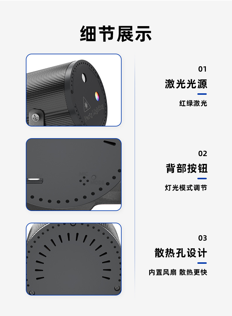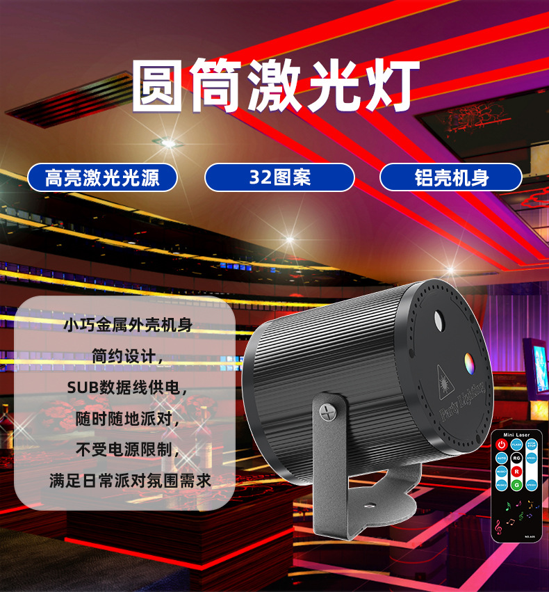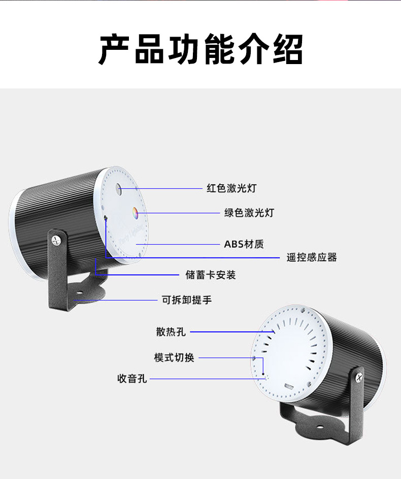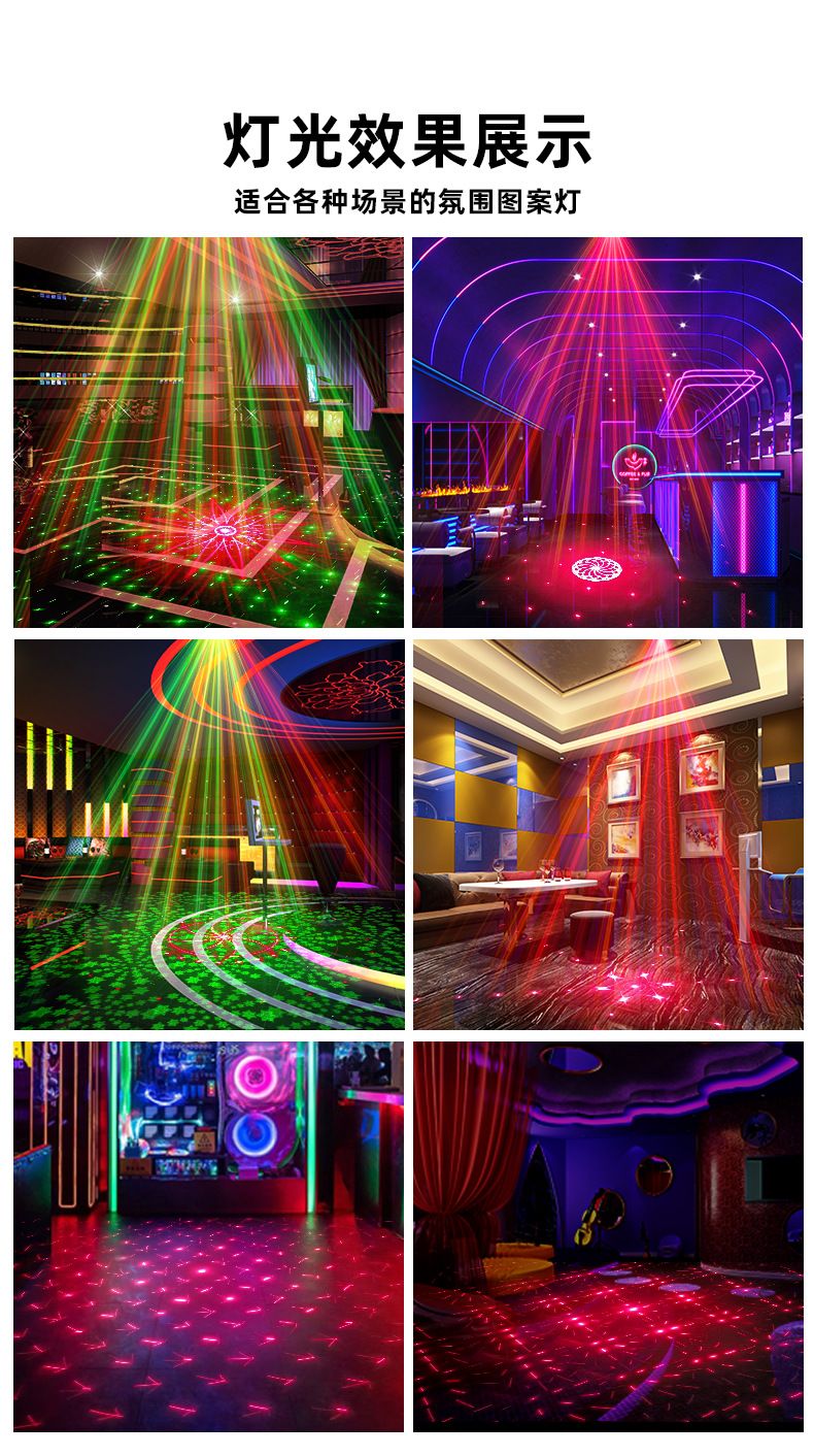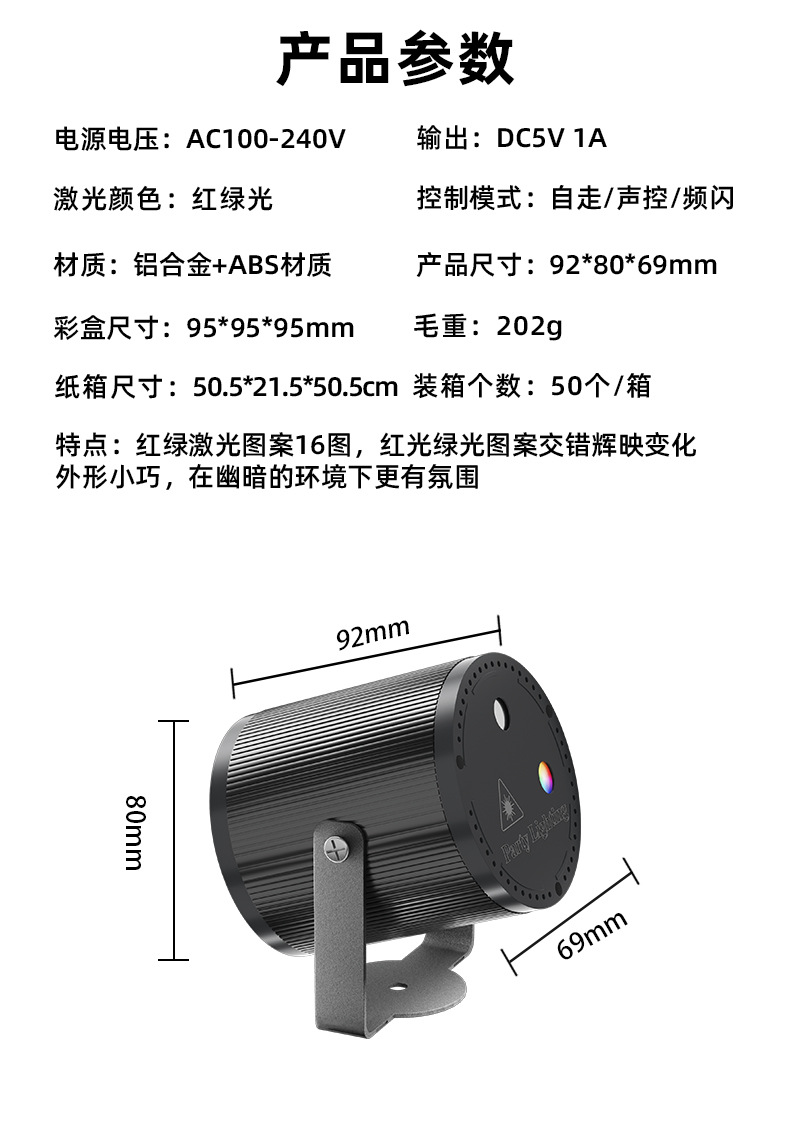 特点:红绿激光图案16图,红光绿光图案交错辉映变化,在幽暗的环境下更有氛围,外形小巧的设计,拿在手中,挂在墙上都会带来不同的体验。