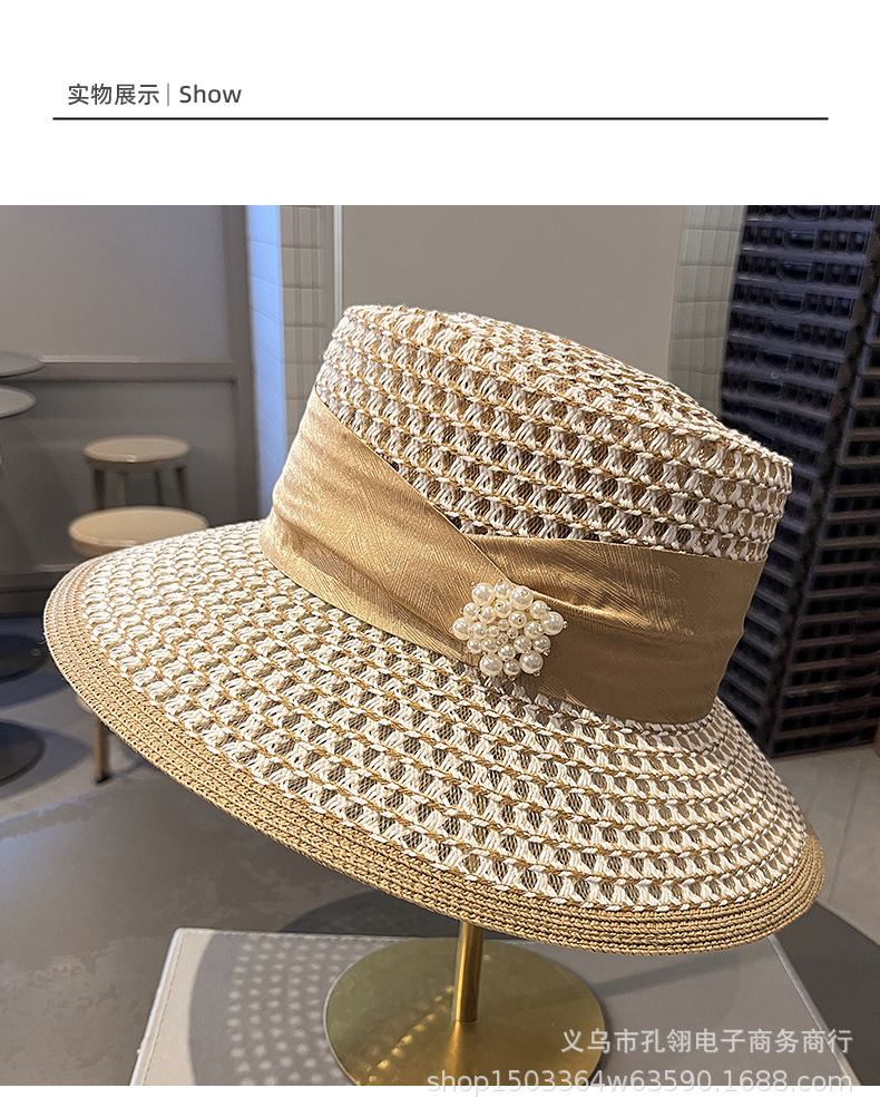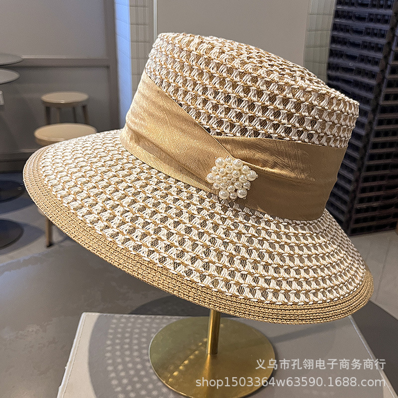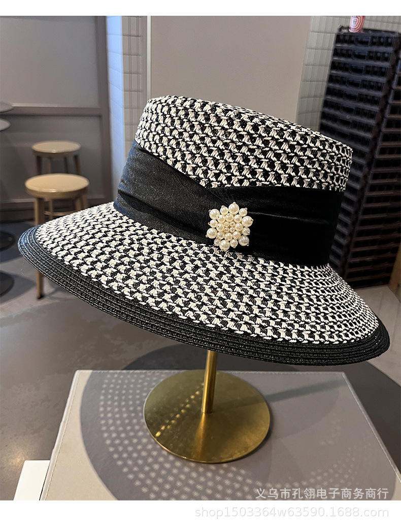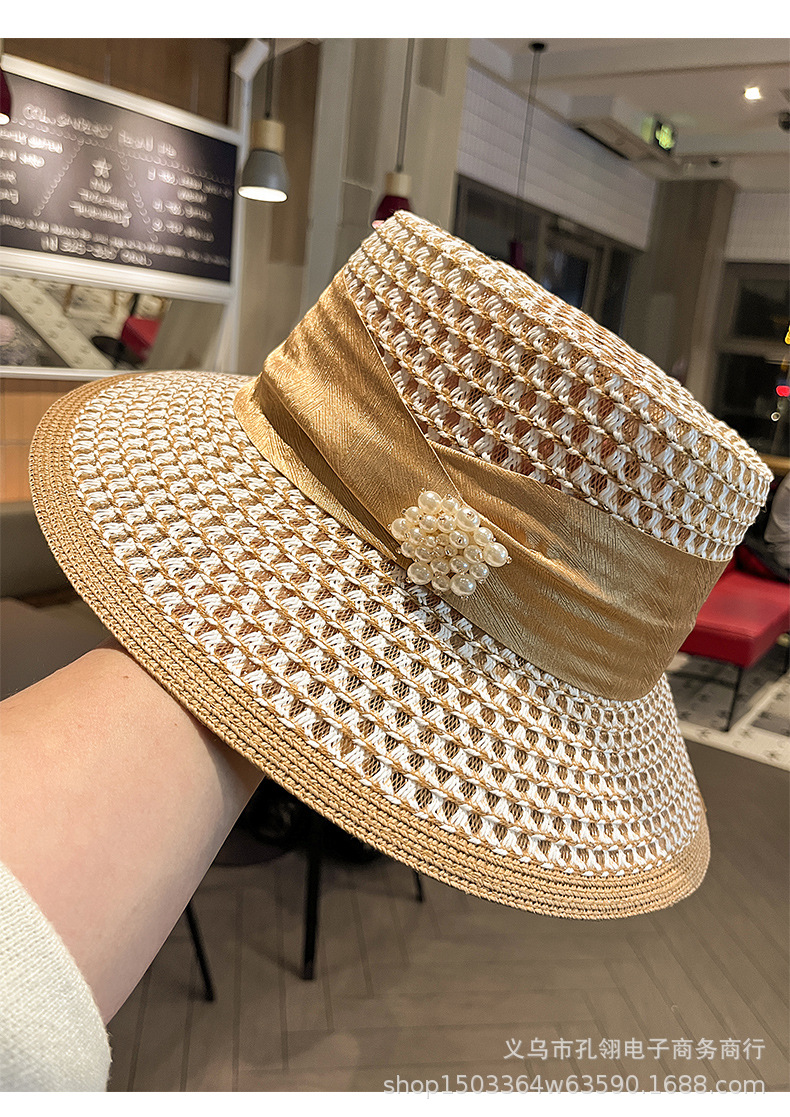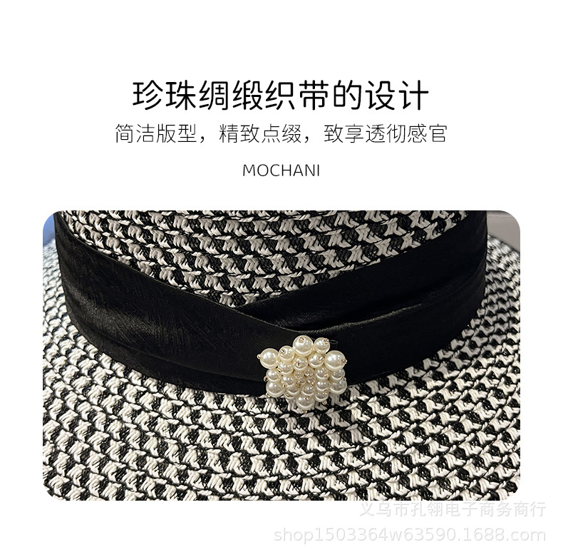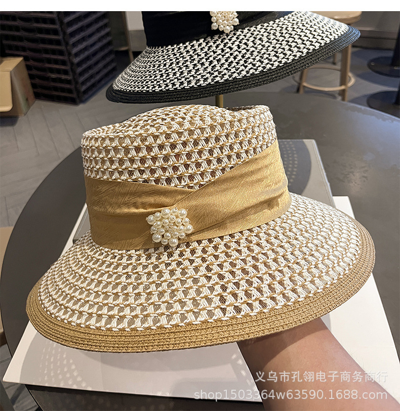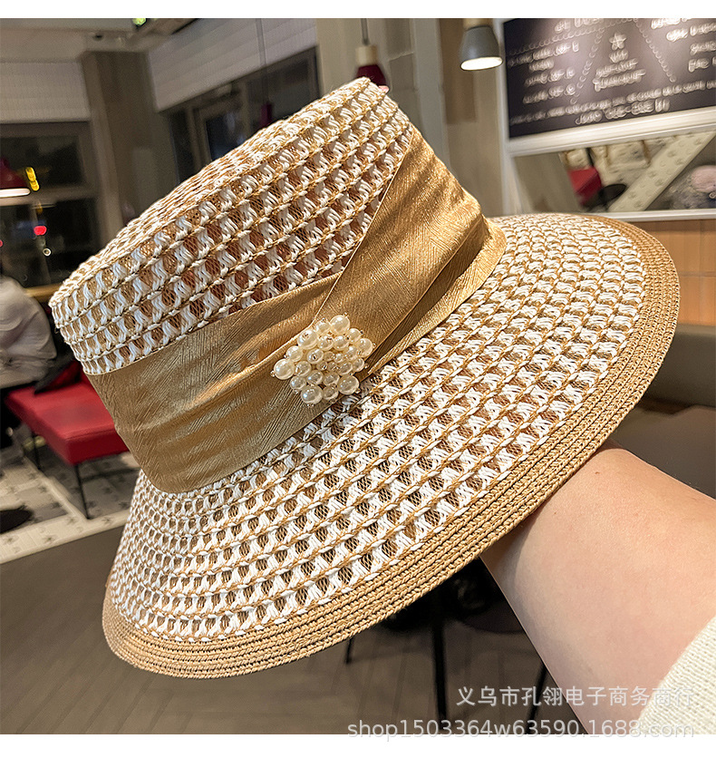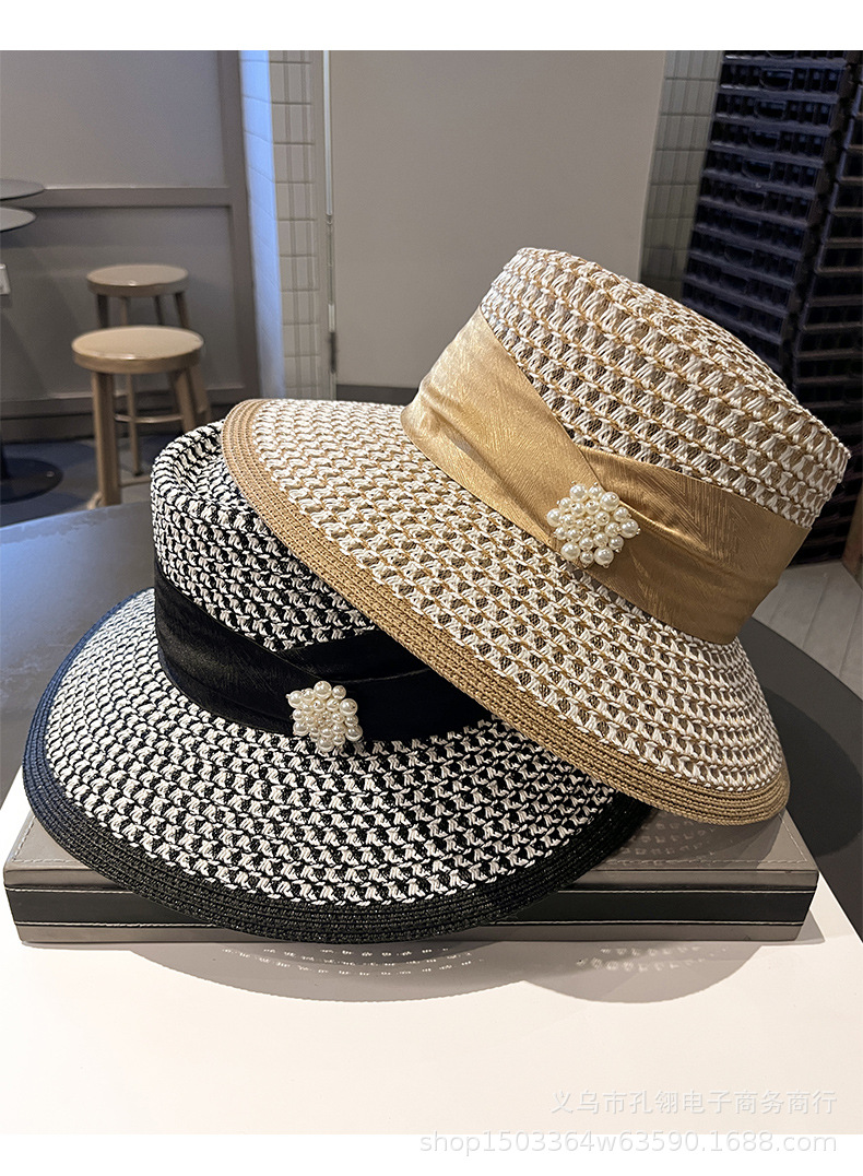 여름 새로운 할로우 통기성 플랫 탑 밀짚 모자 여성의 프랑스 스타일 여성 스타일 우아한 올 매치 탑 모자 얼굴 작은 태양 모자스토어 가기