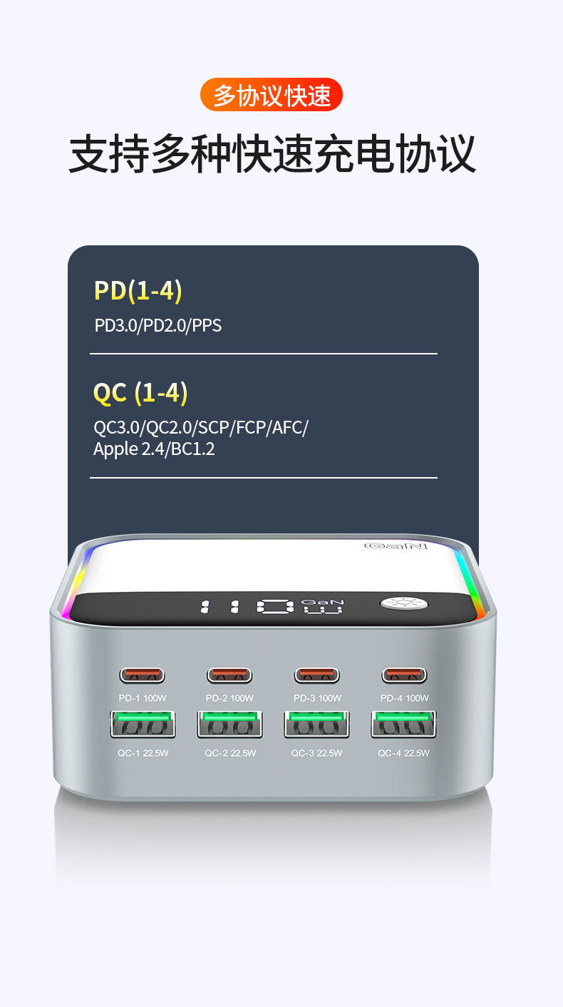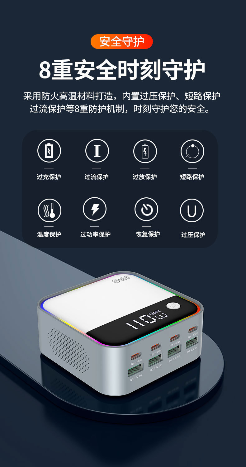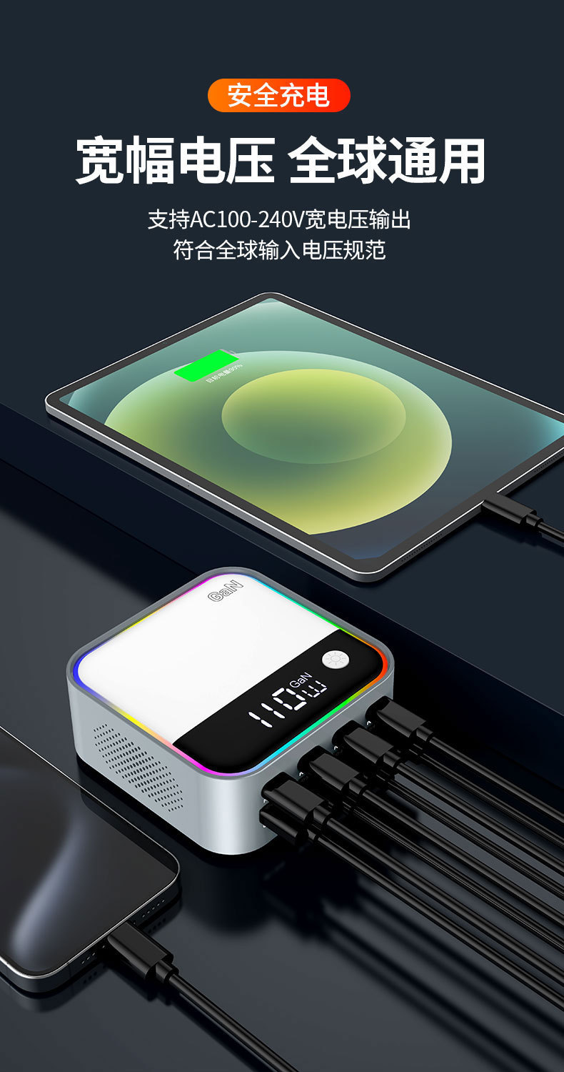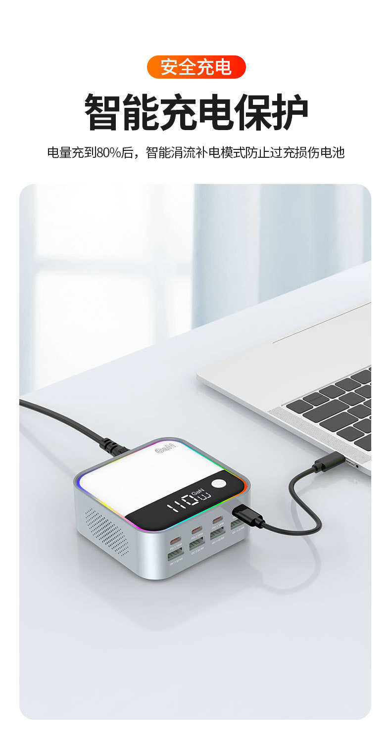 새로운 120W 데스크탑 충전기 휴대 전화 노트북 범용 PD100W 빠른 충전 디지털 디스플레이 RGB 멀티 컬러 분위기 빛
