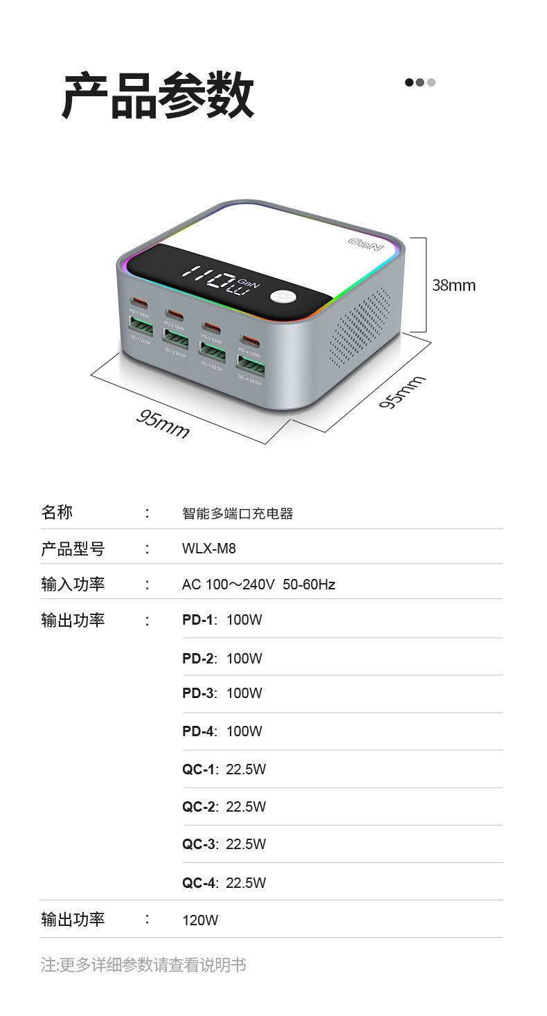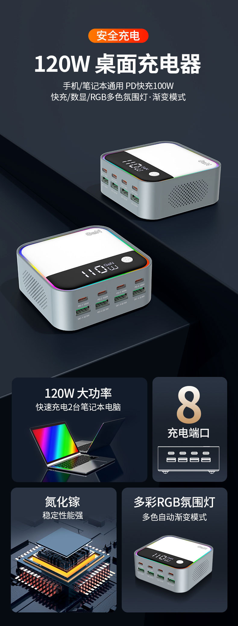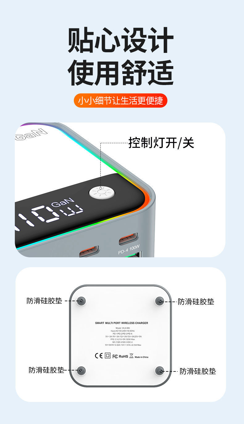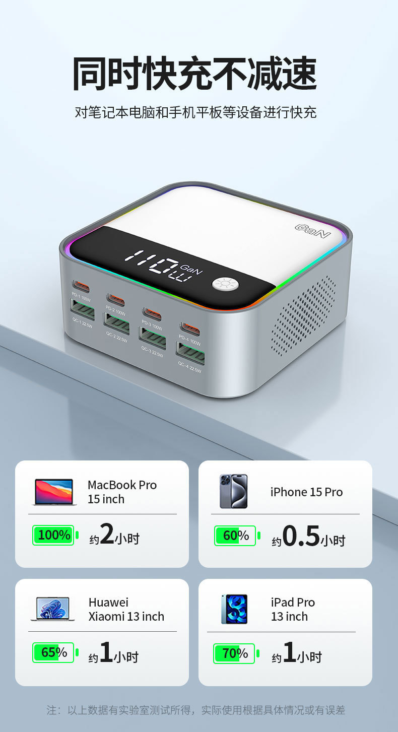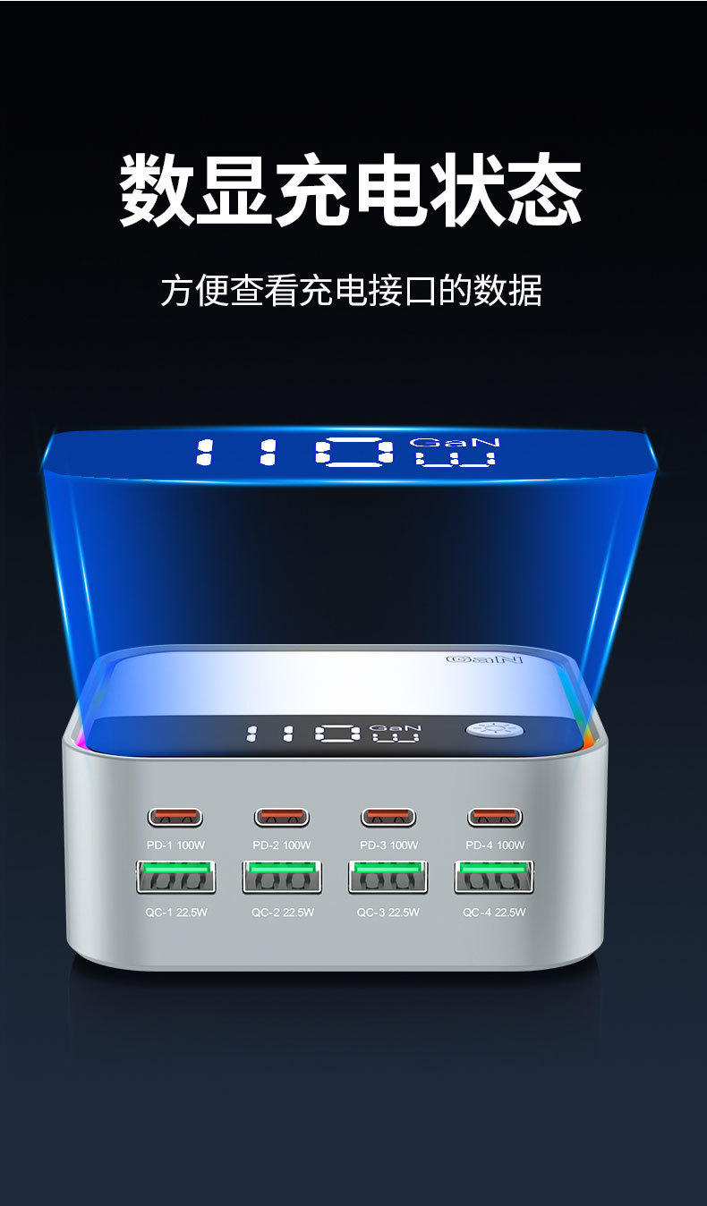 새로운 120W 데스크탑 충전기 휴대 전화 노트북 범용 PD100W 빠른 충전 디지털 디스플레이 RGB 멀티 컬러 분위기 빛