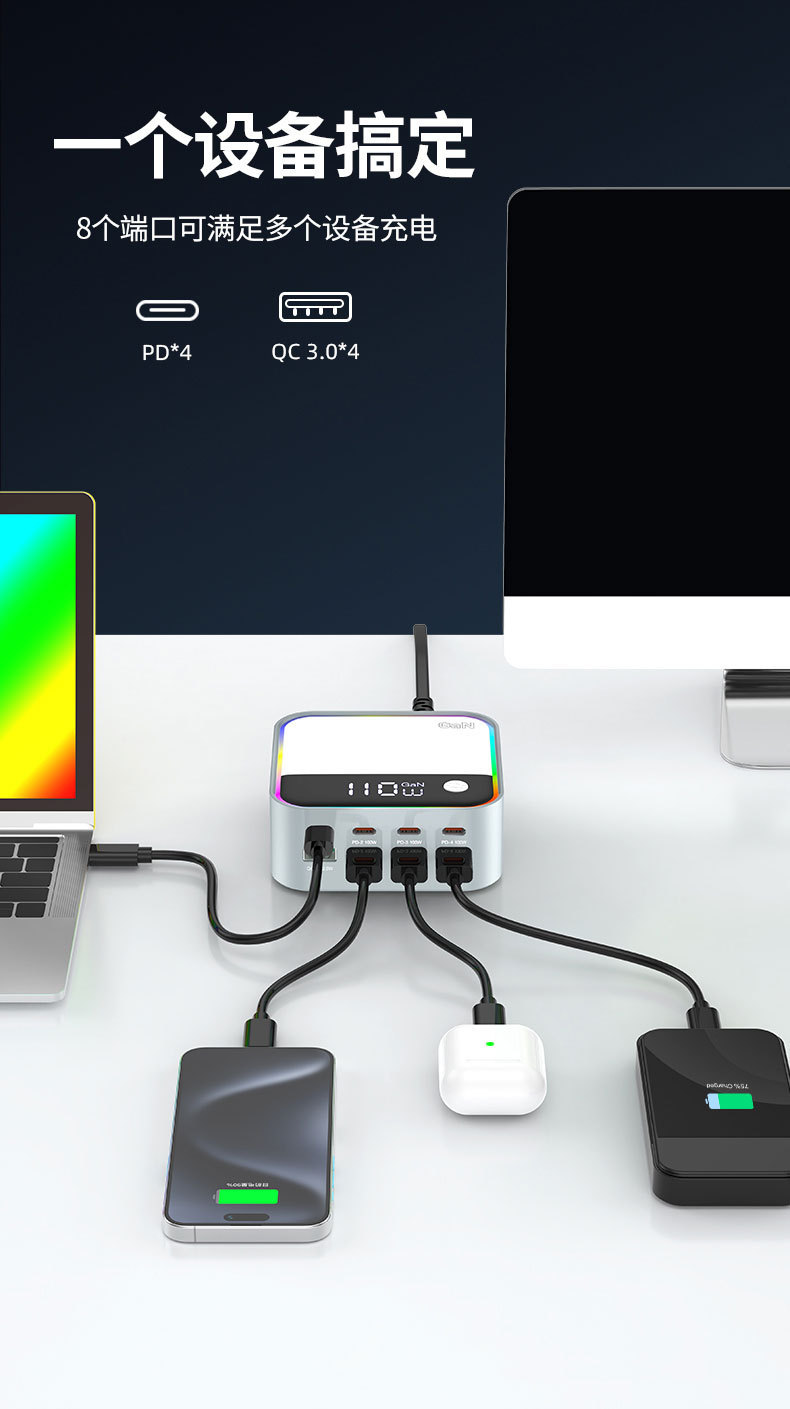 새로운 120W 데스크탑 충전기 휴대 전화 노트북 범용 PD100W 빠른 충전 디지털 디스플레이 RGB 멀티 컬러 분위기 빛스토어 가기