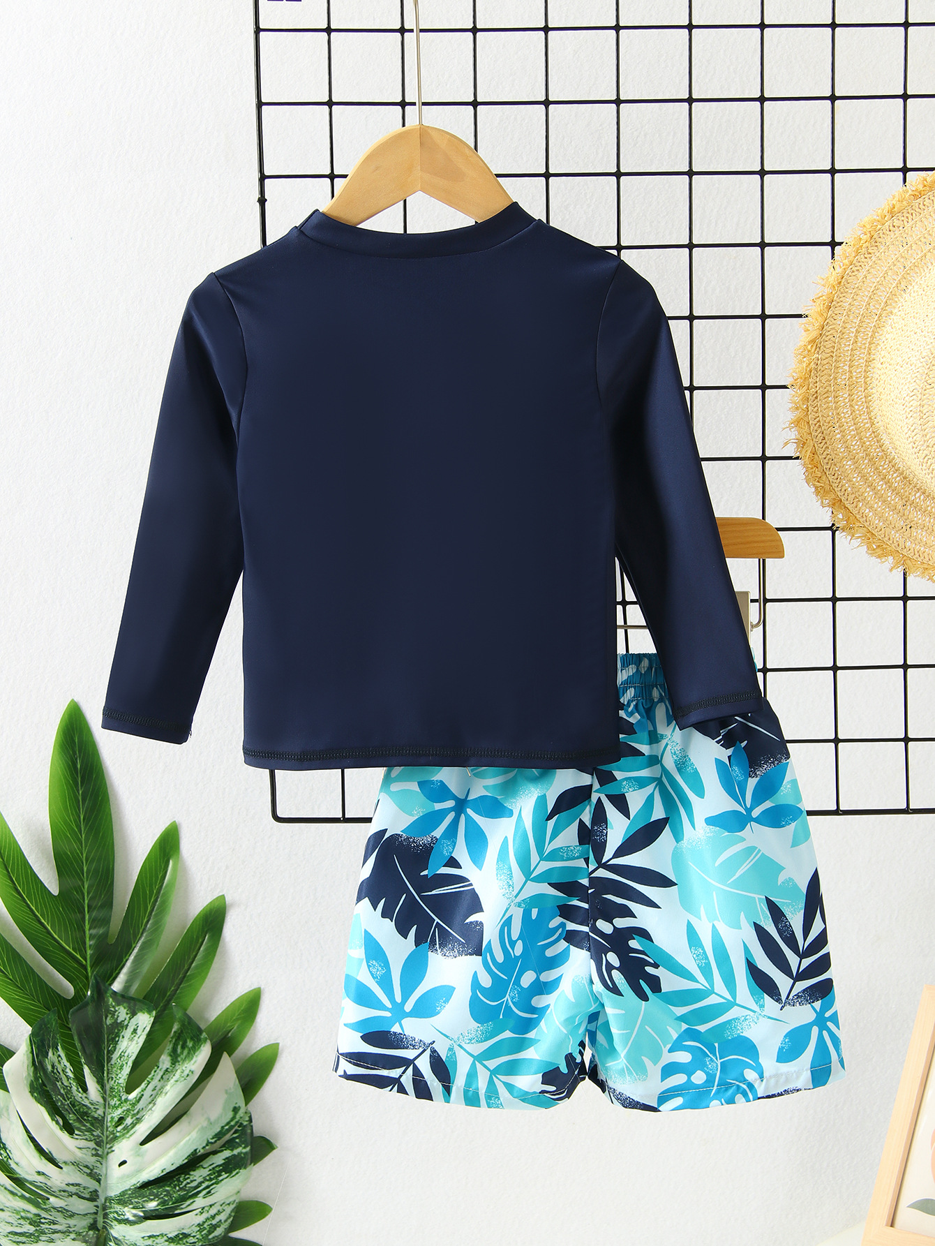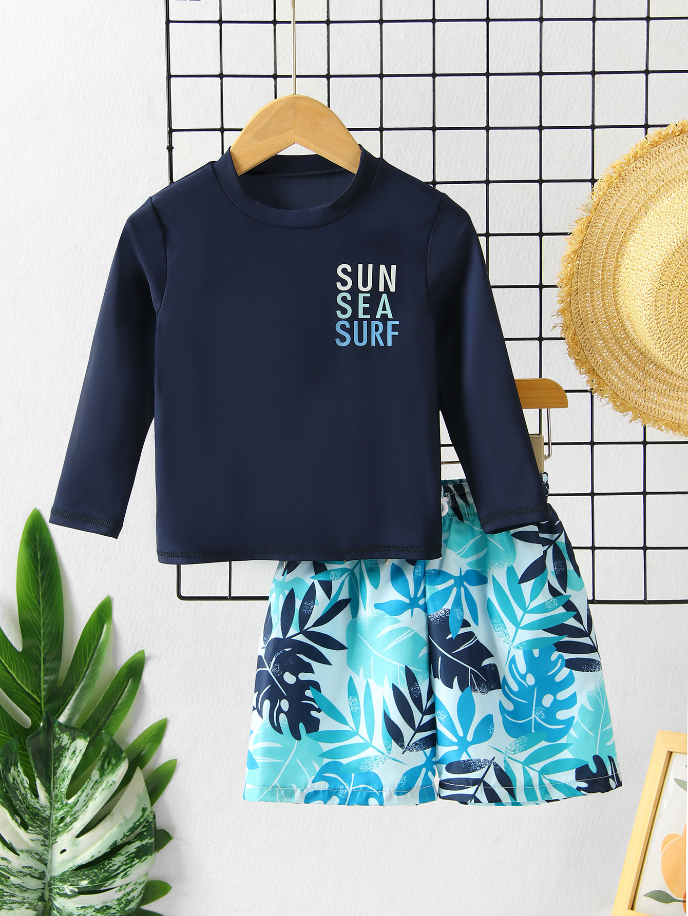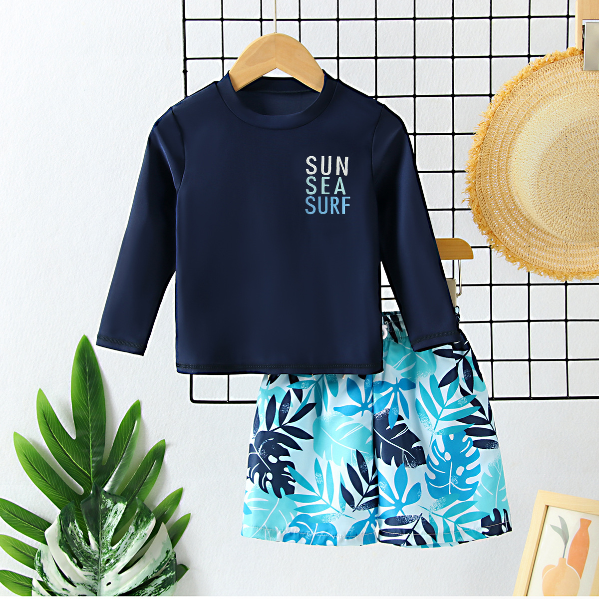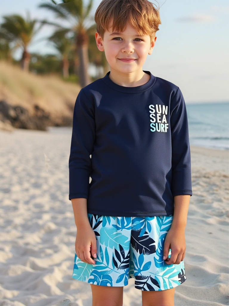 아동 수영복 소년 긴팔 스플릿 수영복 2025 새로운 한국어 프린트 비치 바지 자외선 차단 소년 수영복
