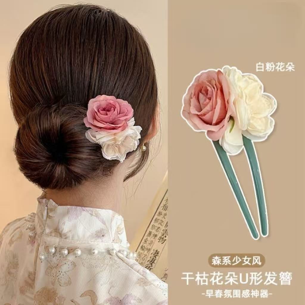 • 6060 플라워 U자형 비녀 - 화이트 핑크 플라워