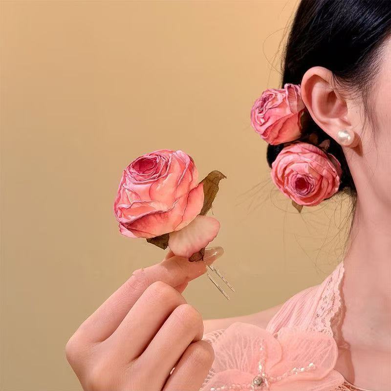 • 6054 핸드메이드 장미 머리핀-라즈베리 핑크