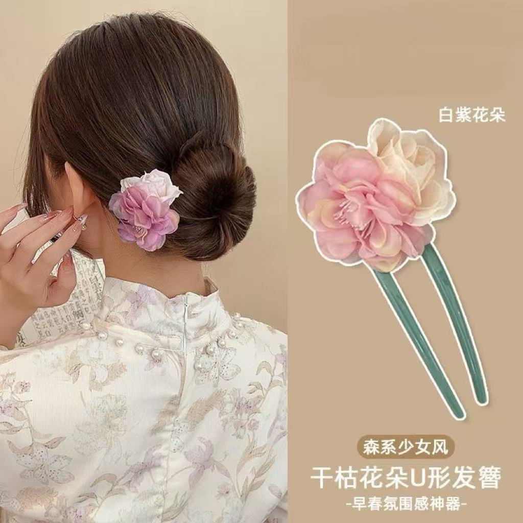 • 6060 플라워 U자형 비녀 - 화이트 & 퍼플 플라워