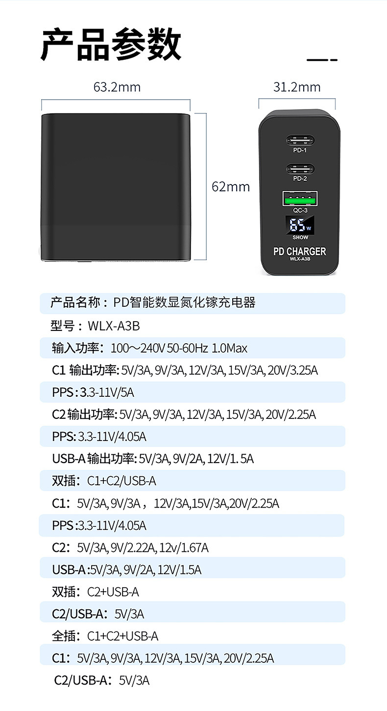 국경 간 갈륨 질화물 충전기 65W 디지털 디스플레이 지원 휴대 전화 태블릿 노트북 고전력 충전 헤드