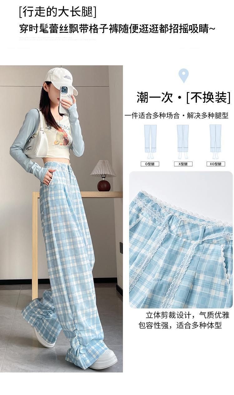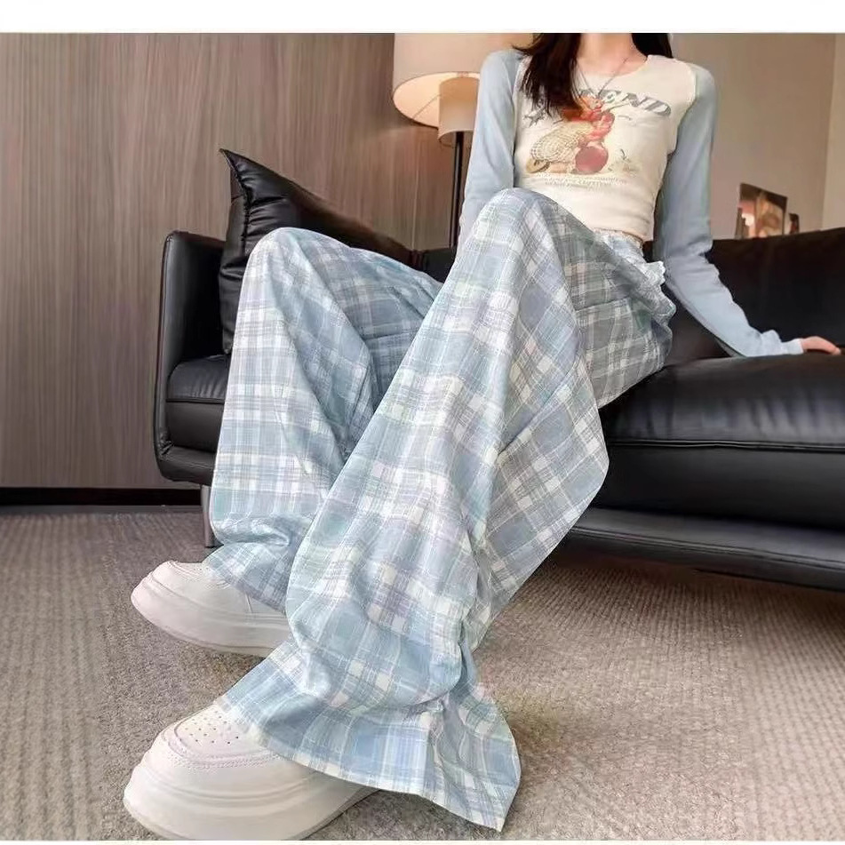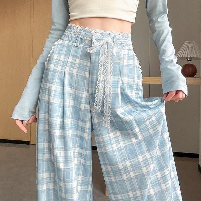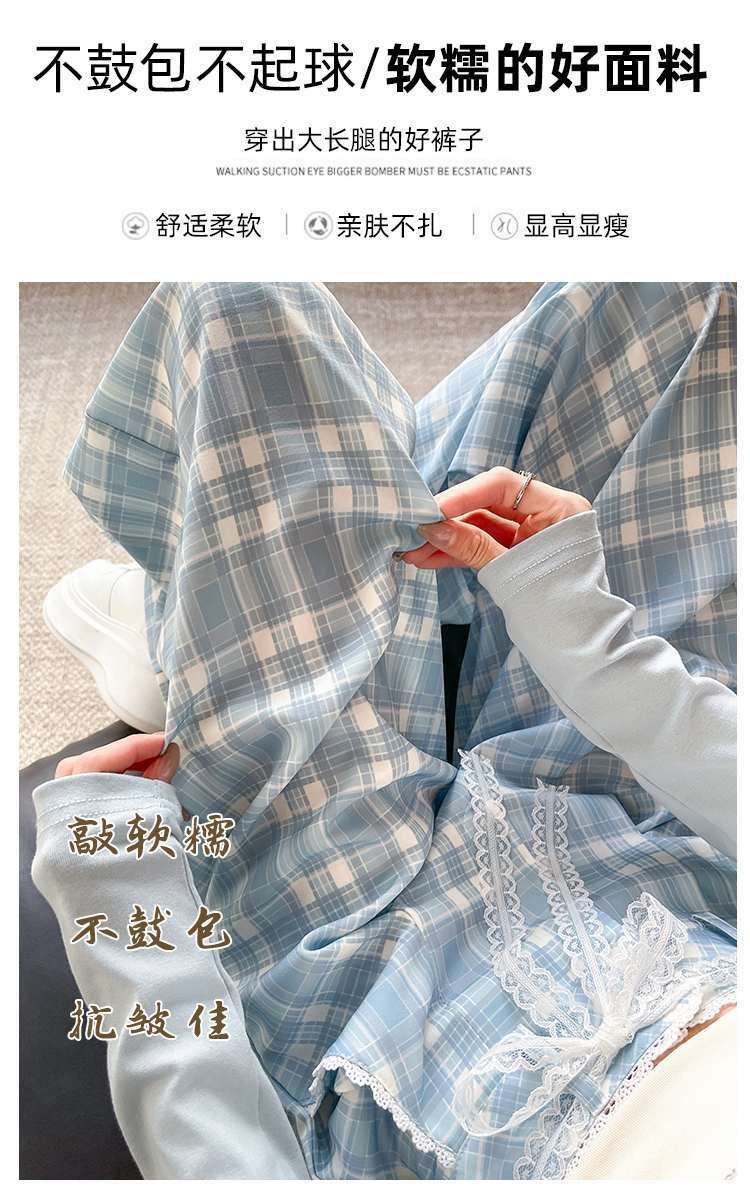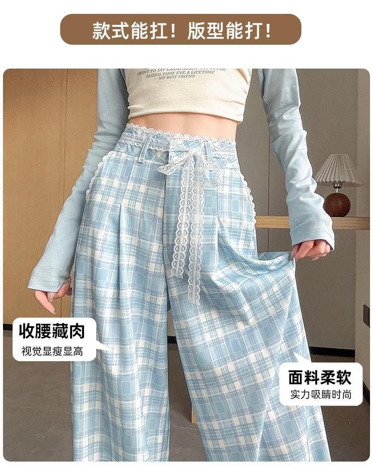 한국 스타일 레이스 느슨한 넓은 다리 바지 여성 가을 도파민 블루 격자 바지 게으른 슬리밍 캐주얼 바지