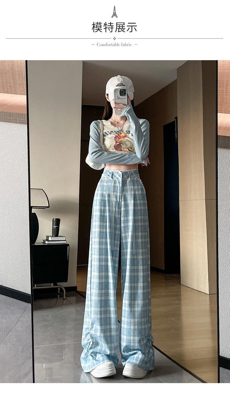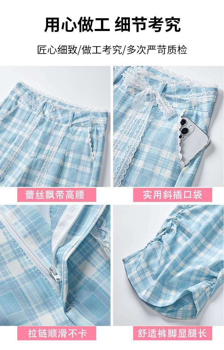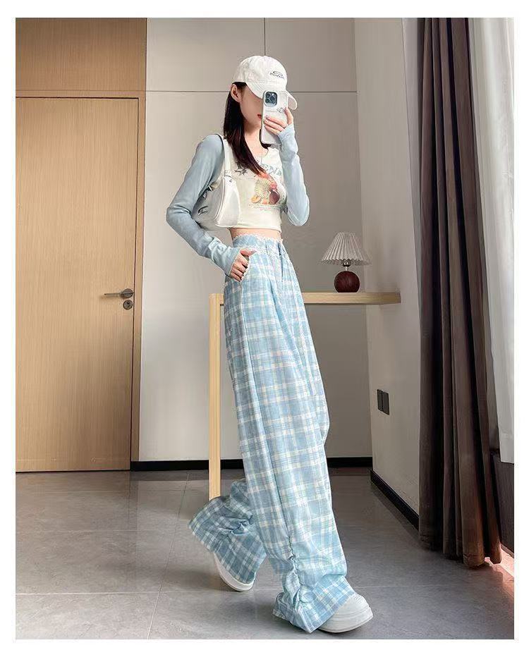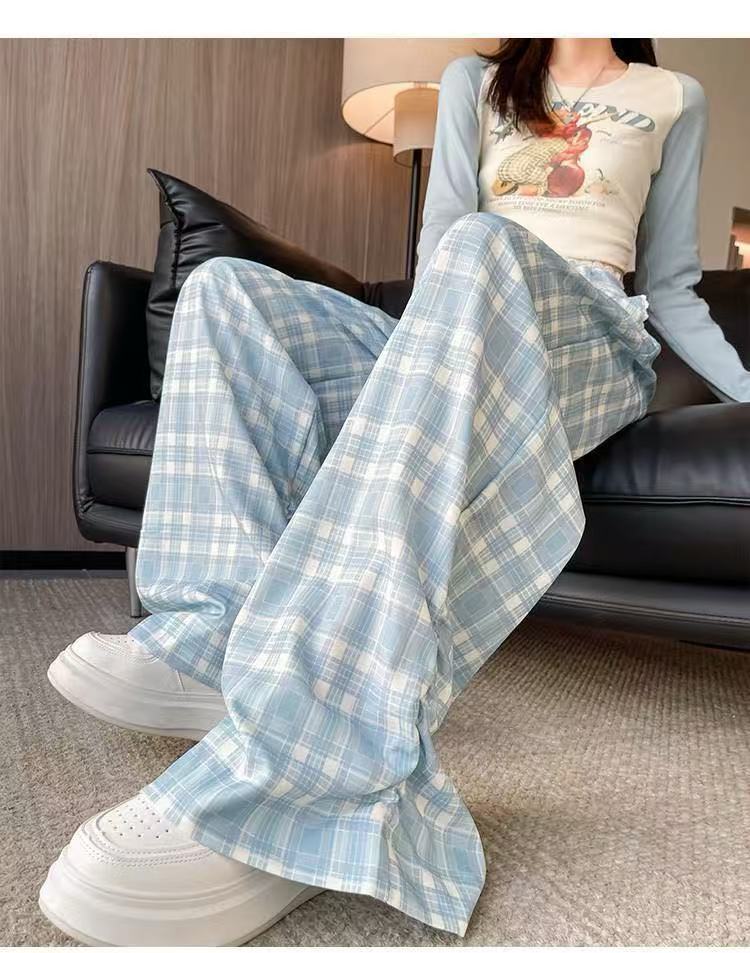 한국 스타일 레이스 느슨한 넓은 다리 바지 여성 가을 도파민 블루 격자 바지 게으른 슬리밍 캐주얼 바지