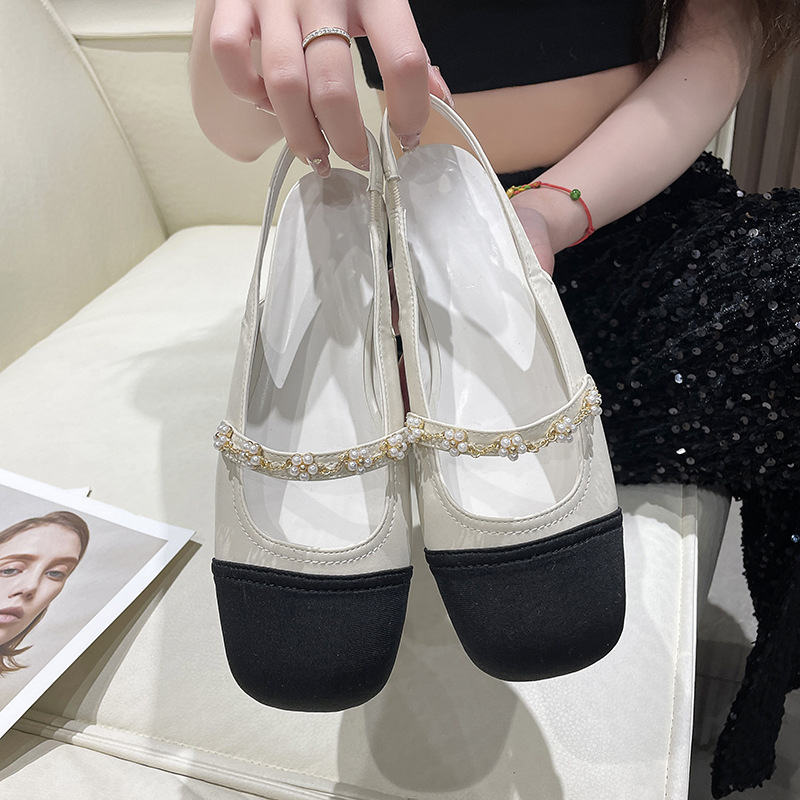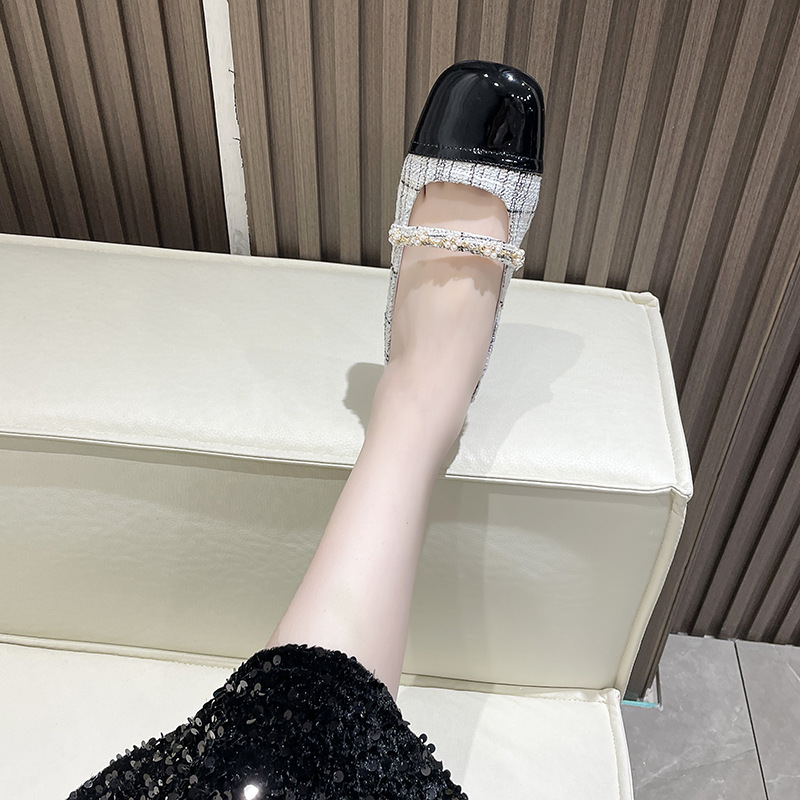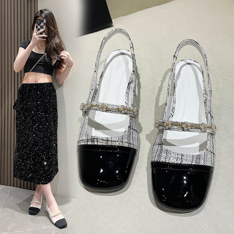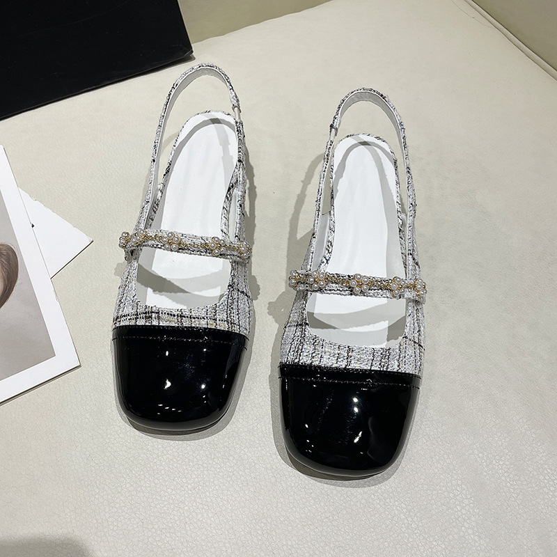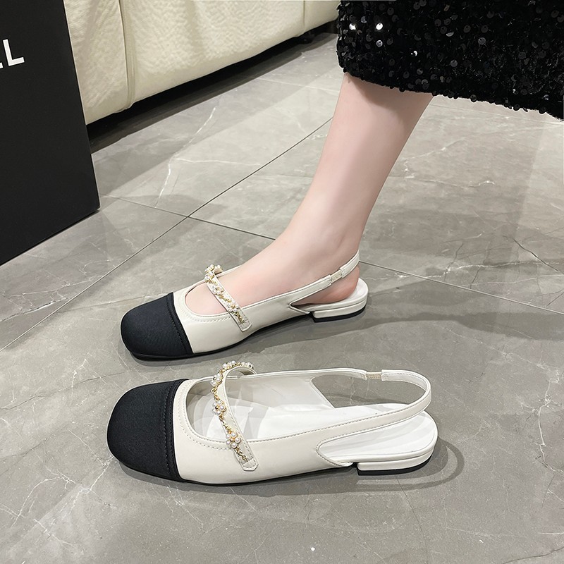 2025 여름 Elastomy Band Shallow Mouth 패션 싱글 레이어 신발 여성 스퀘어 토 작은 샤넬 스타일 스플 라이스 컬러 우아한 플랫 토 샌들
