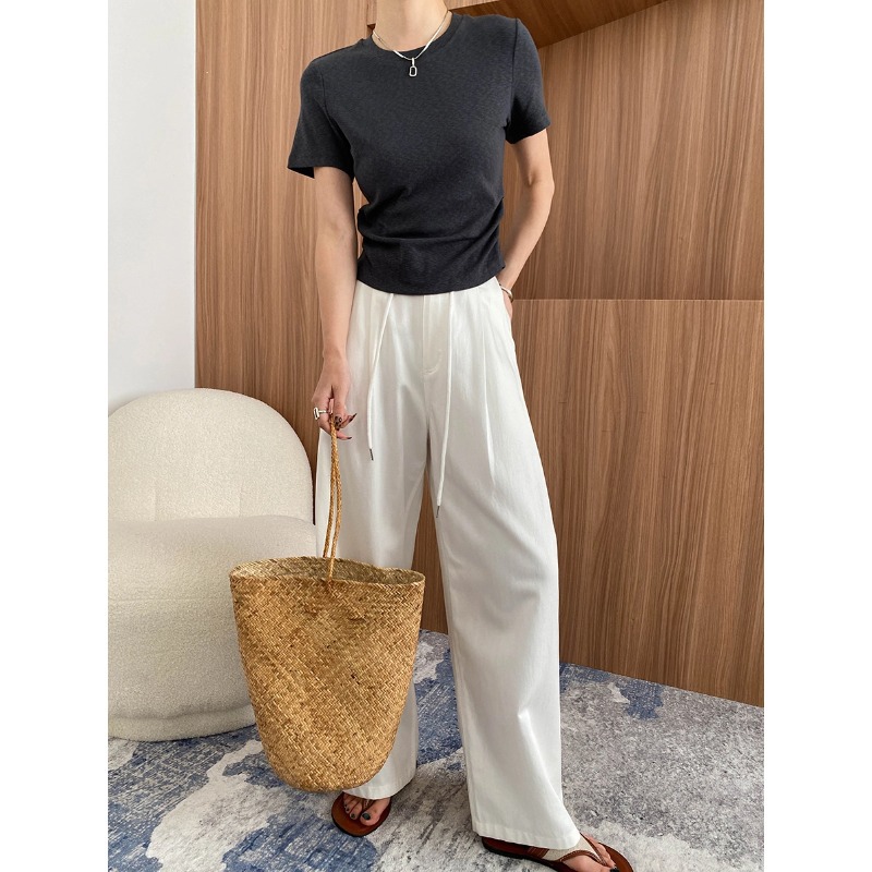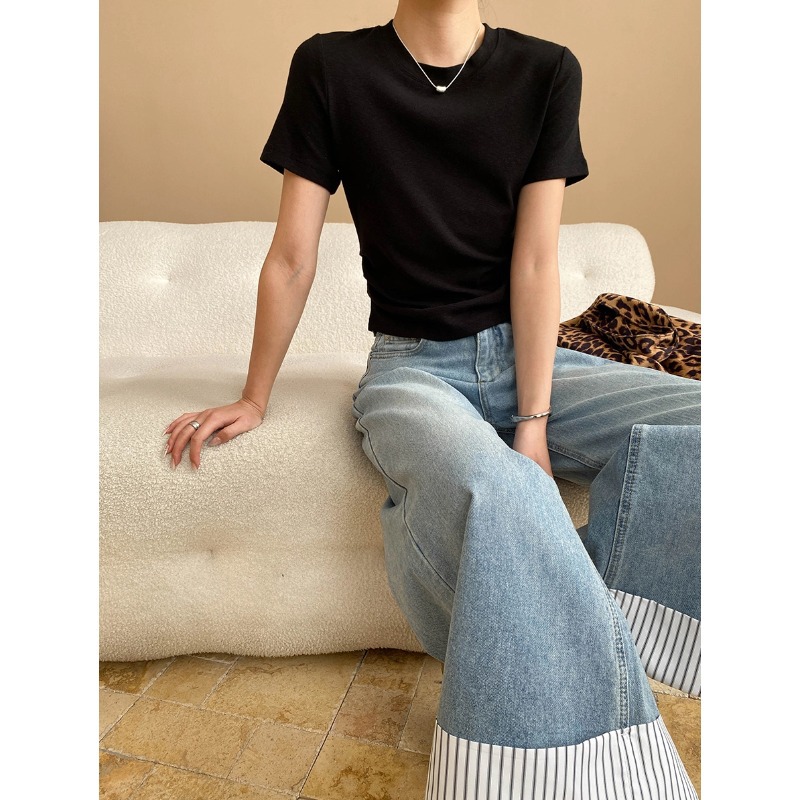신안 종이 사람 작은 남자 허리 디자인 주름 허리 슬림 어깨 승무원 목 짧은 소매 티셔츠 SN7263