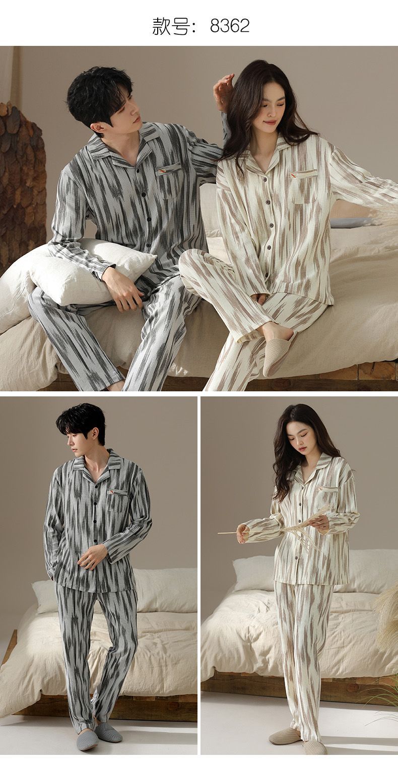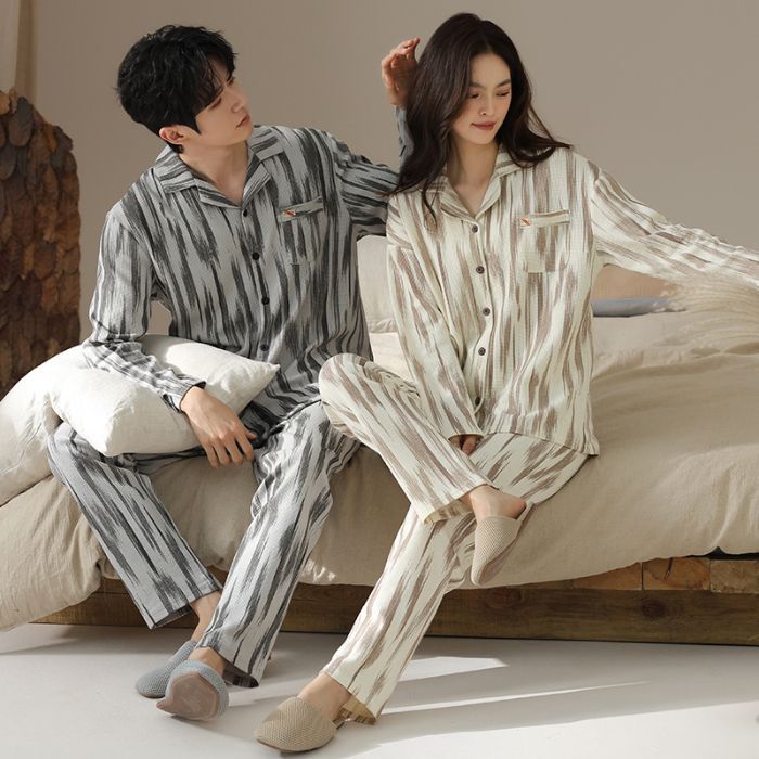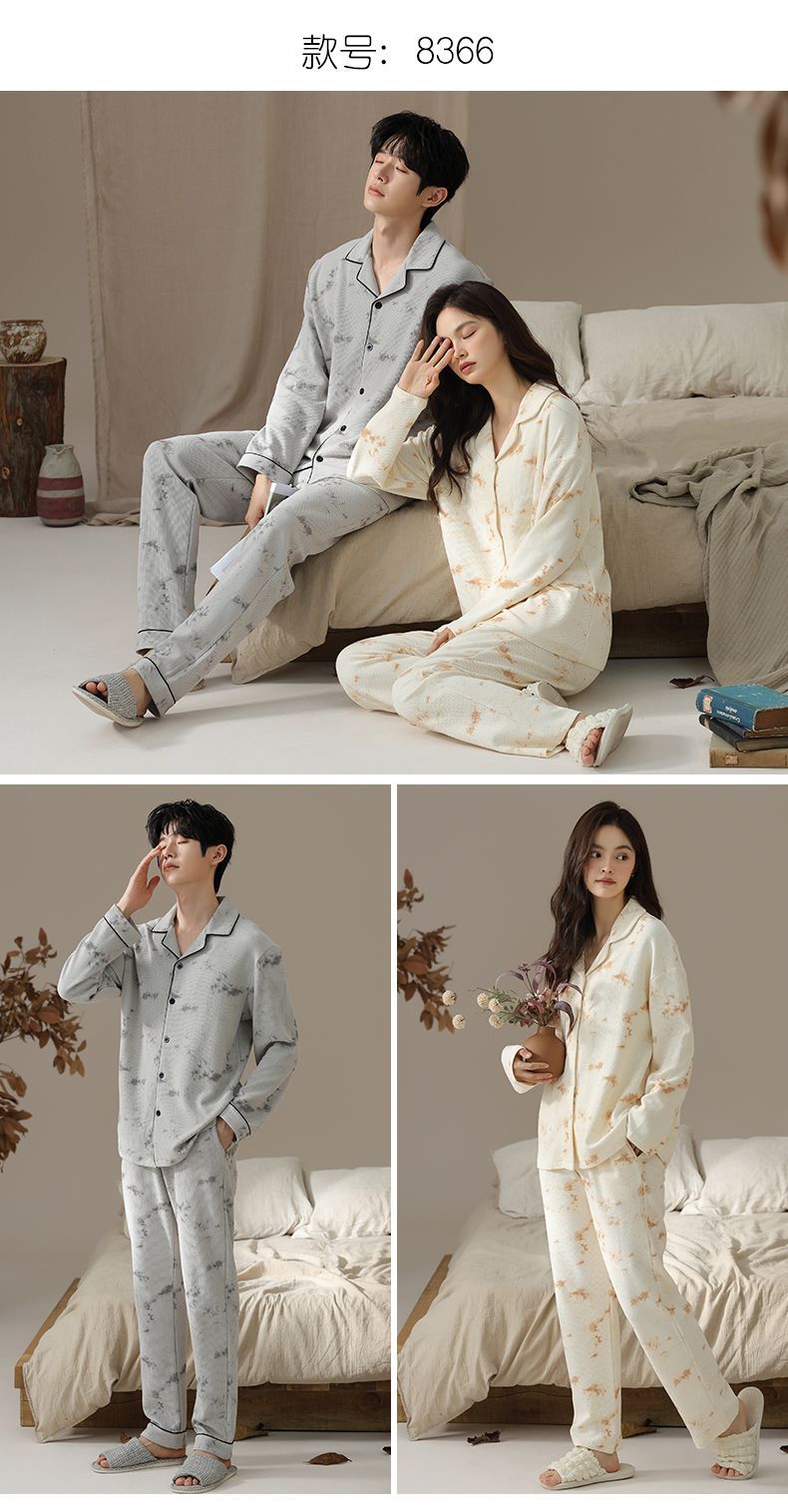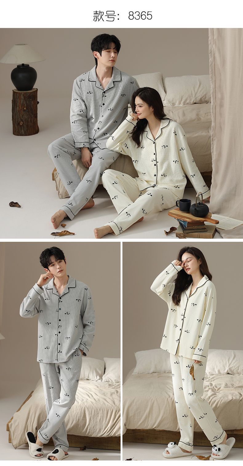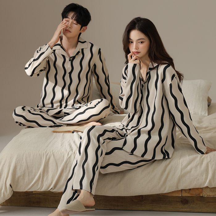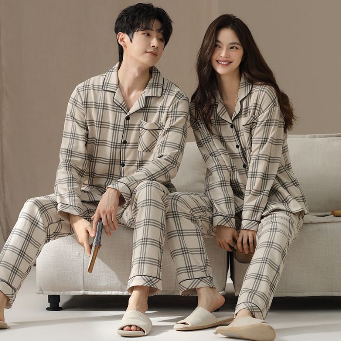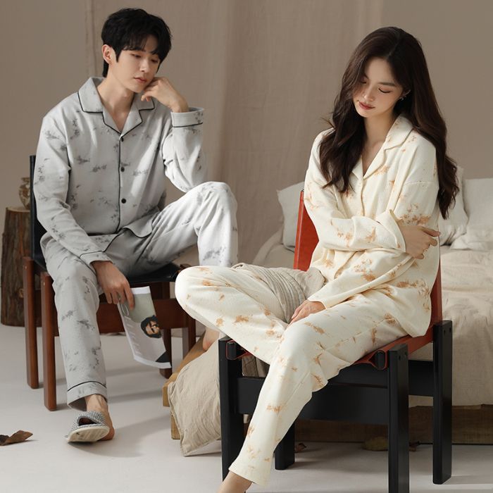 남성과 여성을위한 와플 퓨어 코튼 파자마 긴팔 부드러운 피부 친화적 인 봄과 가을 하이 엔드 커플 홈 의류 세트