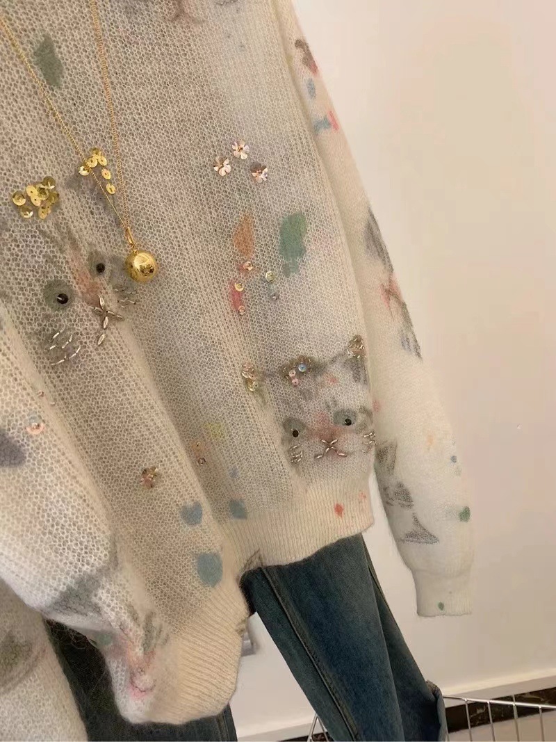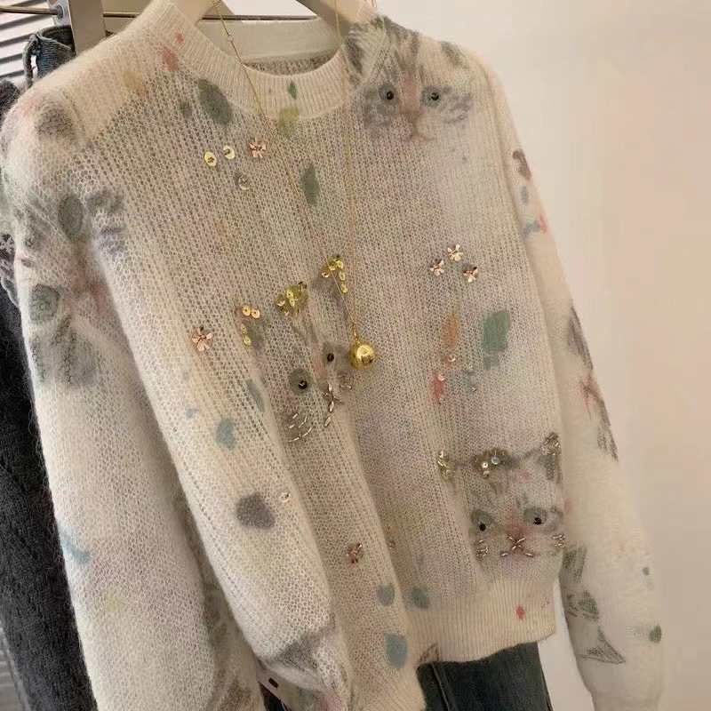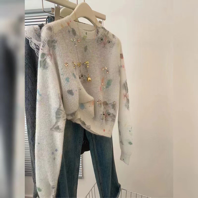 设计感猫咪印花钉株套头针织衫秋季温柔洋气减龄慵懒风女士毛衣秋