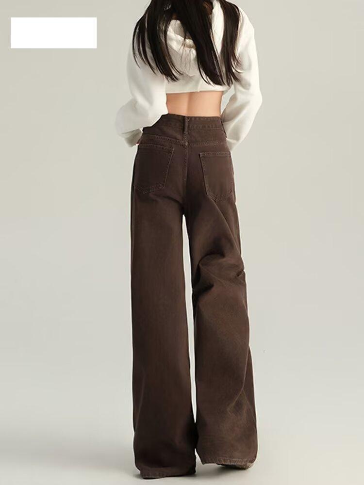 다크 브라운 와이드 레그 청바지 여자 2025 년 여름 새로운 하이 엔드 레트로 하이 웨이스트 루즈 올 매치 스트레이트 레그 바지