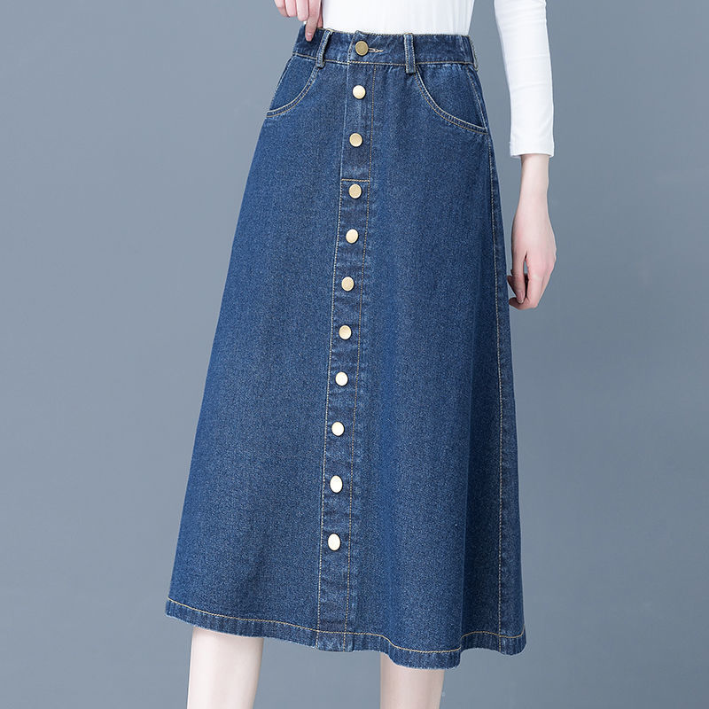 데님 스커트 중간 길이의 단일 브레스트 슬림 모양의 힙합 커버 A 라인 스커트 봄 가을과 여름 새로운 패션 높은 허리 대형 스윙 스커트스토어 가기