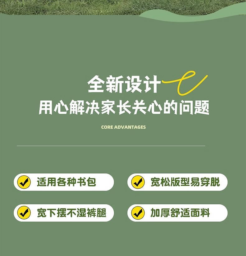 • 초록 공룡: 넉넉한 책가방 수납 공간 + 넓은 챙 모자 + 발까지 덮는 긴 기장