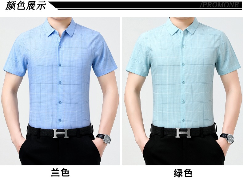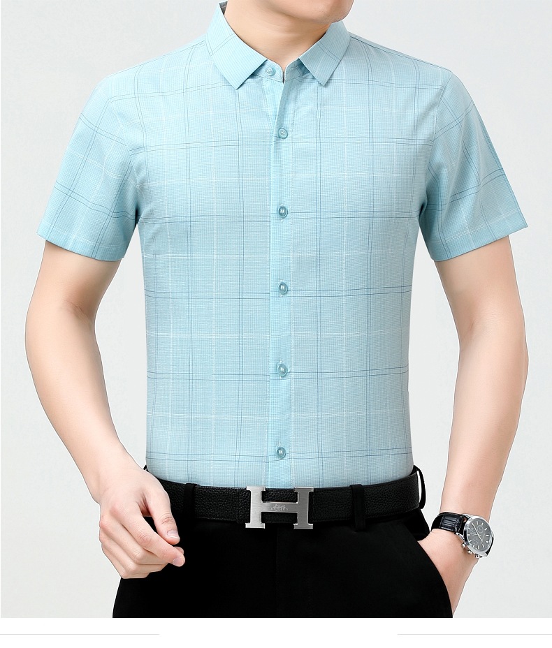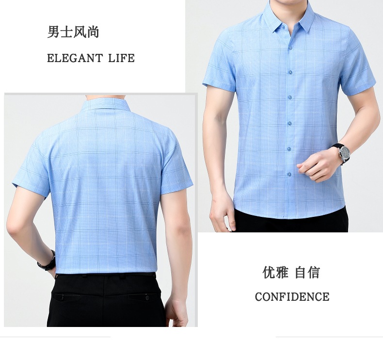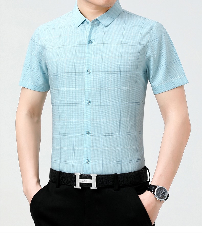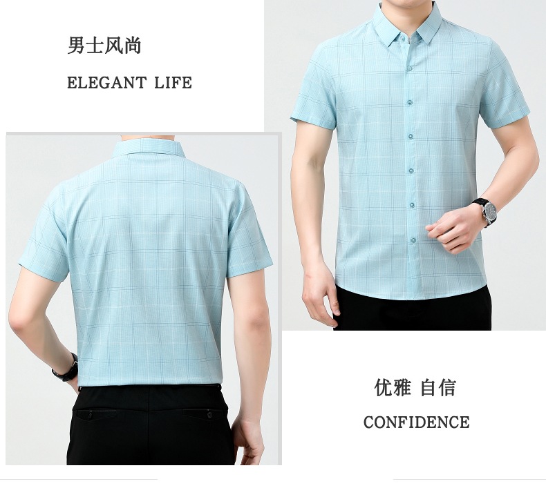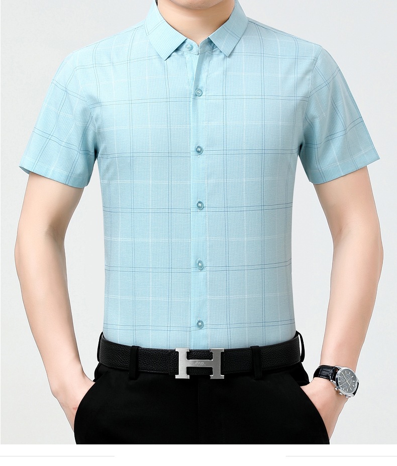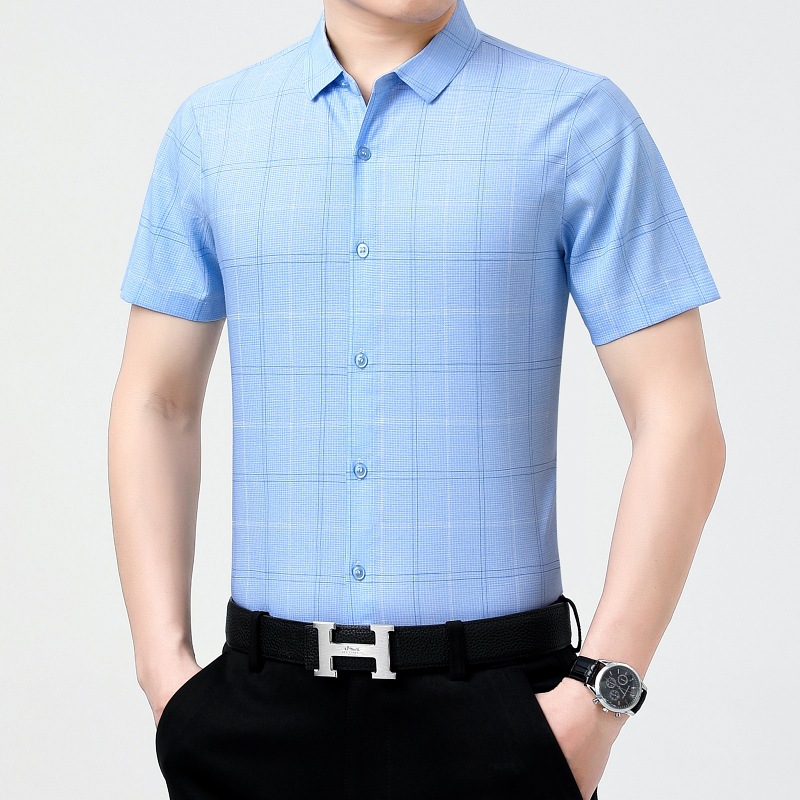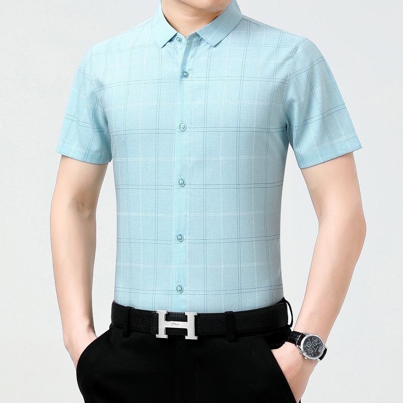 공장 직접 고급 중년 아빠 실크 남성용 체크 무늬 셔츠 사업 비 다림질 주름 셔츠 반소매스토어 가기